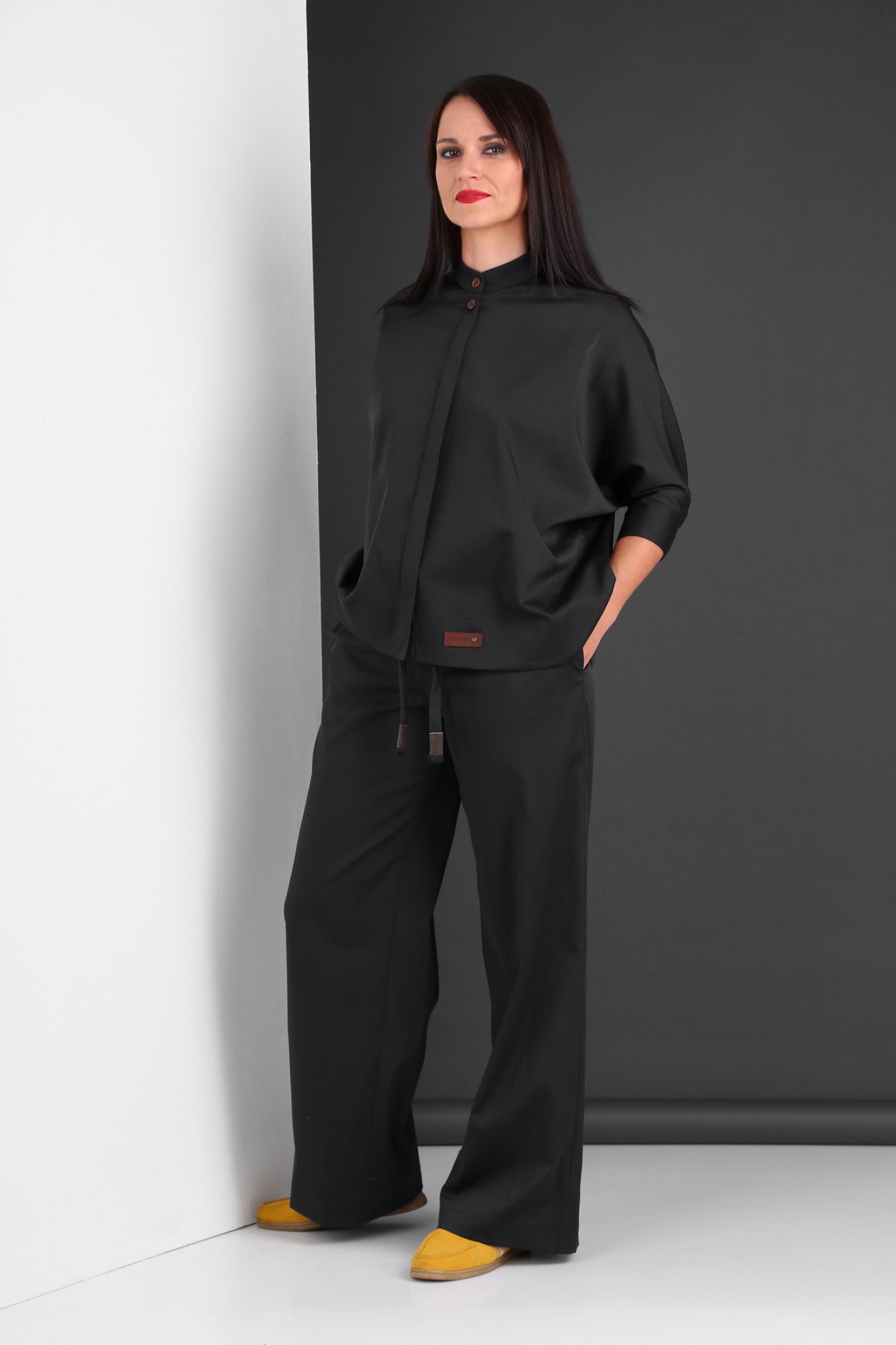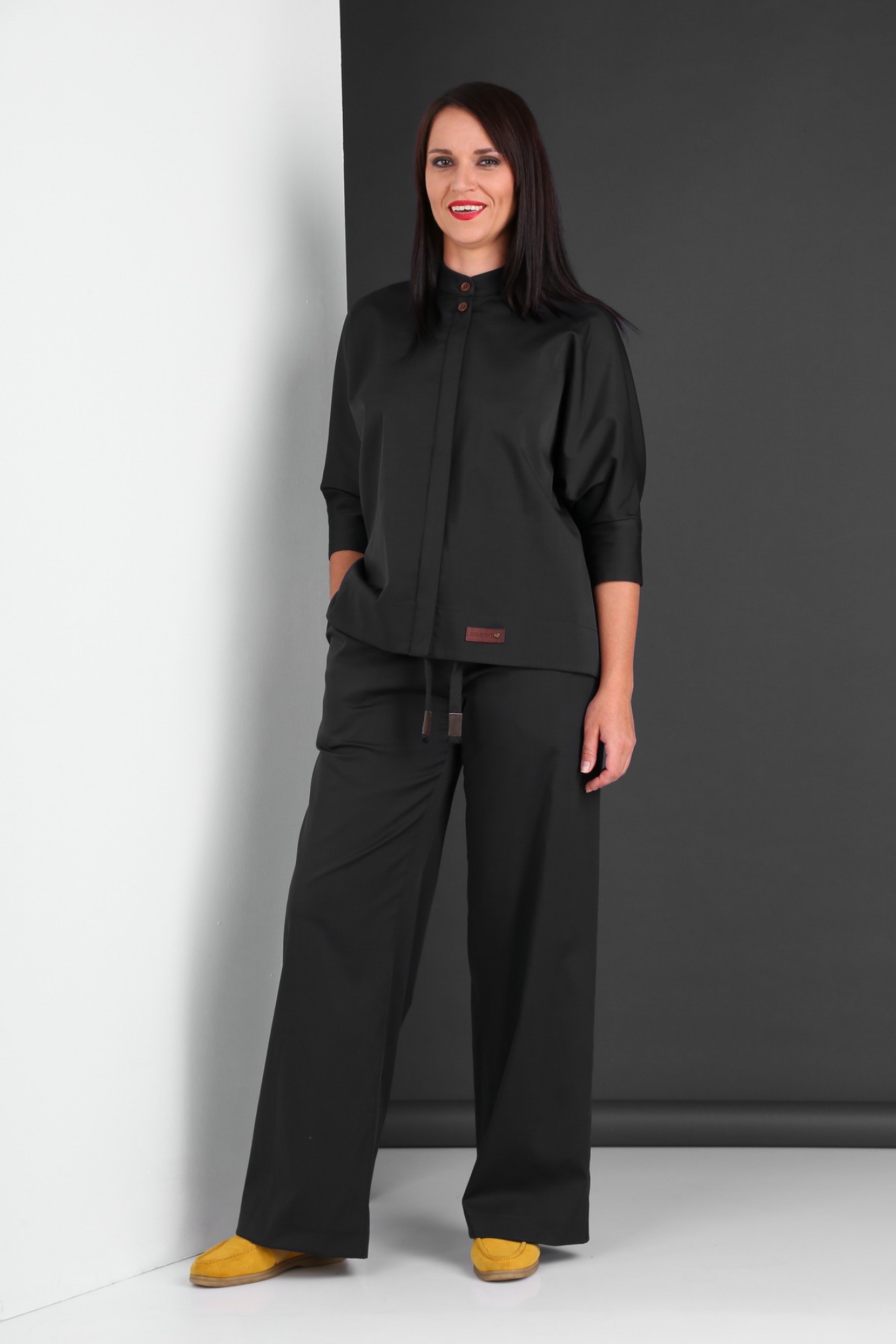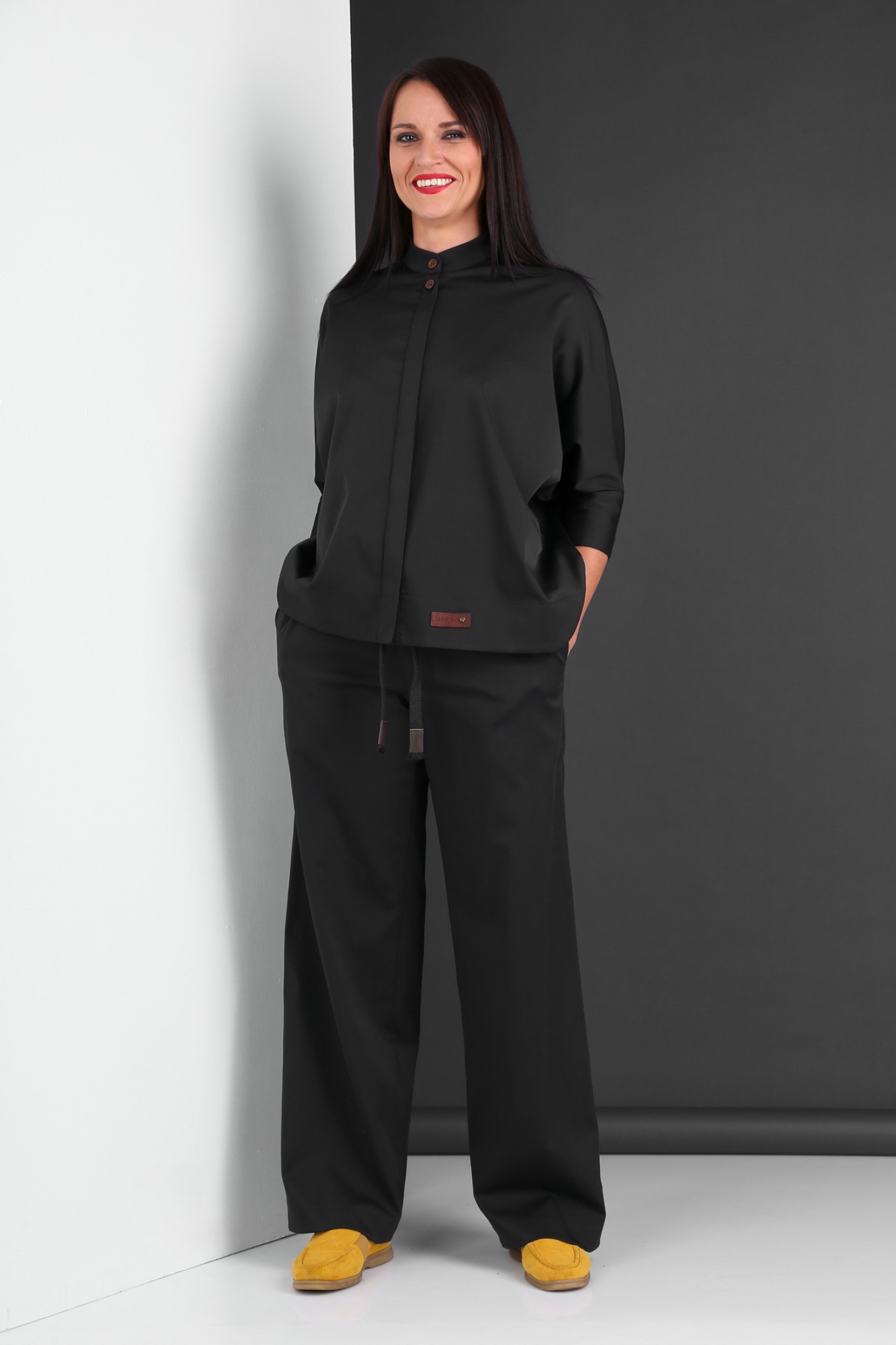 Костюм женский двухпредметный, состоящий из блузы и брюк. Блуза свободного кроя с цельнокроеным рукавом. Полочка с центральной бортовой потайной застежкой на петли-пуговицы. Спинка с поперечной вставкой, декорированной складкой. По низу рукава притачная манжета. Воротник стойка. Брюки прямого силуэта с карманами в отрезных бочках. Притачной пояс с эластичной тесьмой. Дополнительная регулировка обхвата талии с помощью шнура.