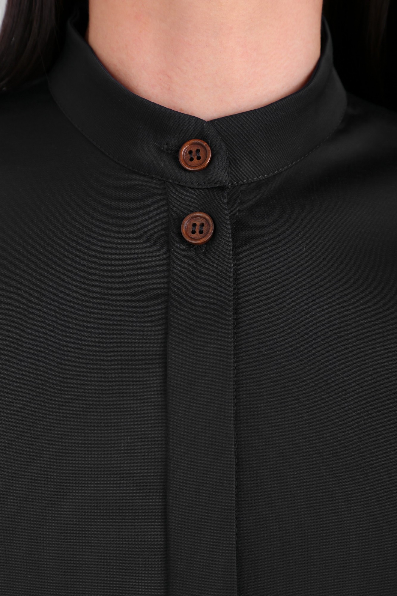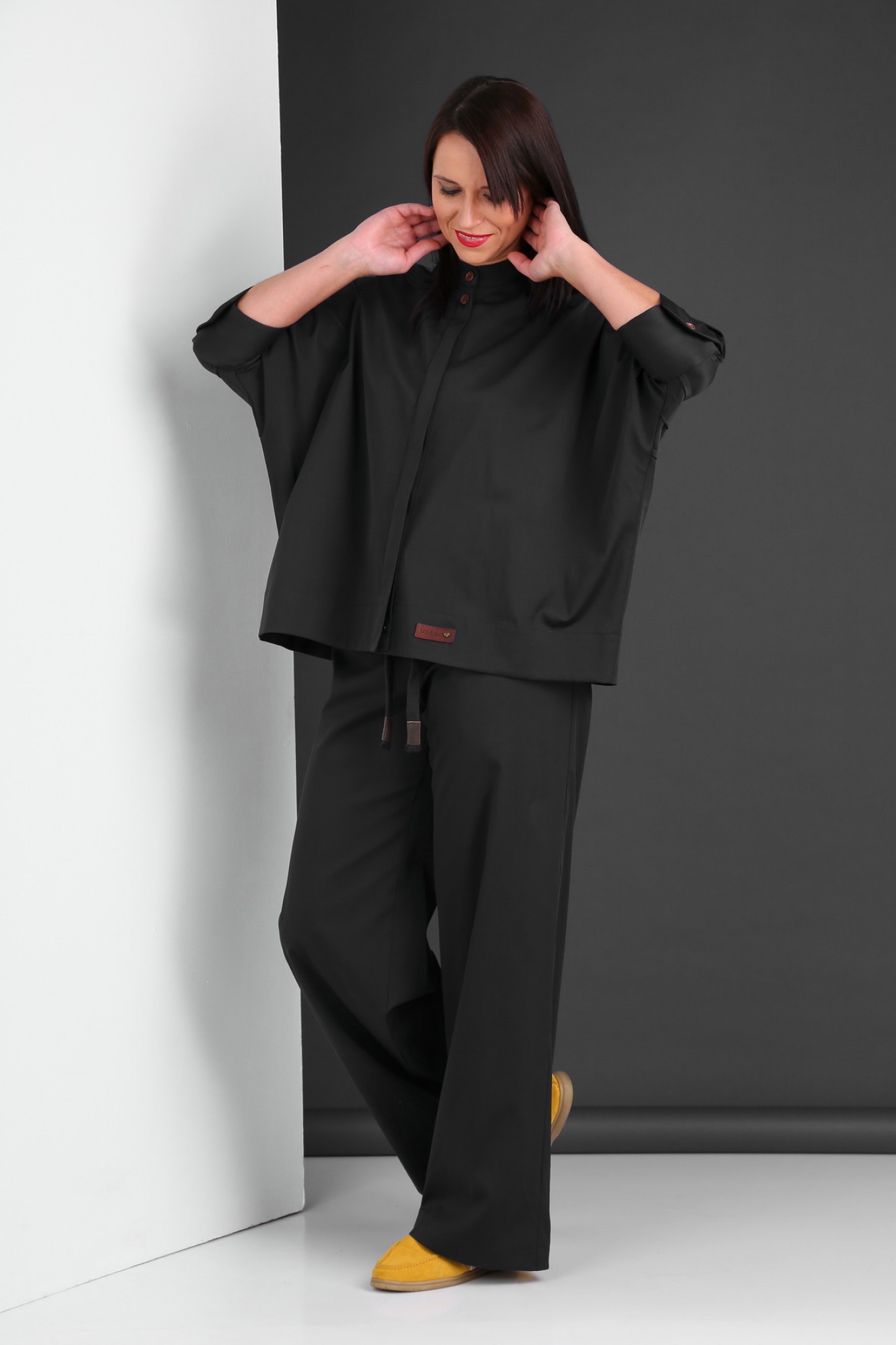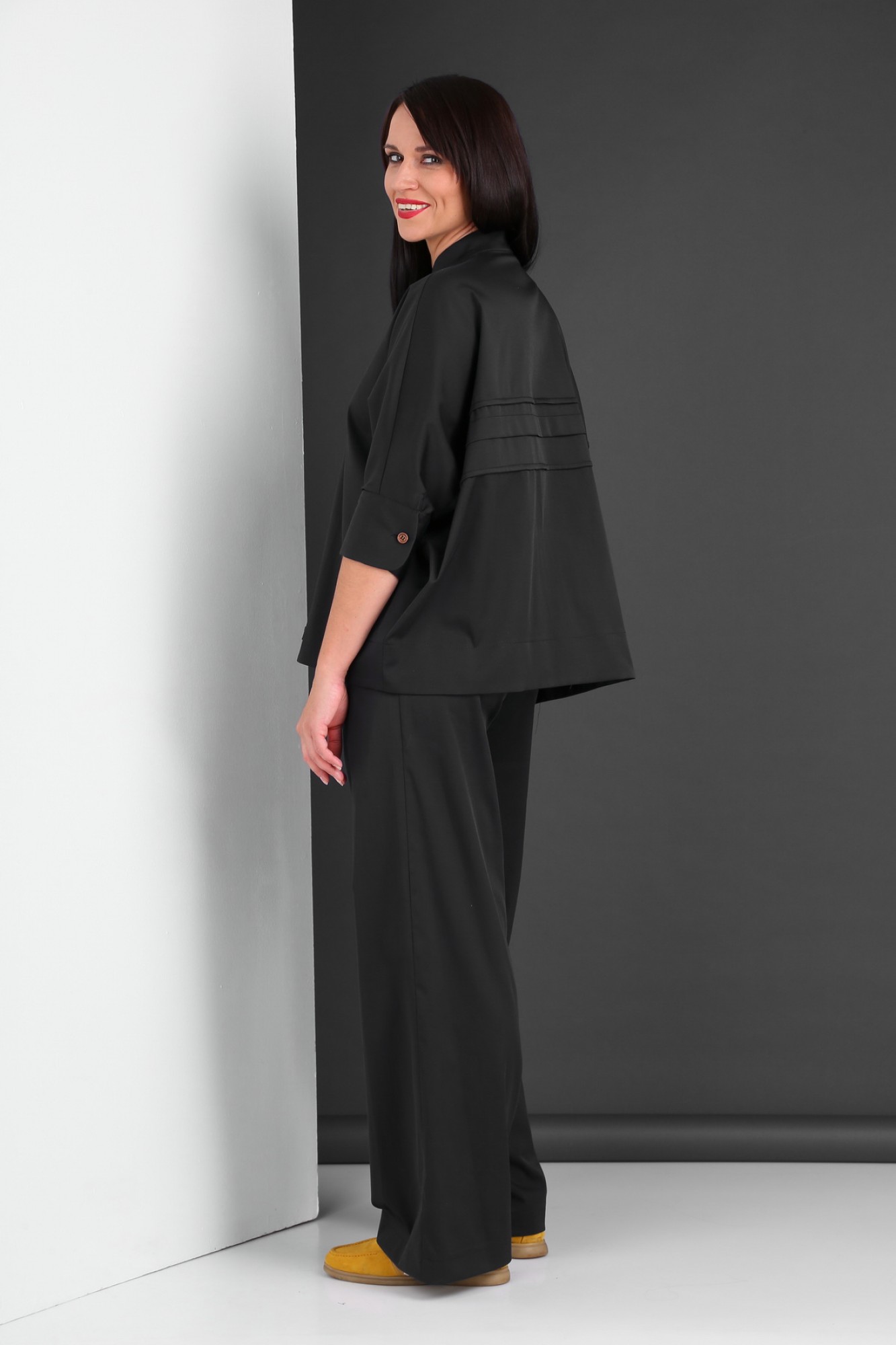 Костюм женский двухпредметный, состоящий из блузы и брюк. Блуза свободного кроя с цельнокроеным рукавом. Полочка с центральной бортовой потайной застежкой на петли-пуговицы. Спинка с поперечной вставкой, декорированной складкой. По низу рукава притачная манжета. Воротник стойка. Брюки прямого силуэта с карманами в отрезных бочках. Притачной пояс с эластичной тесьмой. Дополнительная регулировка обхвата талии с помощью шнура.