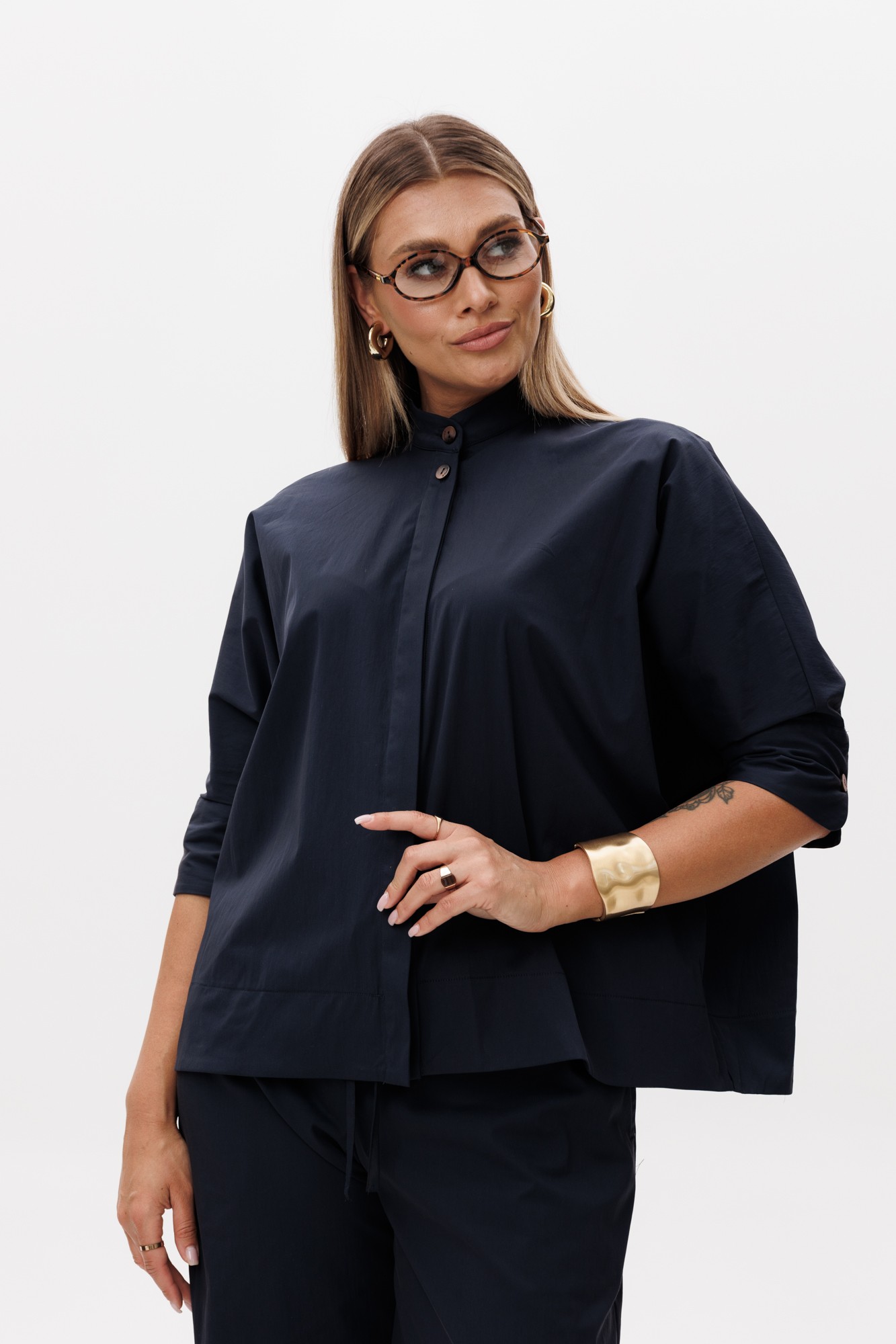 Костюм женский двухпредметный, состоящий из блузы и брюк. Блуза свободного кроя с цельнокроеным рукавом. Полочка с центральной бортовой потайной застежкой на петли-пуговицы. Спинка с поперечной вставкой, декорированной складкой. По низу рукава притачная манжета. Воротник стойка. Брюки прямого силуэта с карманами в отрезных бочках. Притачной пояс с эластичной тесьмой. Дополнительная регулировка обхвата талии с помощью шнура.