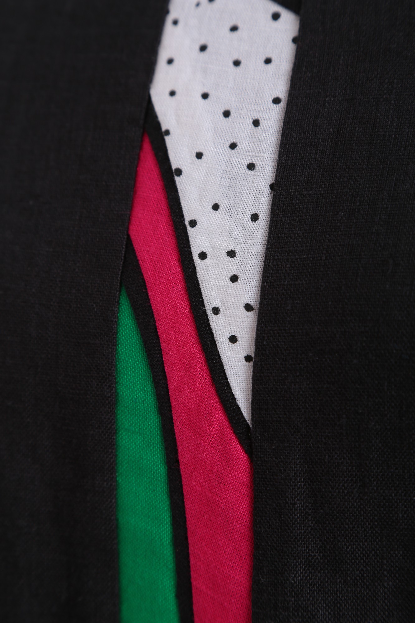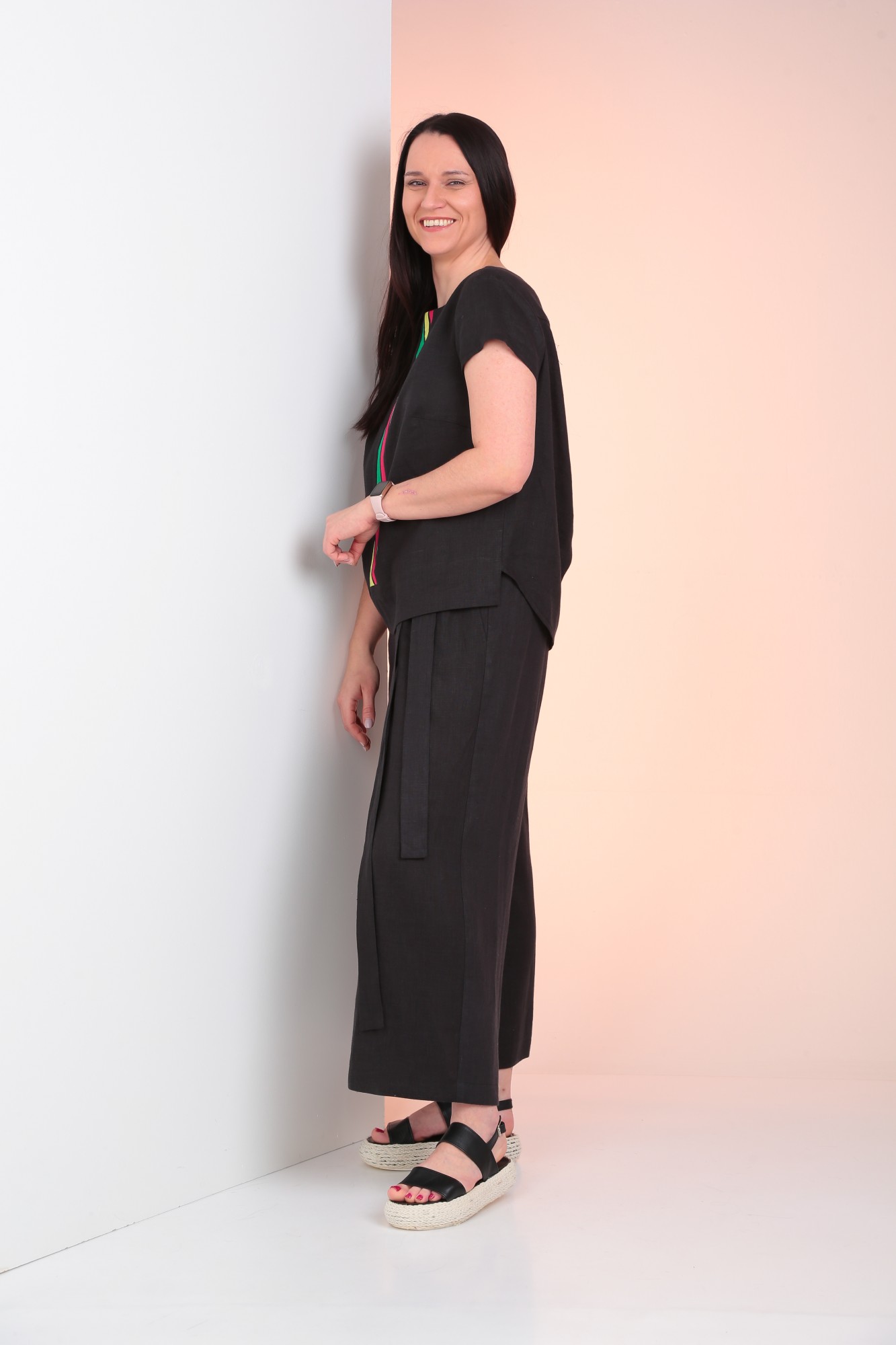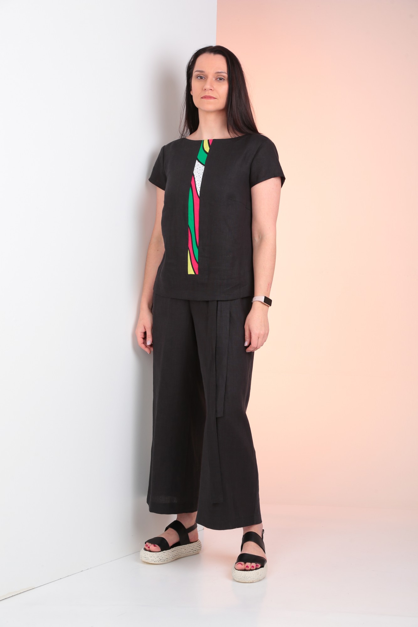 Комплект двухпредметный, состоит из блузы и кюлотов. Блуза свободного кроя, с коротким рукавом. По переду декоративная вставка. Кюлоты без застежки, верхний срез обработан поясом, который регулируется по ширине поясом. В боковых швах карманы.