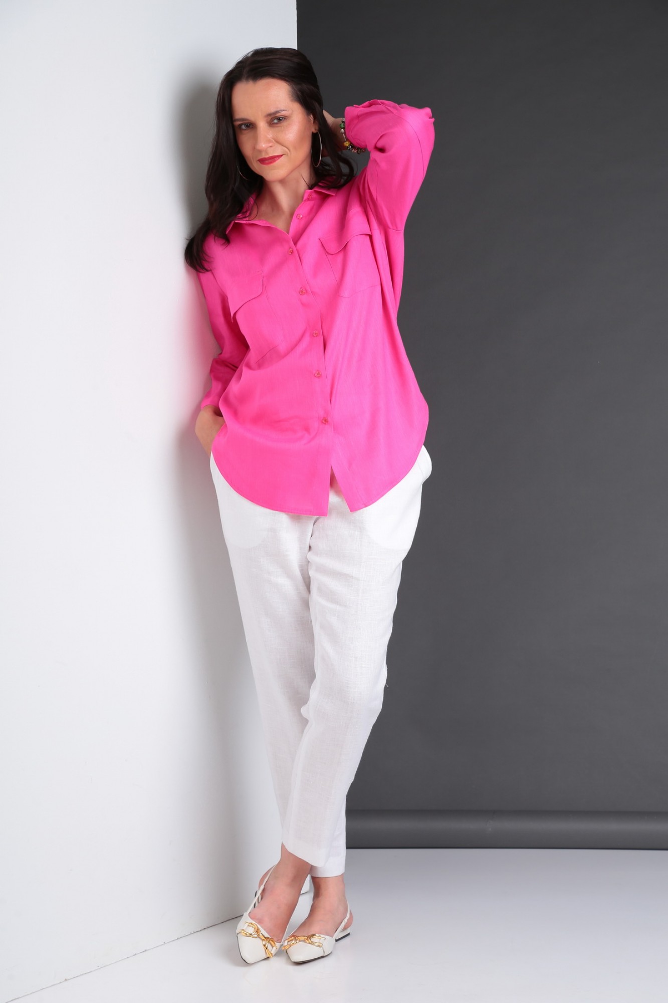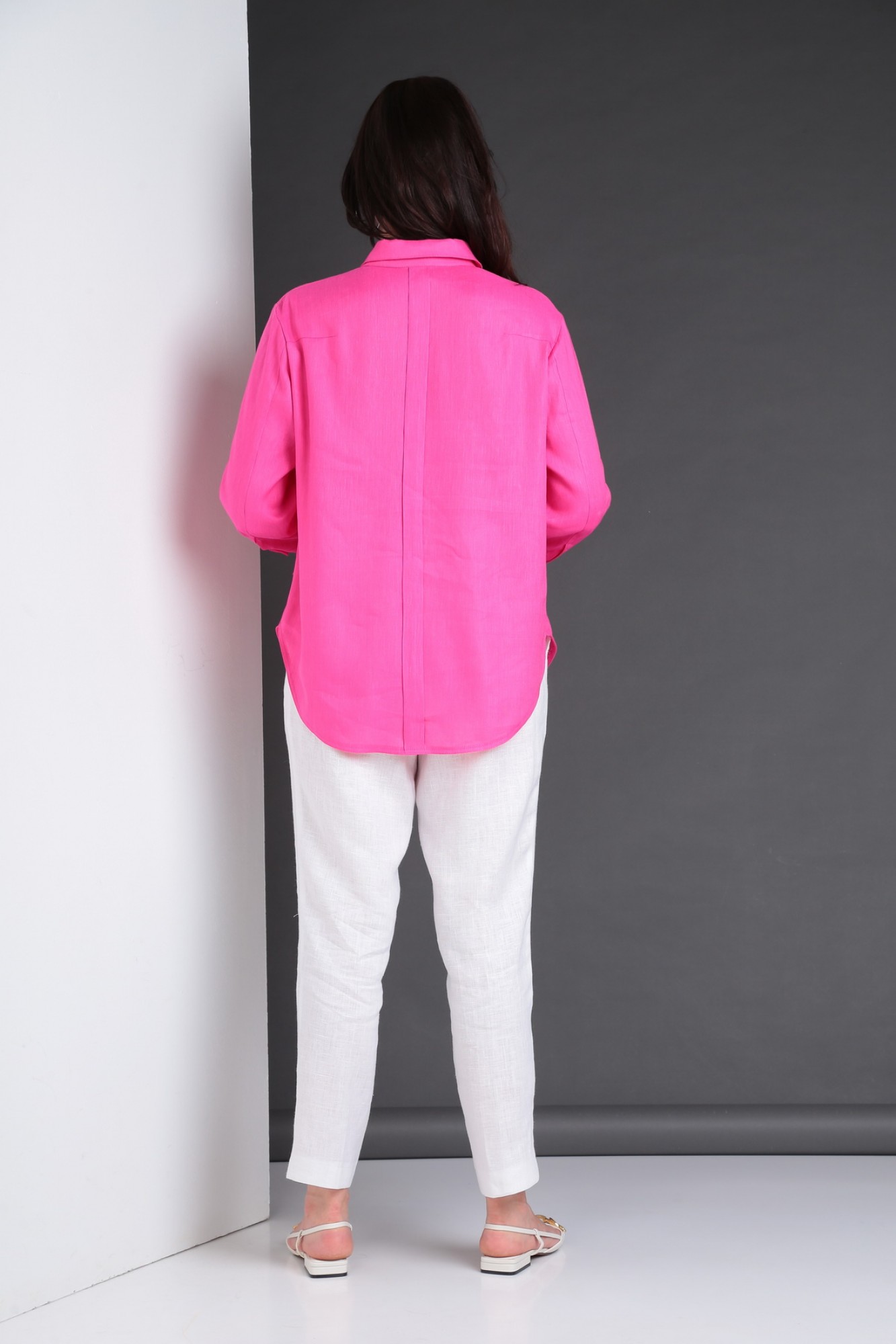 Комплект двухпредметный, состоит из рубашки и брюк. Рубашка свободного кроя с рукавом 3/4 и притачным воротником на стойке. По переду накладные карманы с клапанами, центральная застежка на петли-пуговицы. По центру спинки застроченная бантовая складка. Брюки свободные, зауженные к низа. Застежка гульфик на молнии. По линии талии притачной пояс с эластичной тесьмой по задней части. В боковых швах карманы в отрезном бочке.