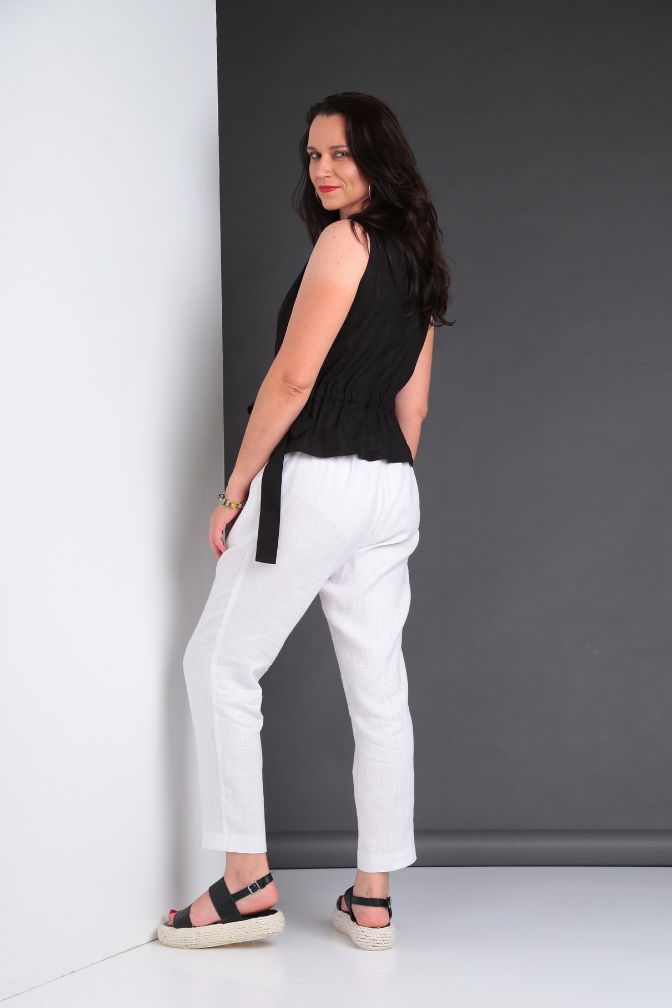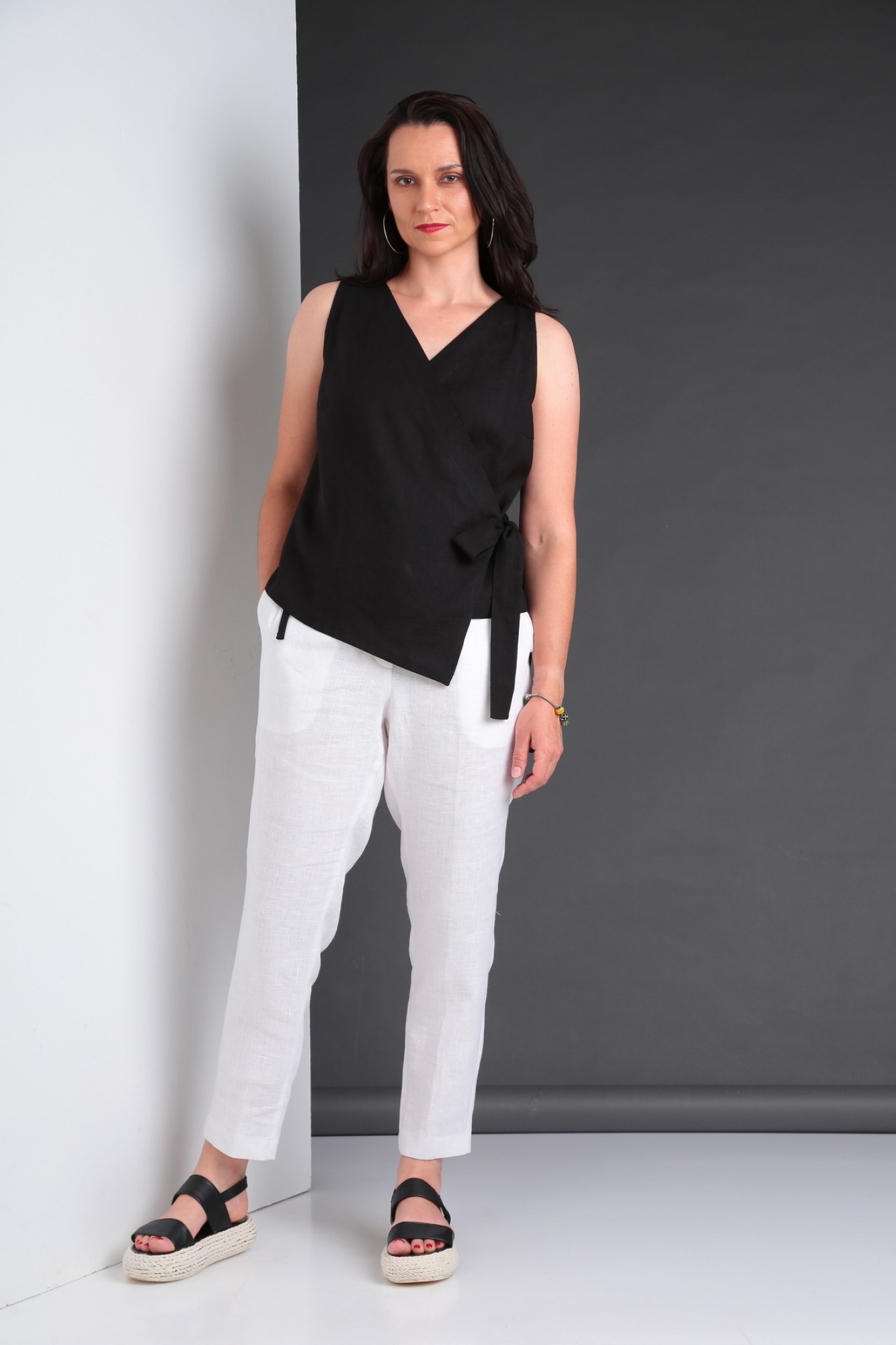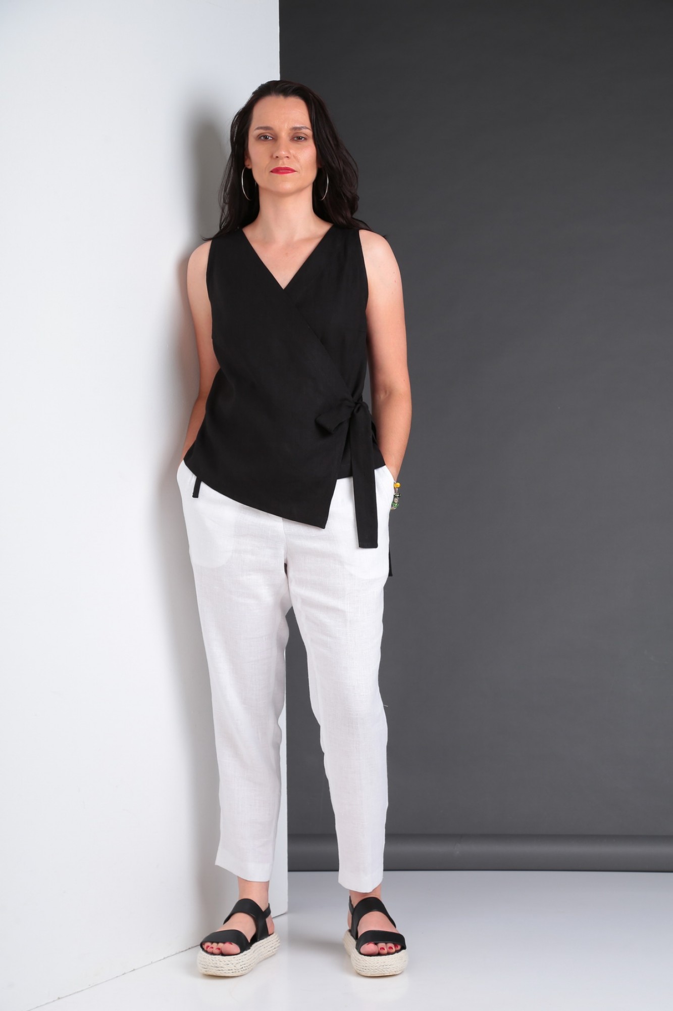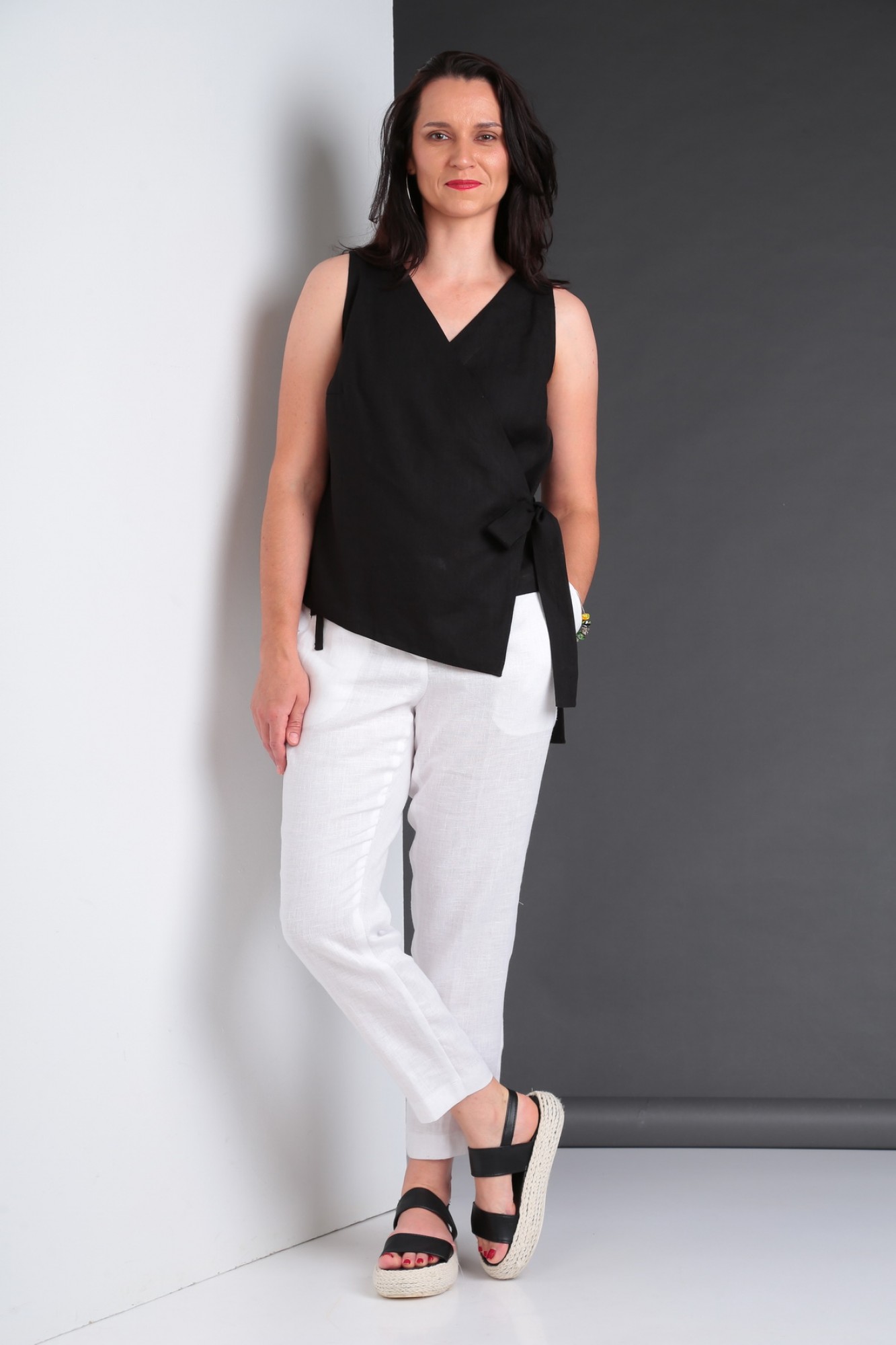 Костюм двухпредметный, состоит из жилета и брюк. Жилет прямого силуэта с запахом по переду. По спинке на линии талии кулиса. Брюки свободные, зауженные к низа. Застежка гульфик на молнии. По линии талии притачной пояс с эластичной тесьмой по задней части. В боковых швах карманы в отрезном бочке.