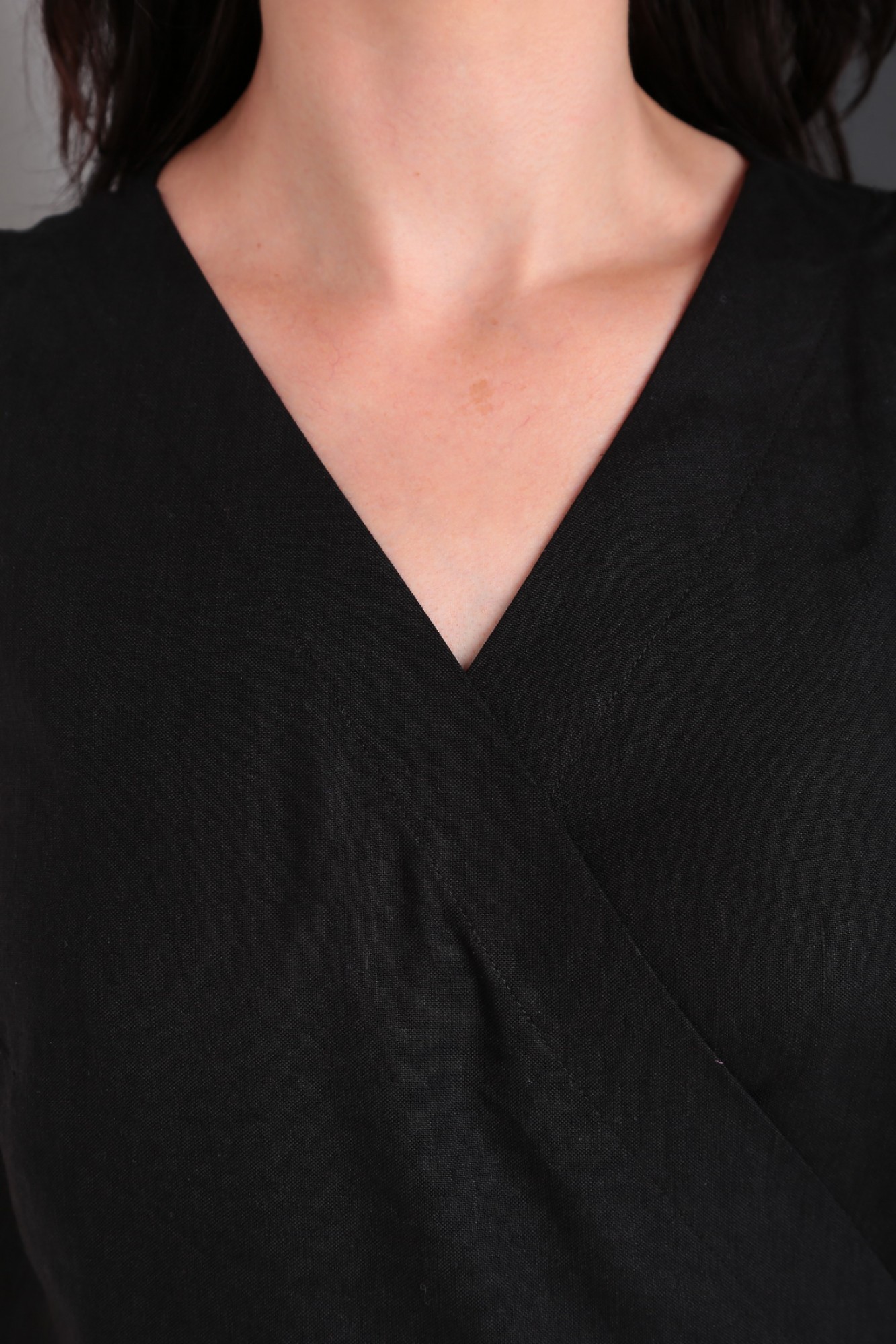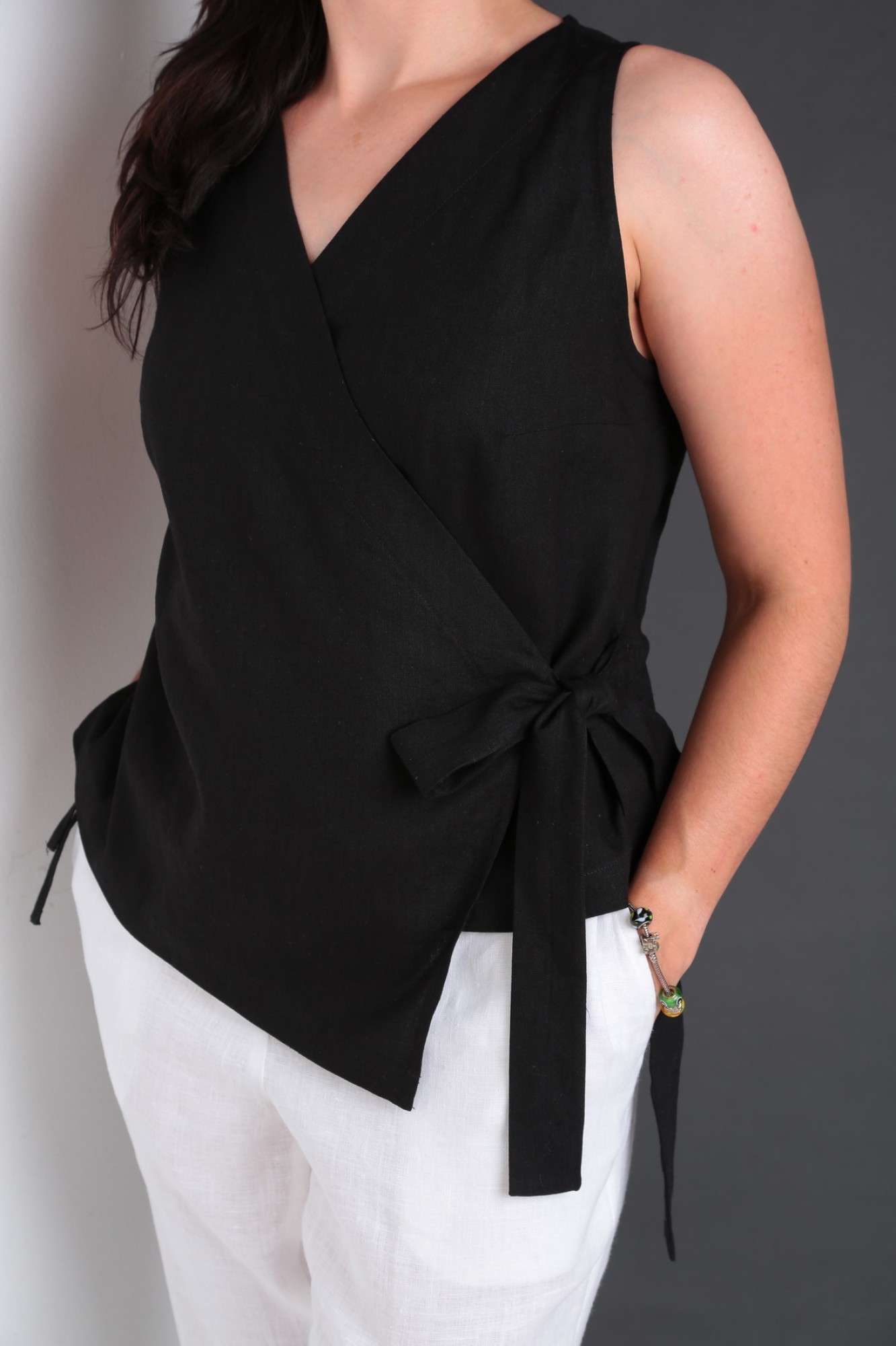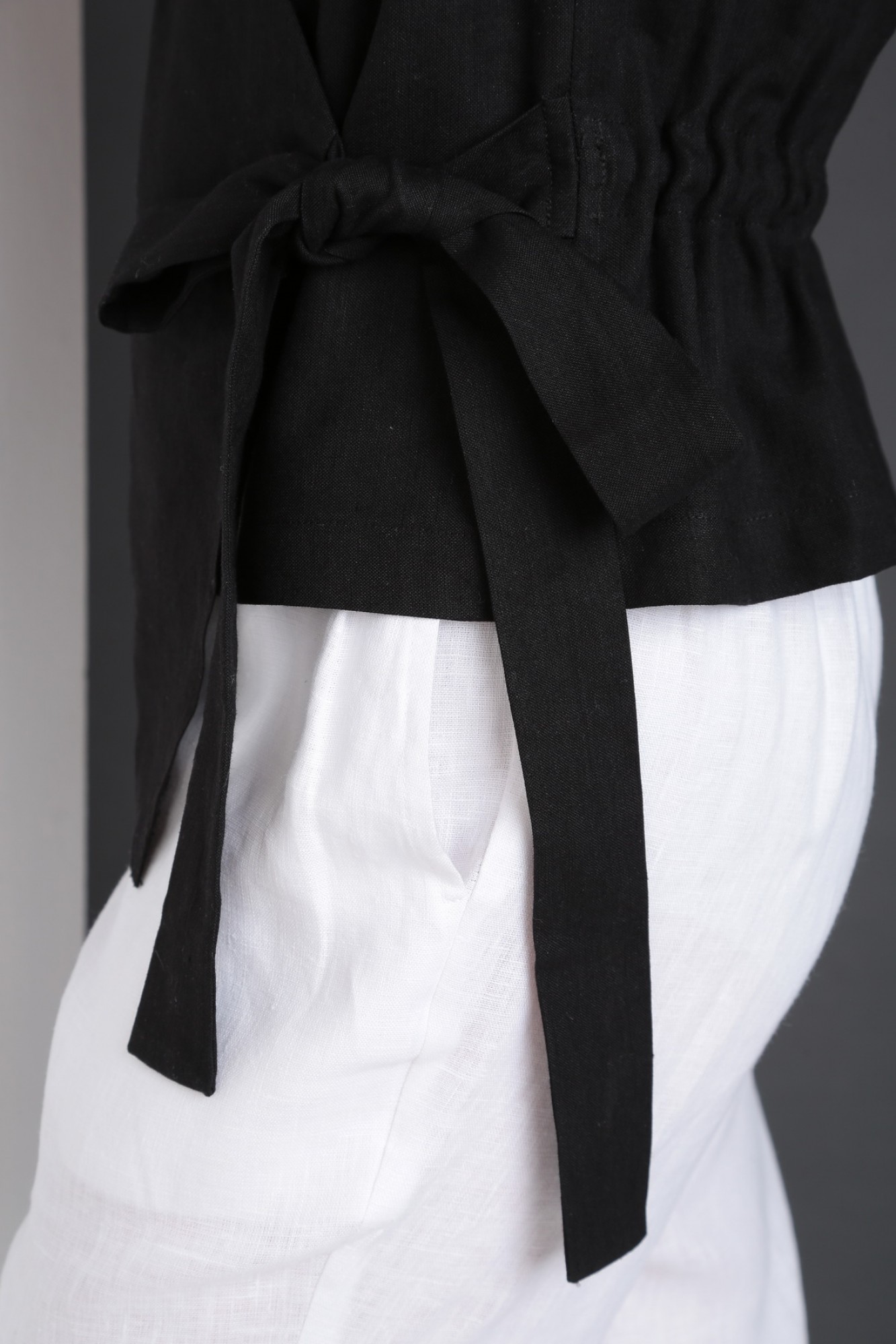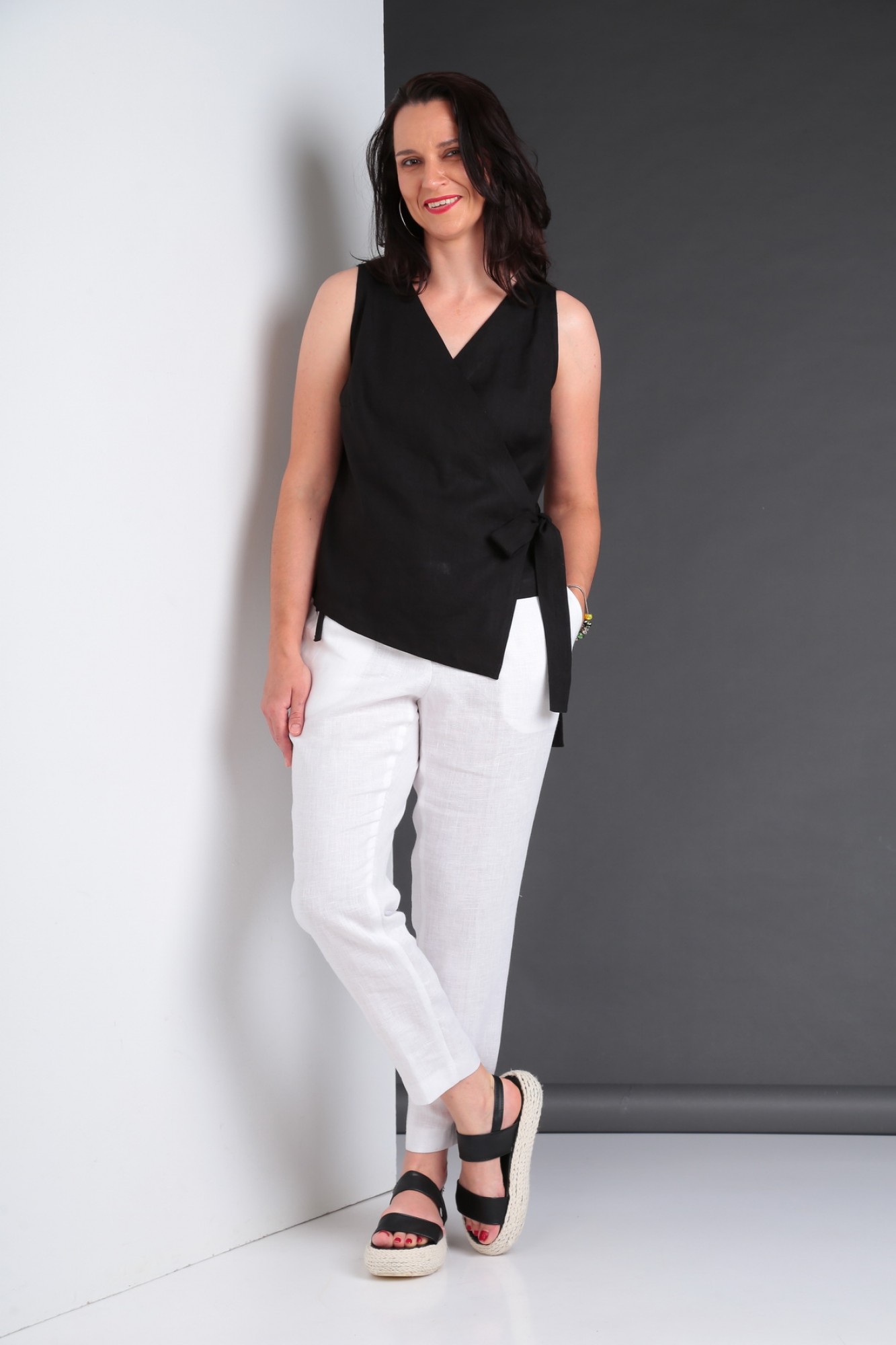 Костюм двухпредметный, состоит из жилета и брюк. Жилет прямого силуэта с запахом по переду. По спинке на линии талии кулиса. Брюки свободные, зауженные к низа. Застежка гульфик на молнии. По линии талии притачной пояс с эластичной тесьмой по задней части. В боковых швах карманы в отрезном бочке.
