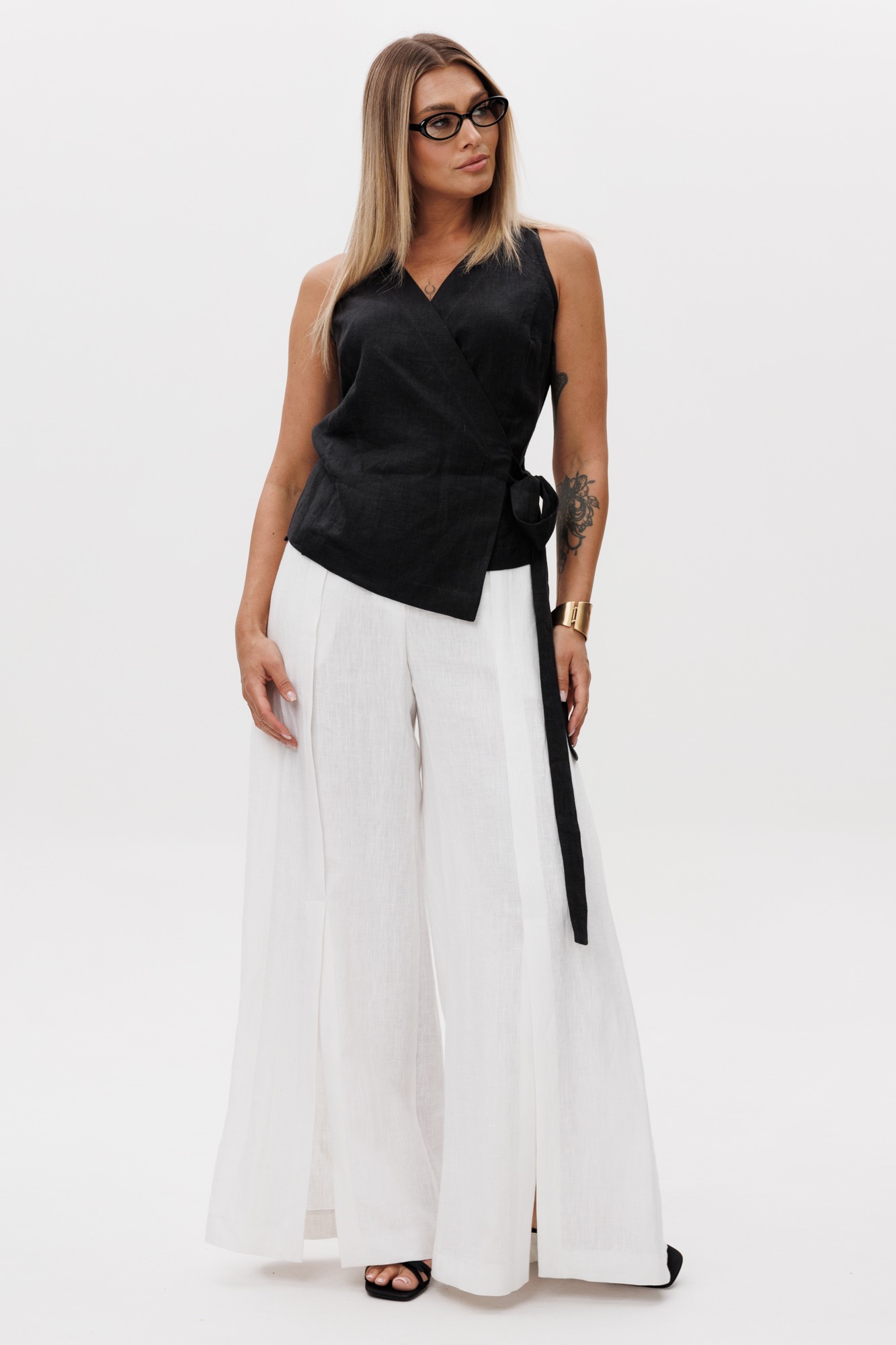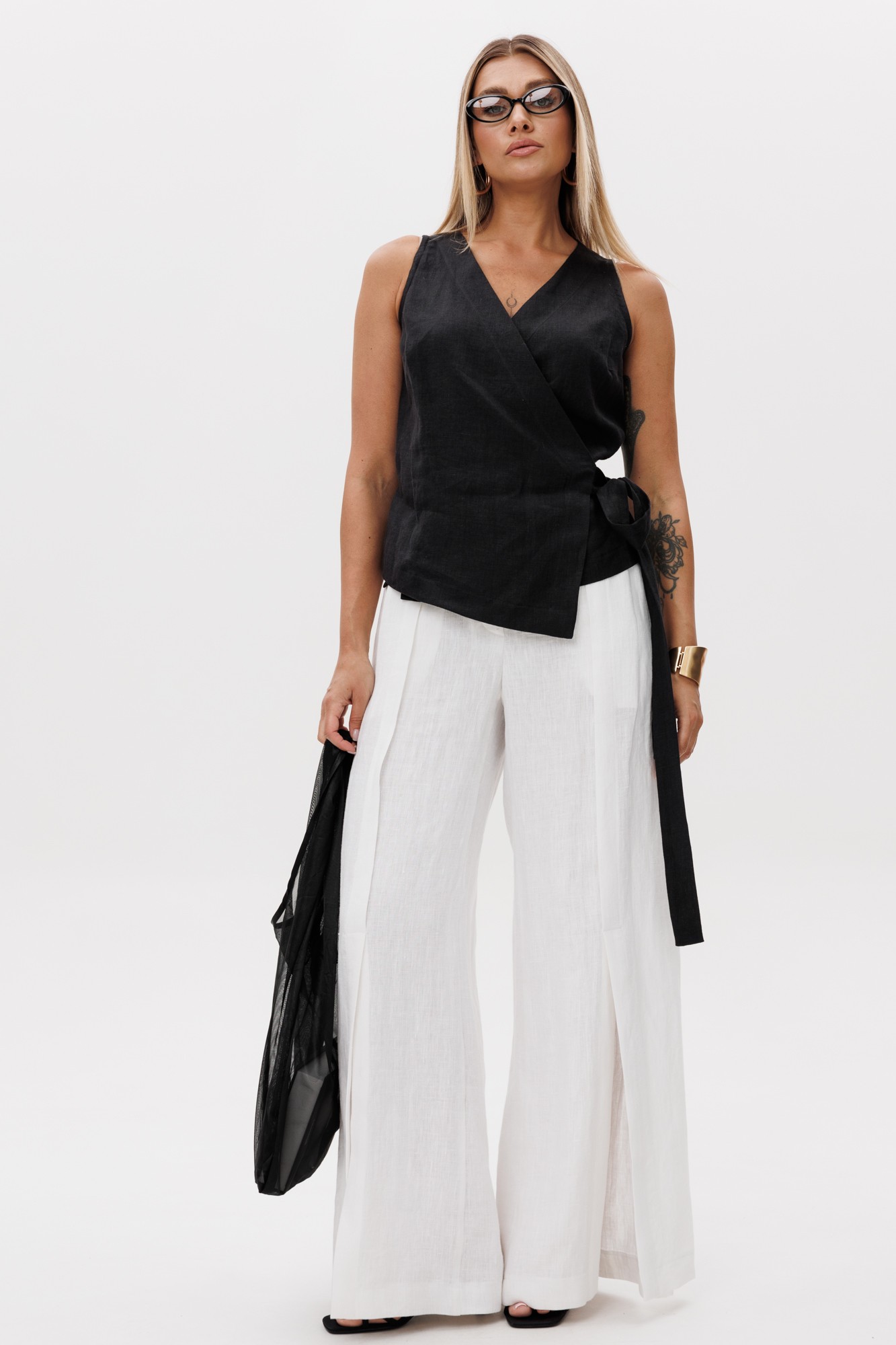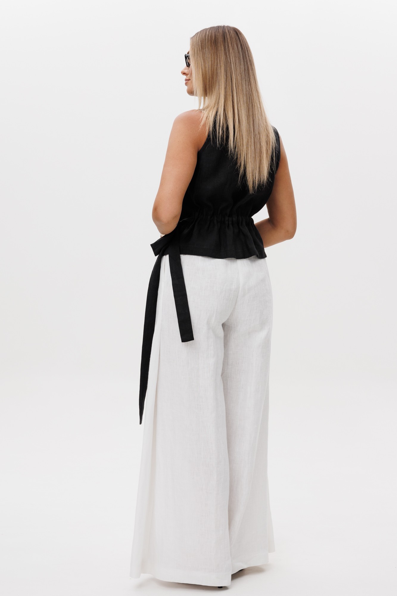 Комплект двухпредметный состоит из жилета и брюк. Жилет приталенного силуэта с запахом по переду. Брюки прямого силуэта с боковыми карманами и шлицами по переду. По боковым швам ниже уровня кармана глубокая складка. По линии талии ширина регулируется по спинке с помощью резинки.