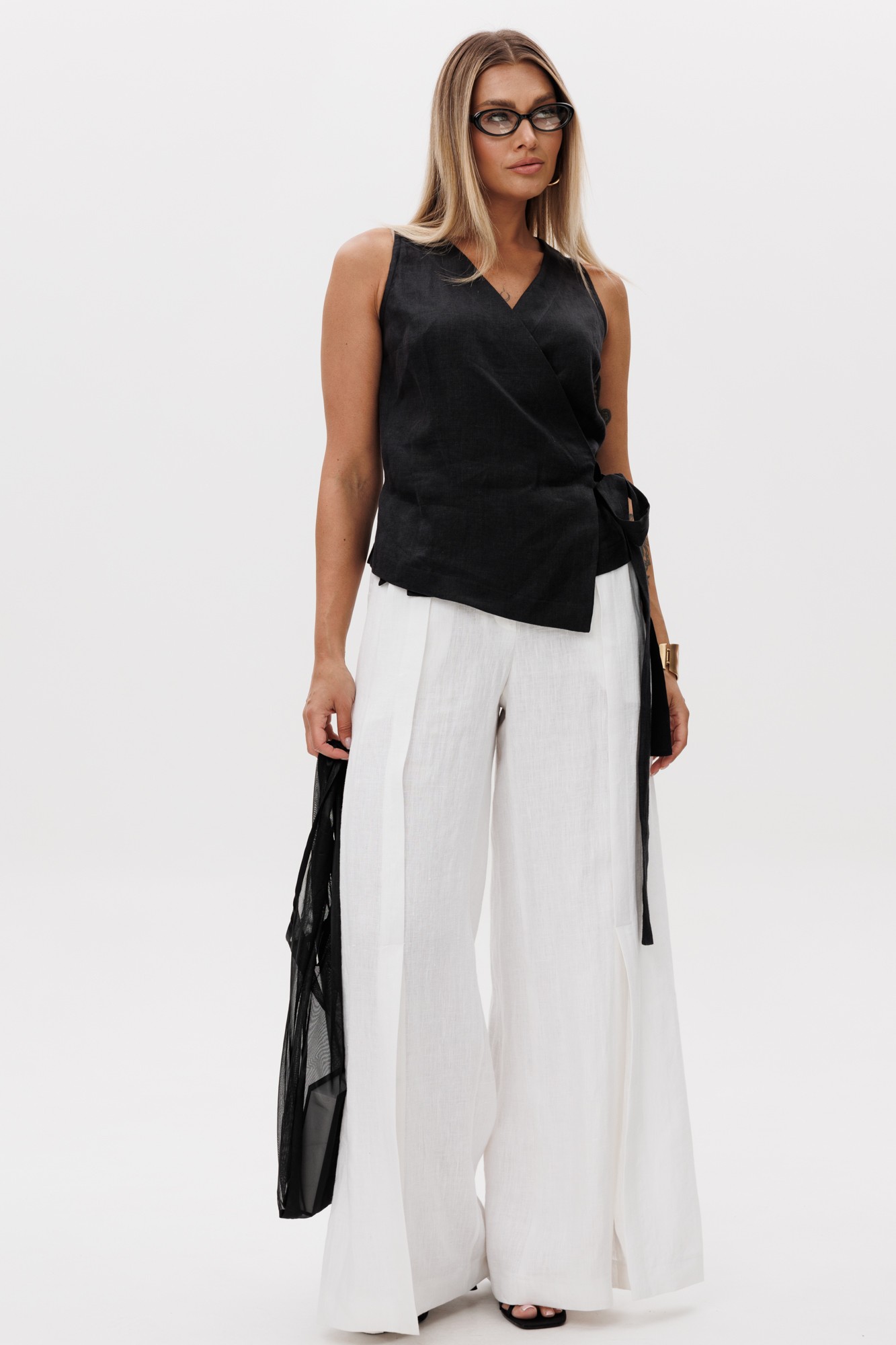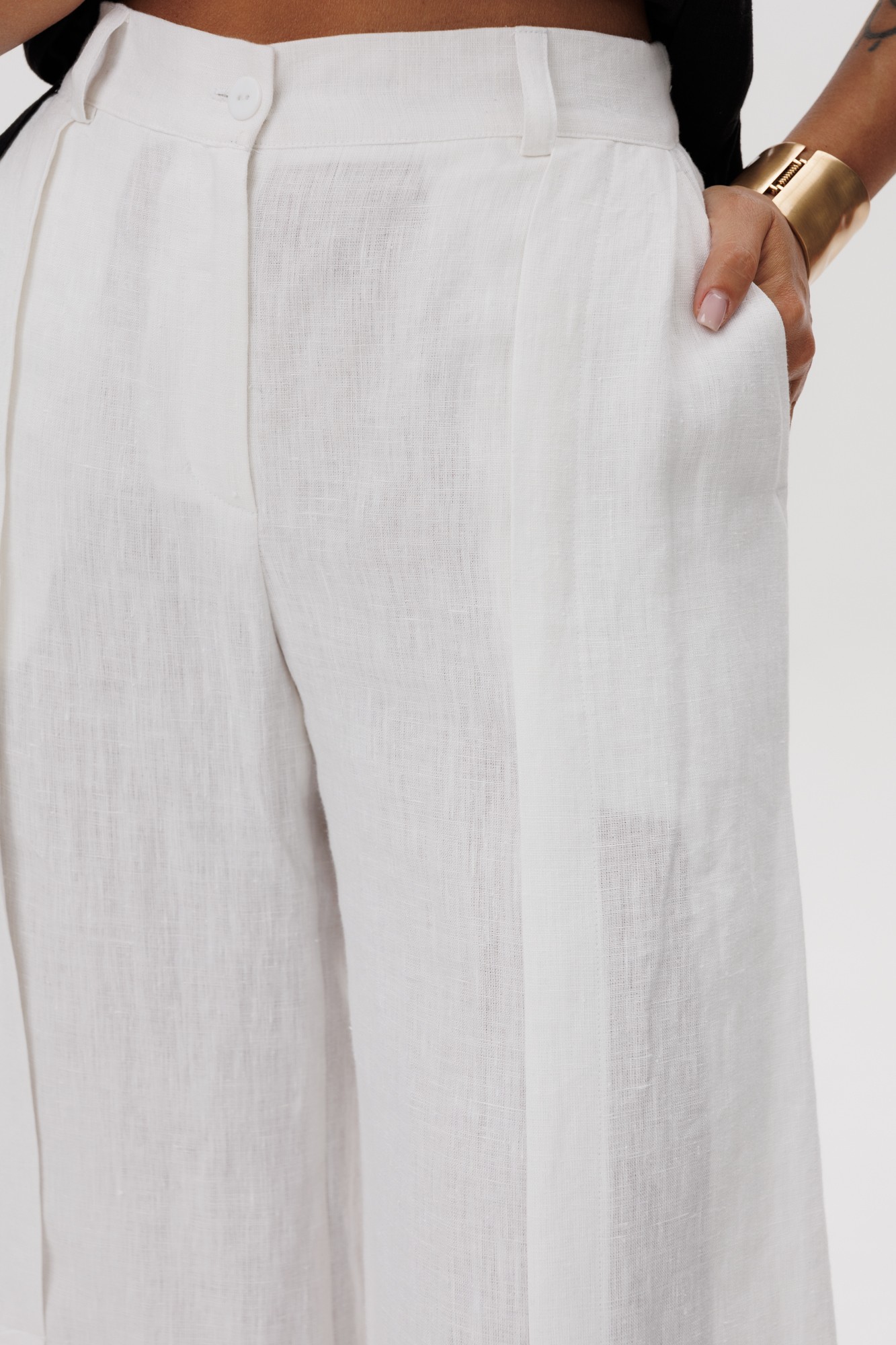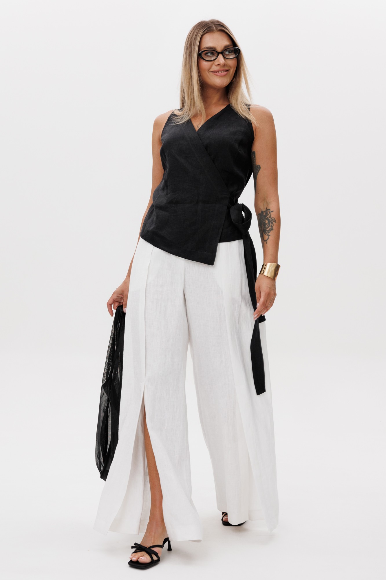 Комплект двухпредметный состоит из жилета и брюк. Жилет приталенного силуэта с запахом по переду. Брюки прямого силуэта с боковыми карманами и шлицами по переду. По боковым швам ниже уровня кармана глубокая складка. По линии талии ширина регулируется по спинке с помощью резинки.