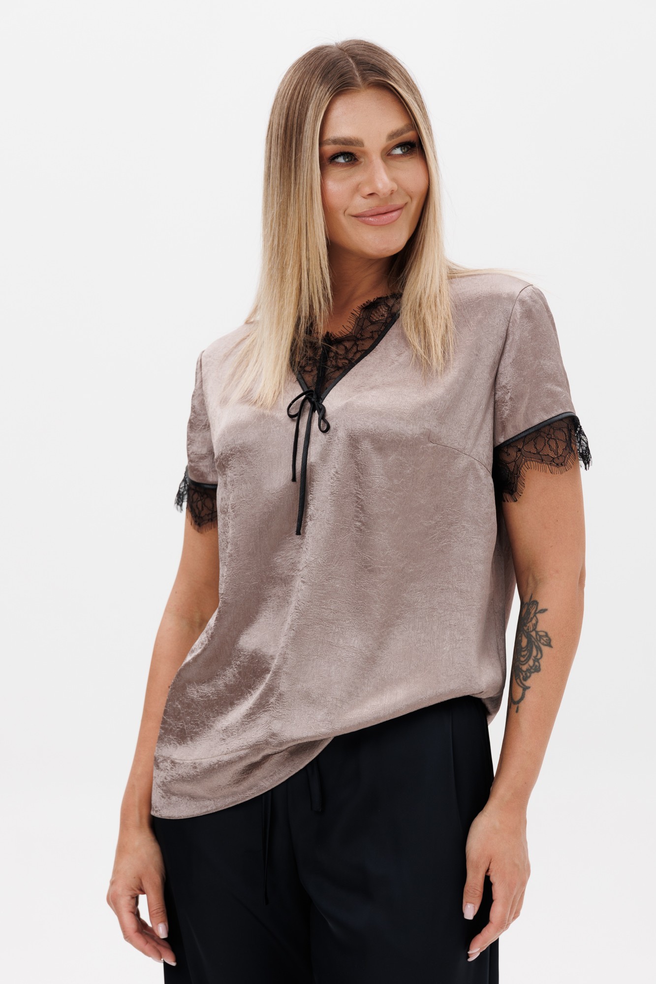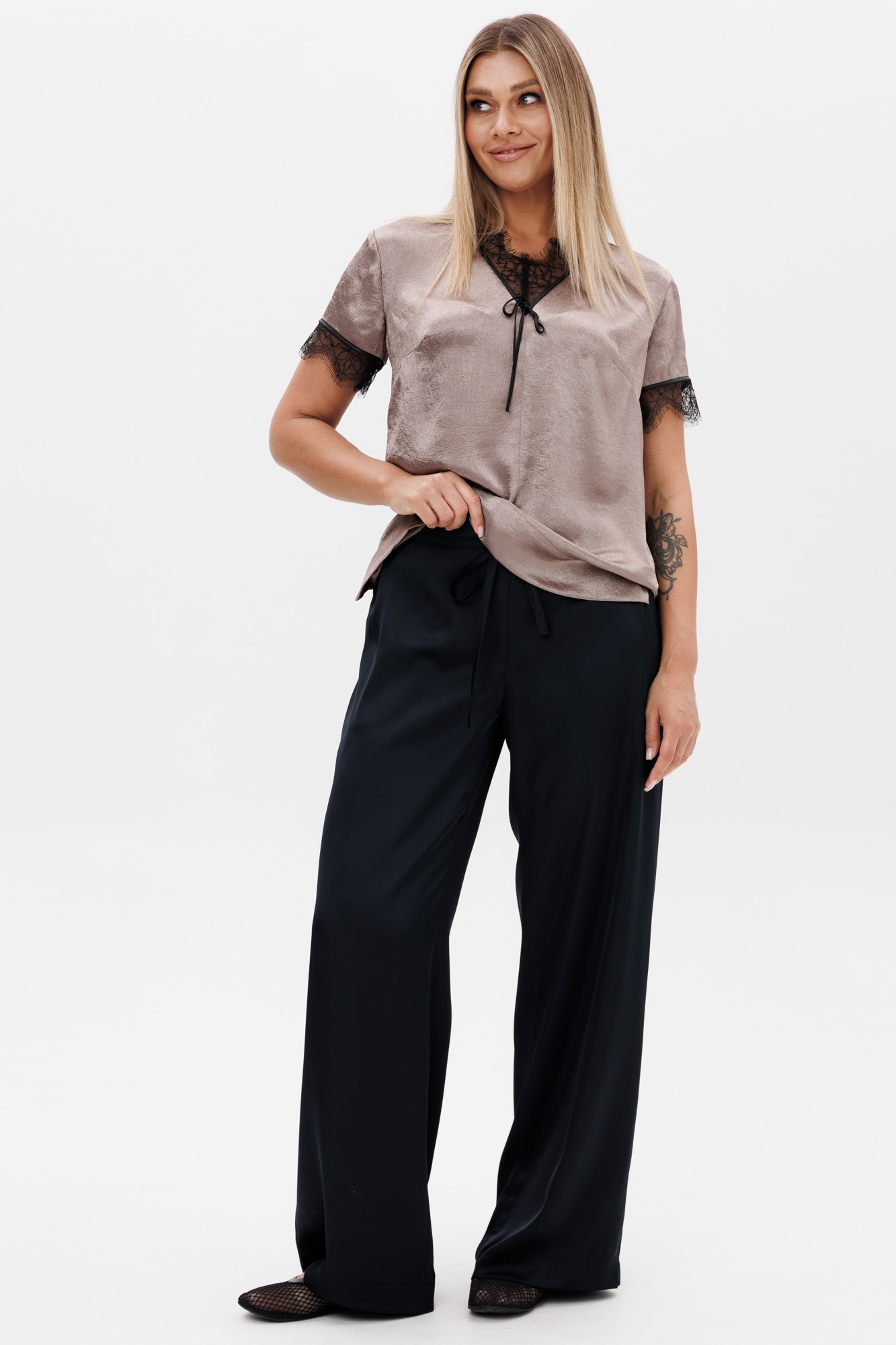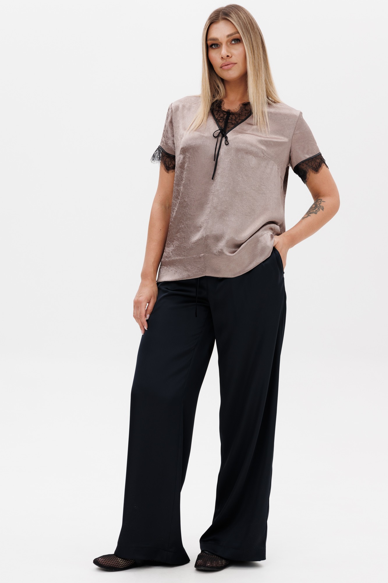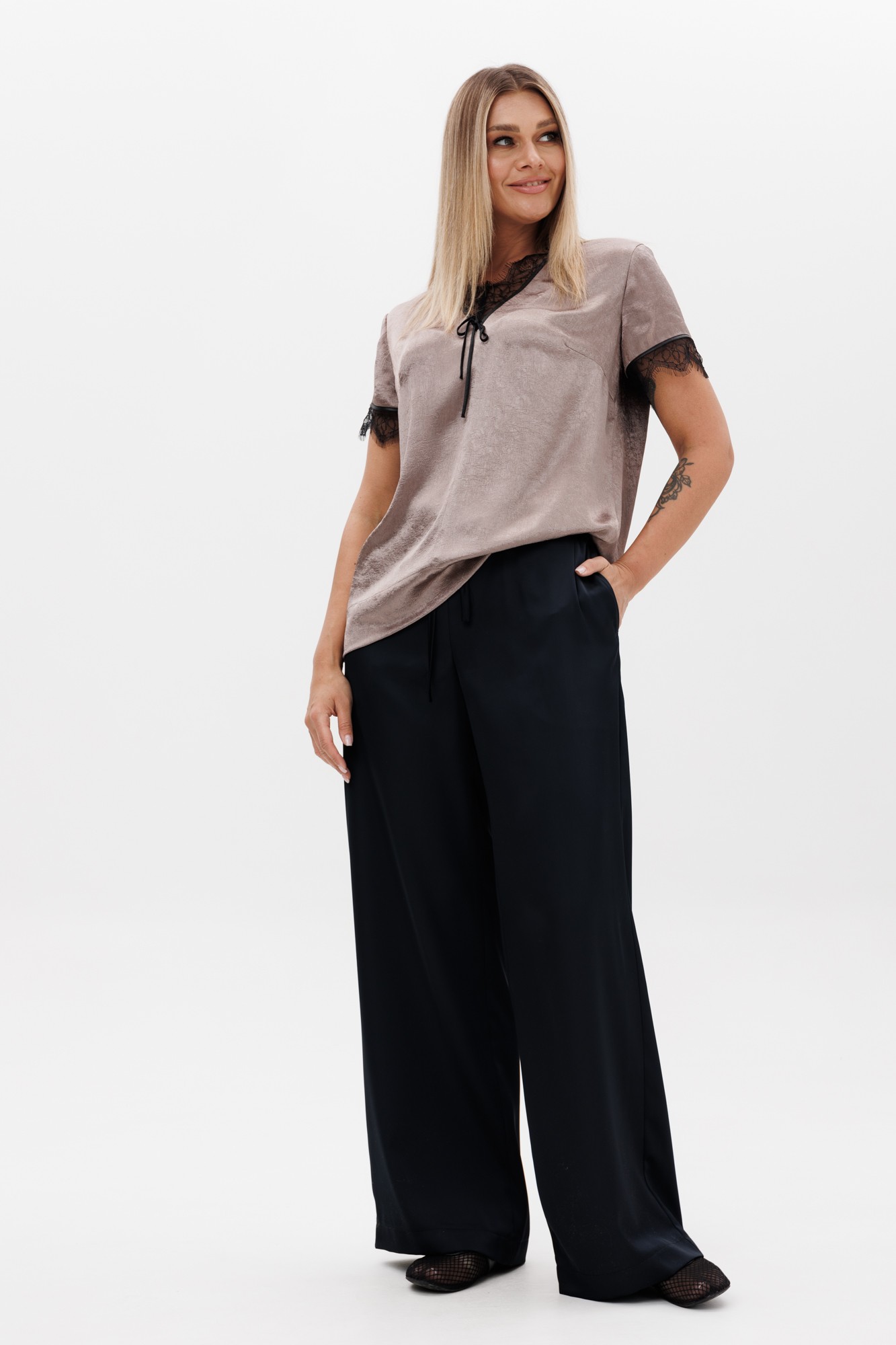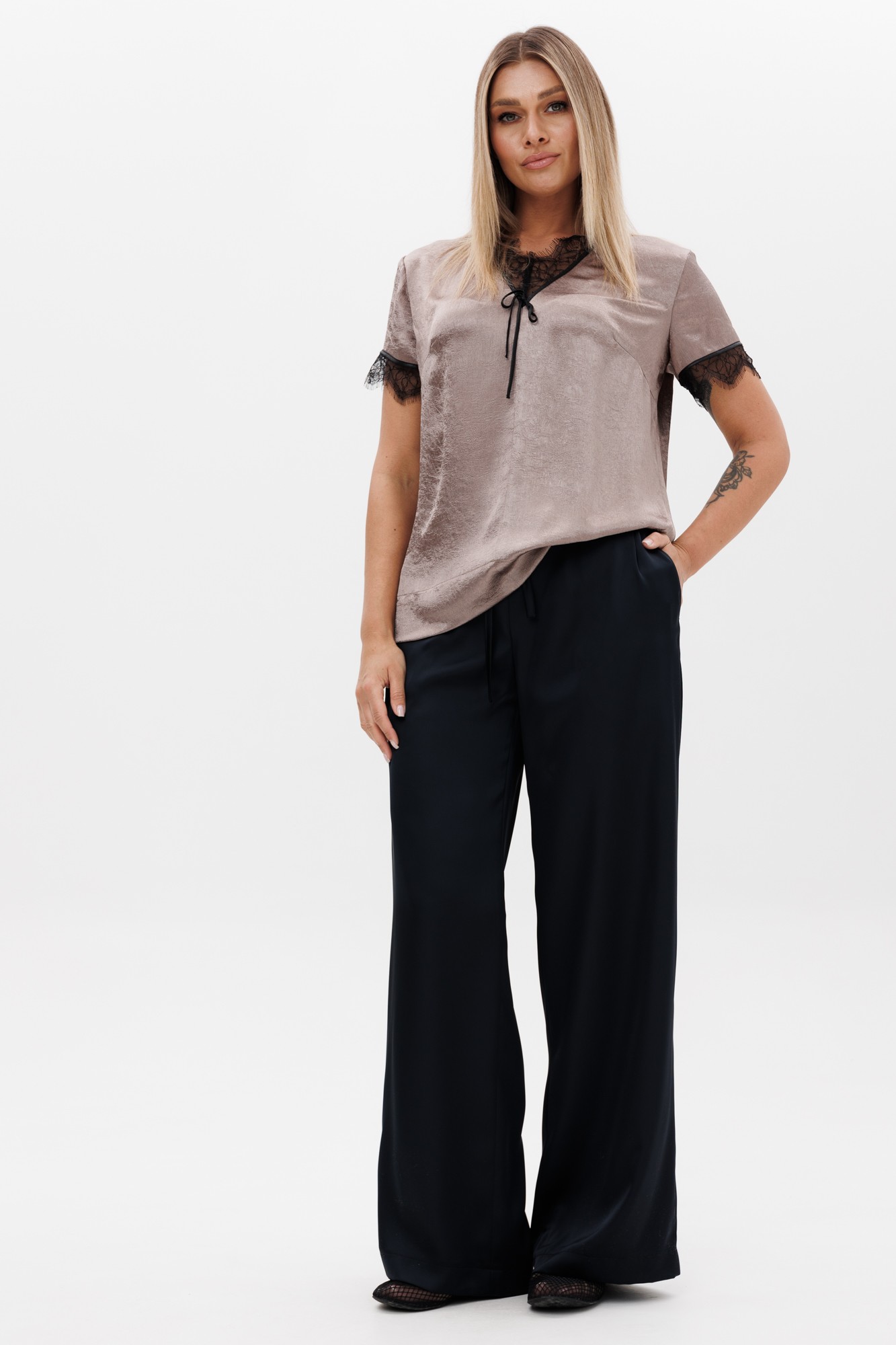 Комплект двухпредметный, состоит из блузы и брюк. Блуза прямого силуэта с коротким рукавом . По горловине и низу рукава декоративная кружевная отделка. Брюки прямого силуэта без застежки. По боковым швам карманы. Пояс регулируется резинкой и шнуром.