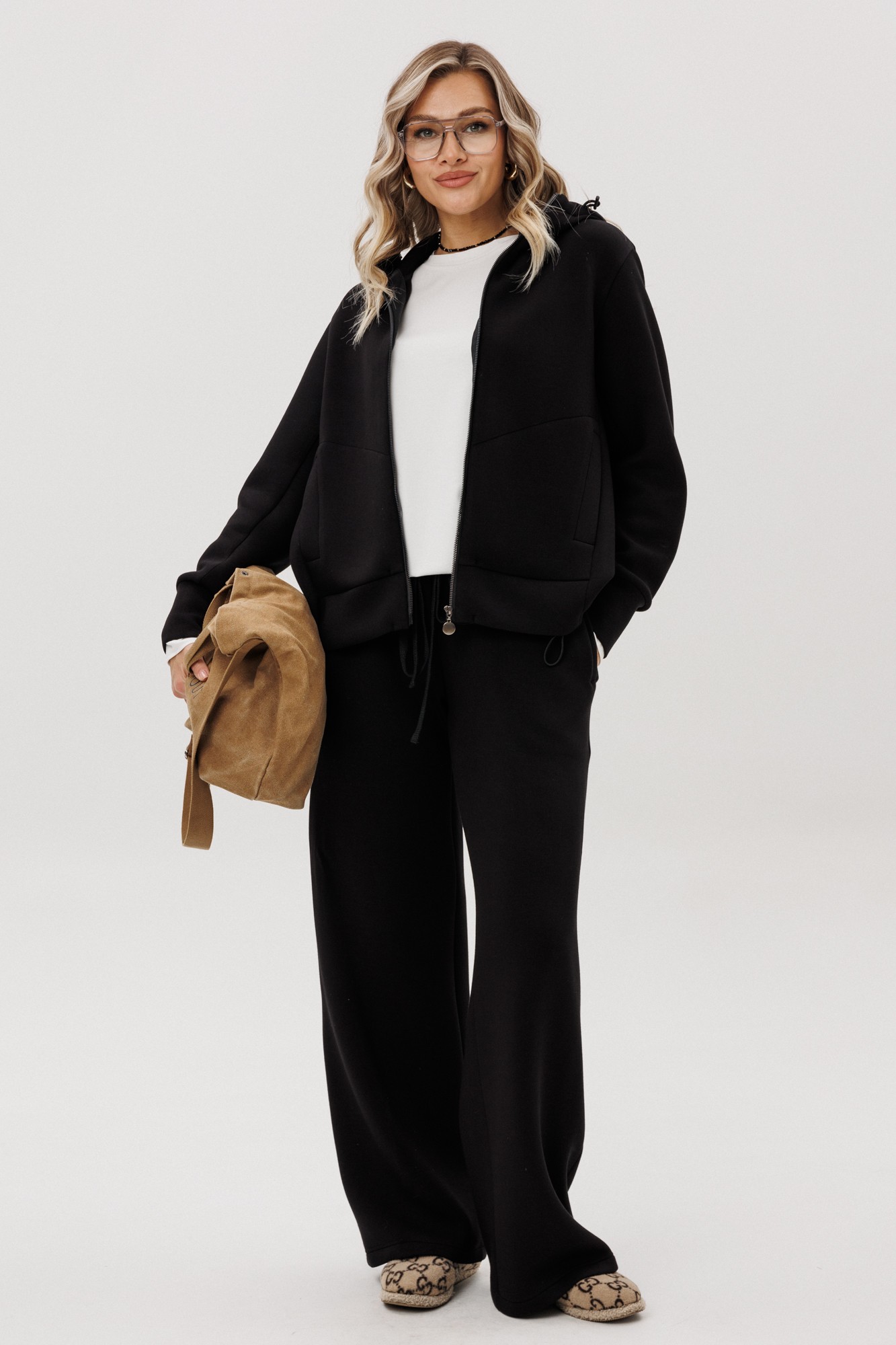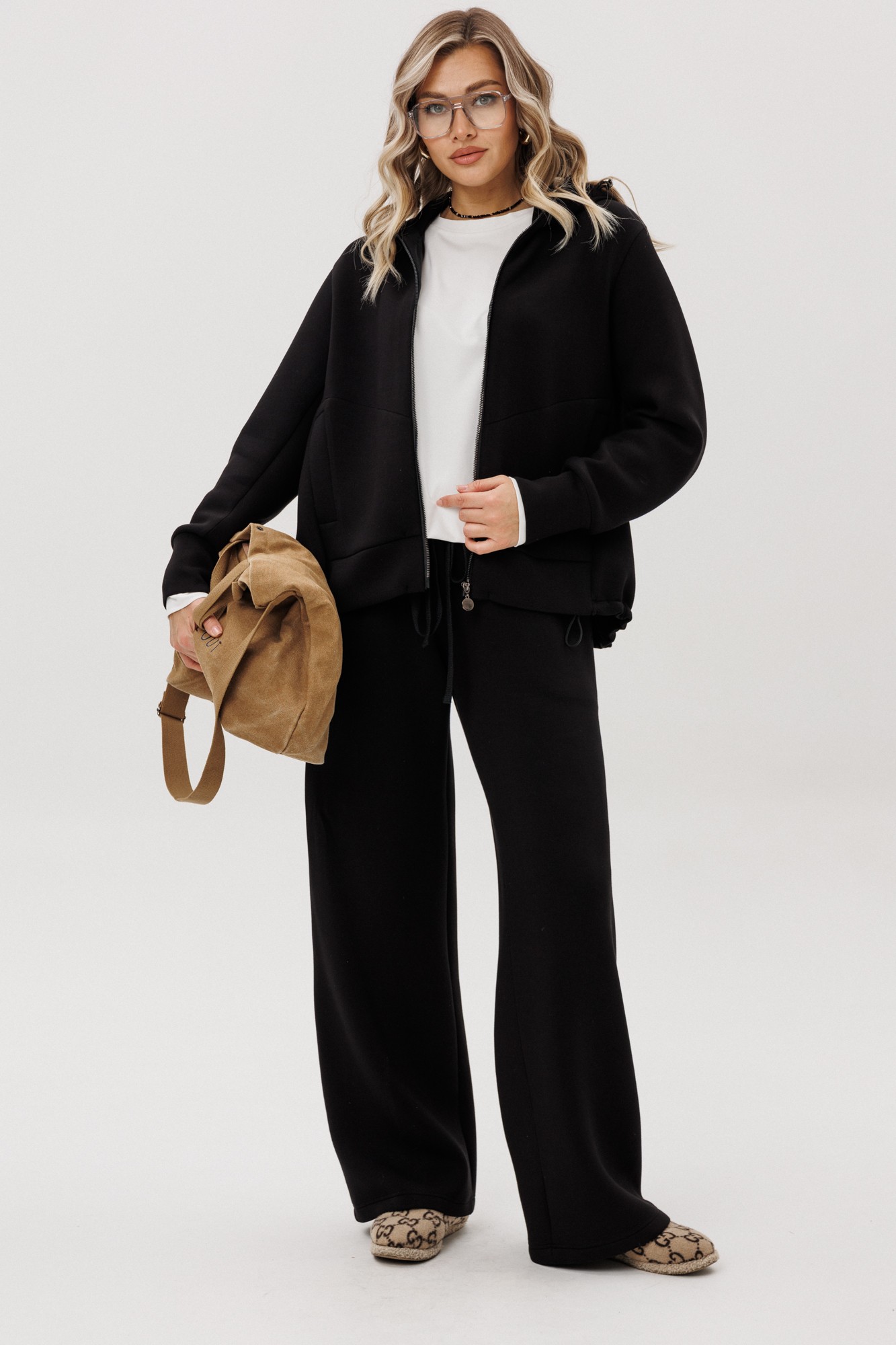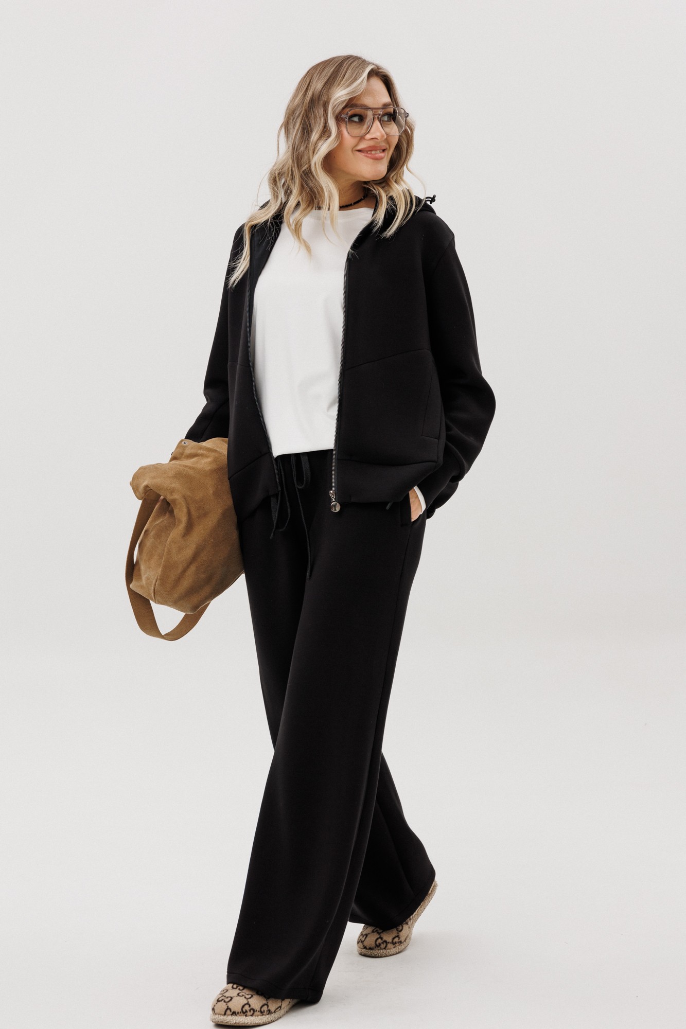 Комплект двухпредметный, состоит из джемпера и брюк. Джемпер с капюшоном. По переду карманы с листочкой. По спинке по низу эластичный шнур с фиксаторами. Застежка по переду на тесьму-молнию. Брюки прямого силуэта с боковыми карманами. Ширина по линии талии регулируется резинкой и шнуром.