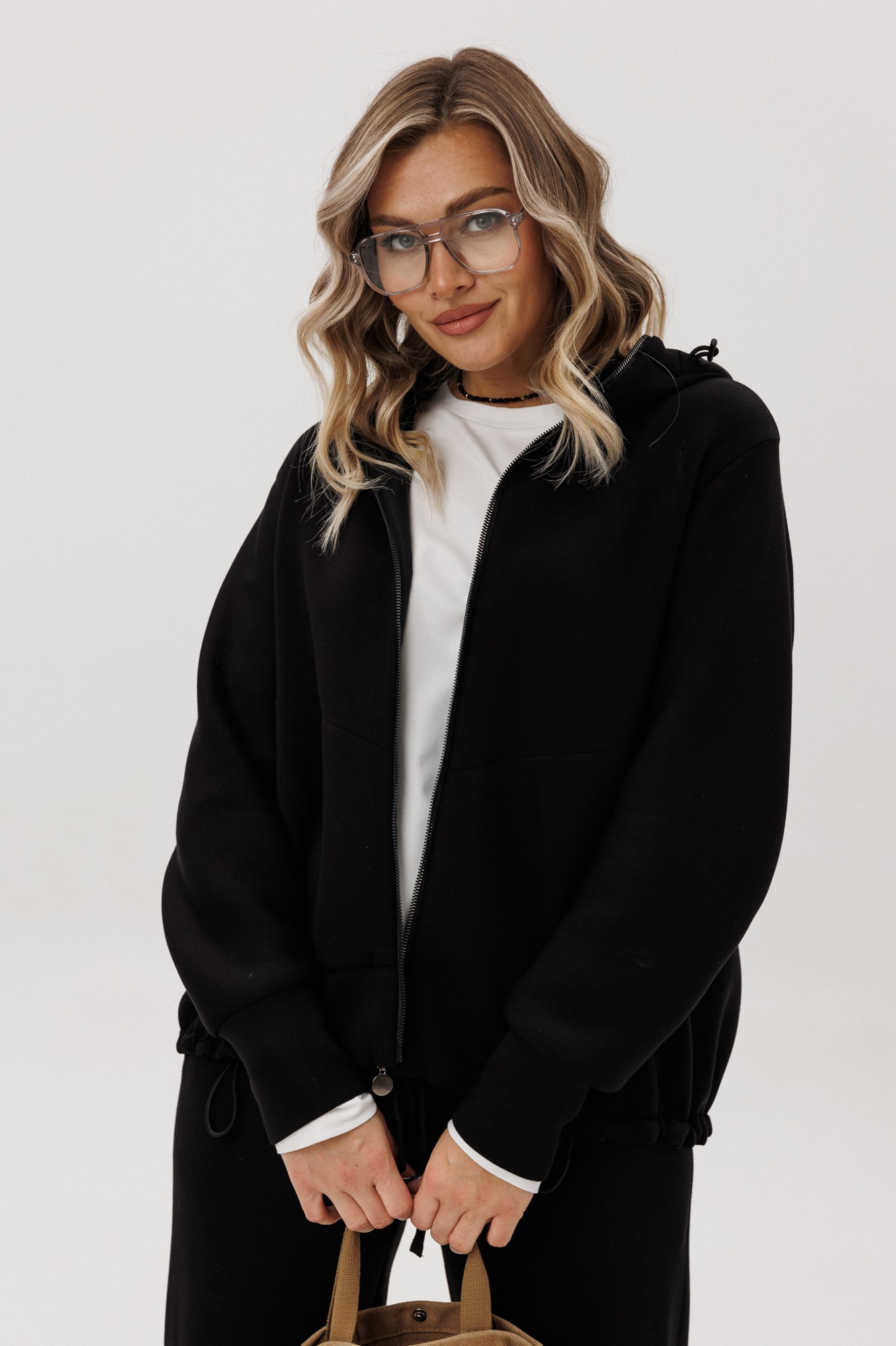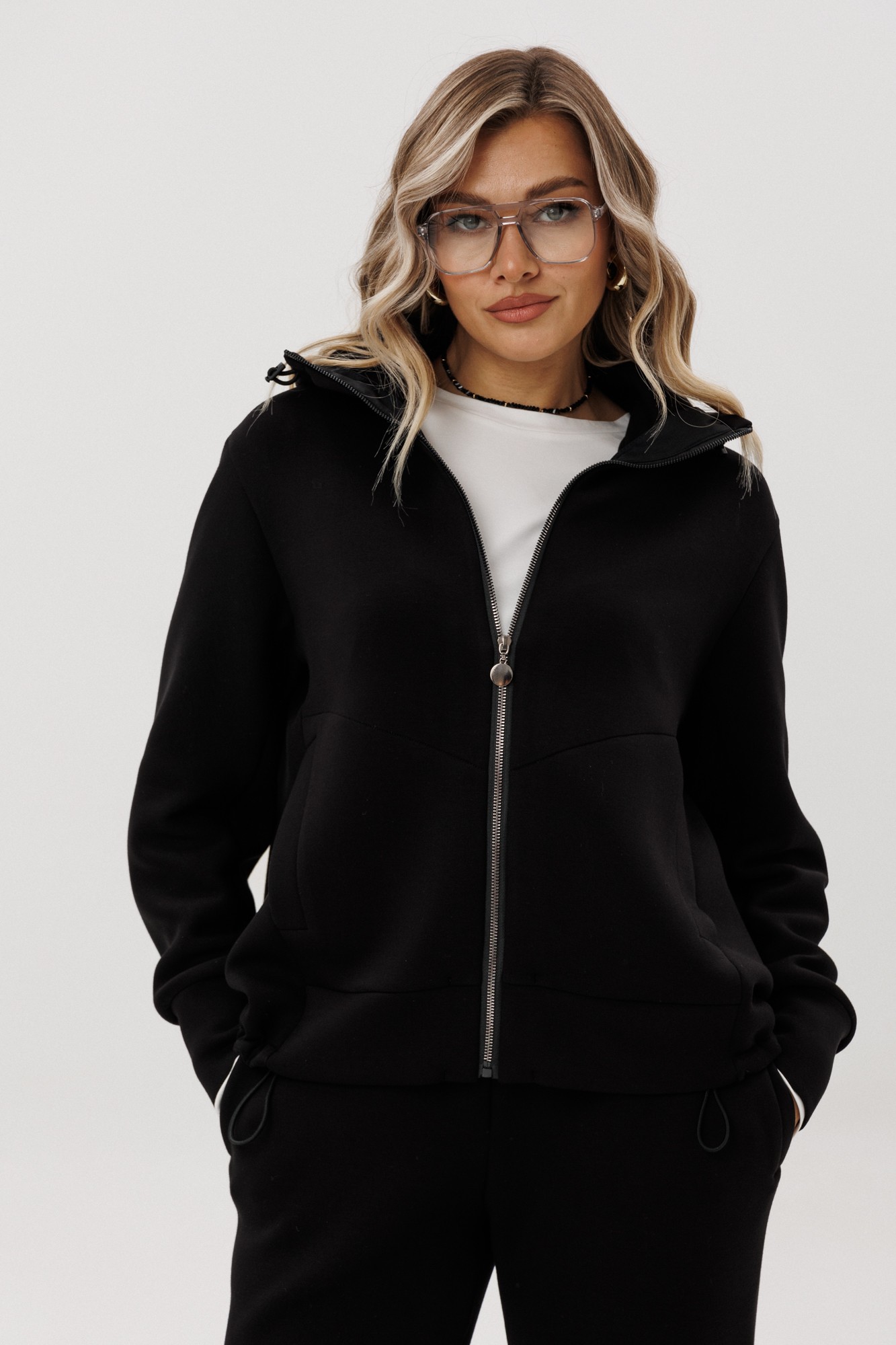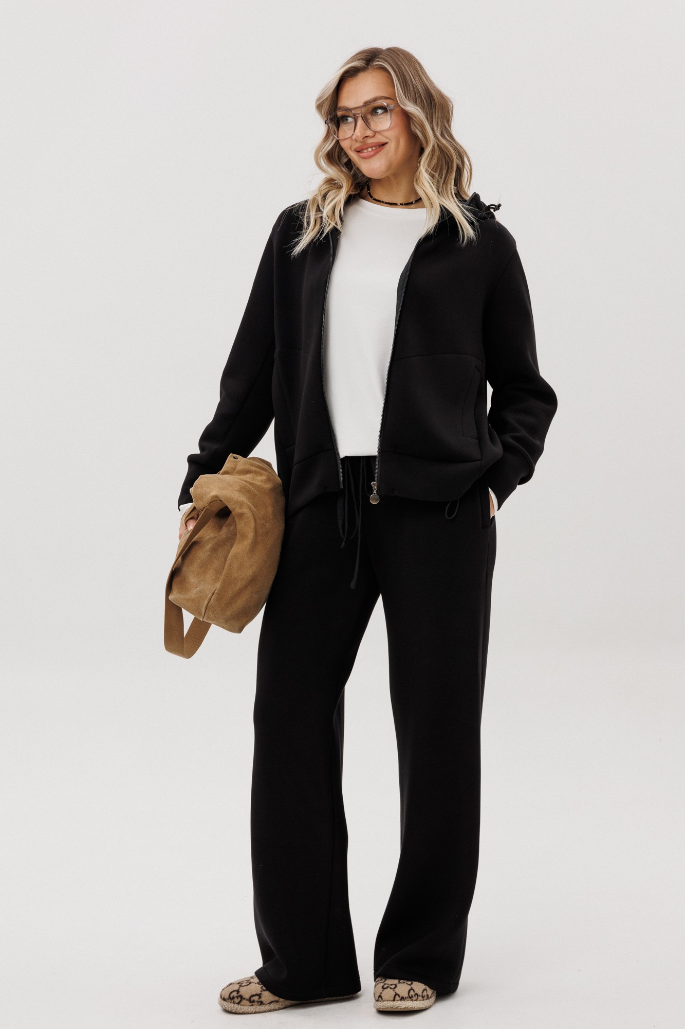Комплект двухпредметный, состоит из джемпера и брюк. Джемпер с капюшоном. По переду карманы с листочкой. По спинке по низу эластичный шнур с фиксаторами. Застежка по переду на тесьму-молнию. Брюки прямого силуэта с боковыми карманами. Ширина по линии талии регулируется резинкой и шнуром.