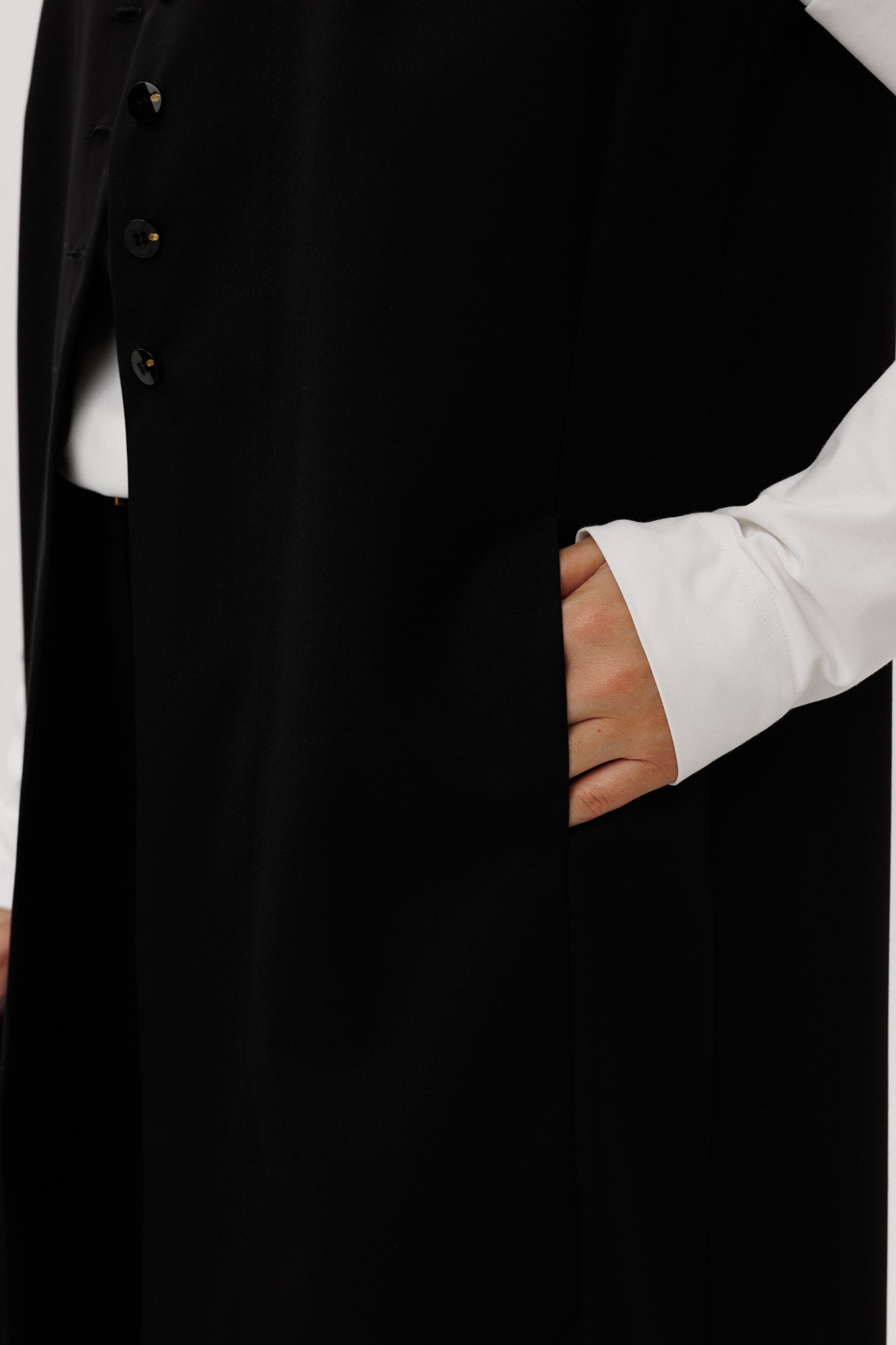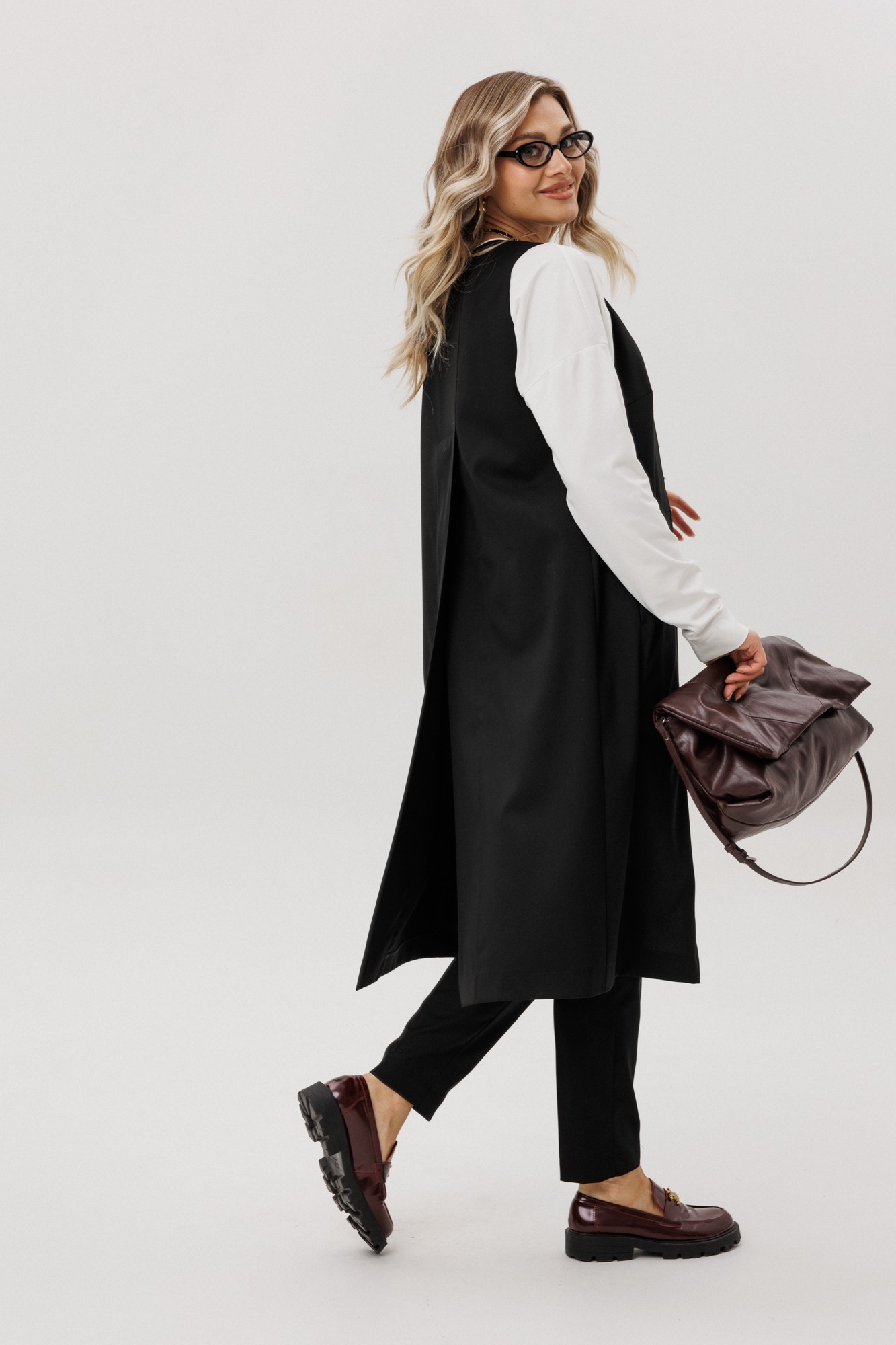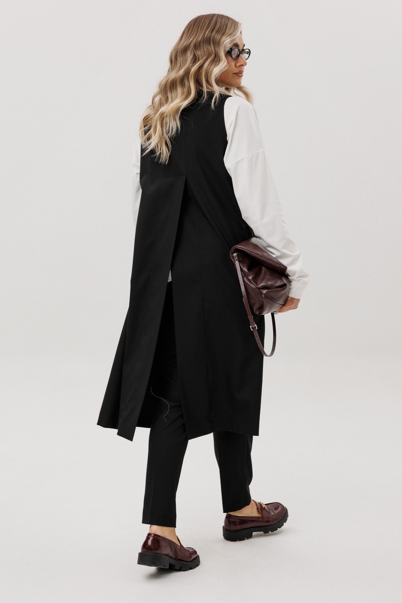 Костюм двухпредметный, состоит из Тренча и брюк. Тренч прямого силуэта без воротника. Застежка на петли-пуговицы. По переду в рельефах обработаны карманы. По центру спинки расположена широкая шлица. Брюки зауженные к низу со стрелками. По боковым швам расположены карманы. Ширина линии талии по спинке регулируется резинкой.