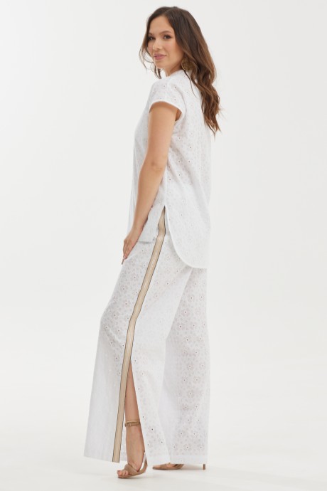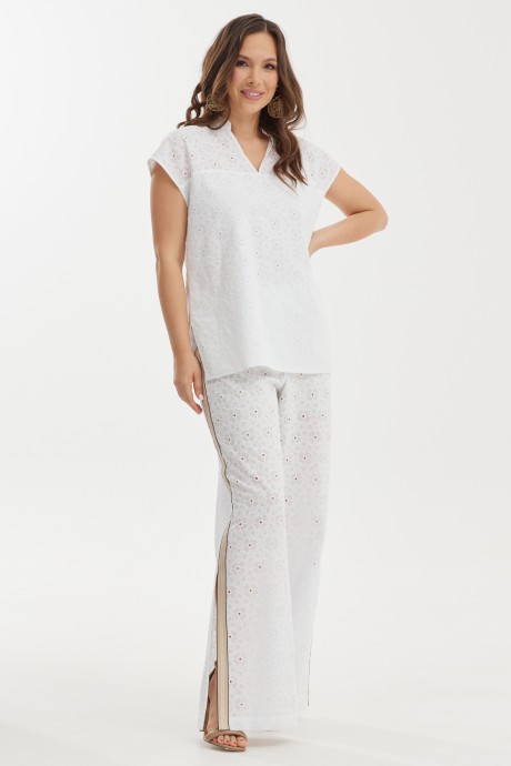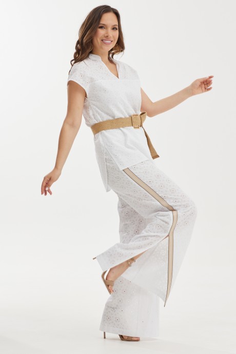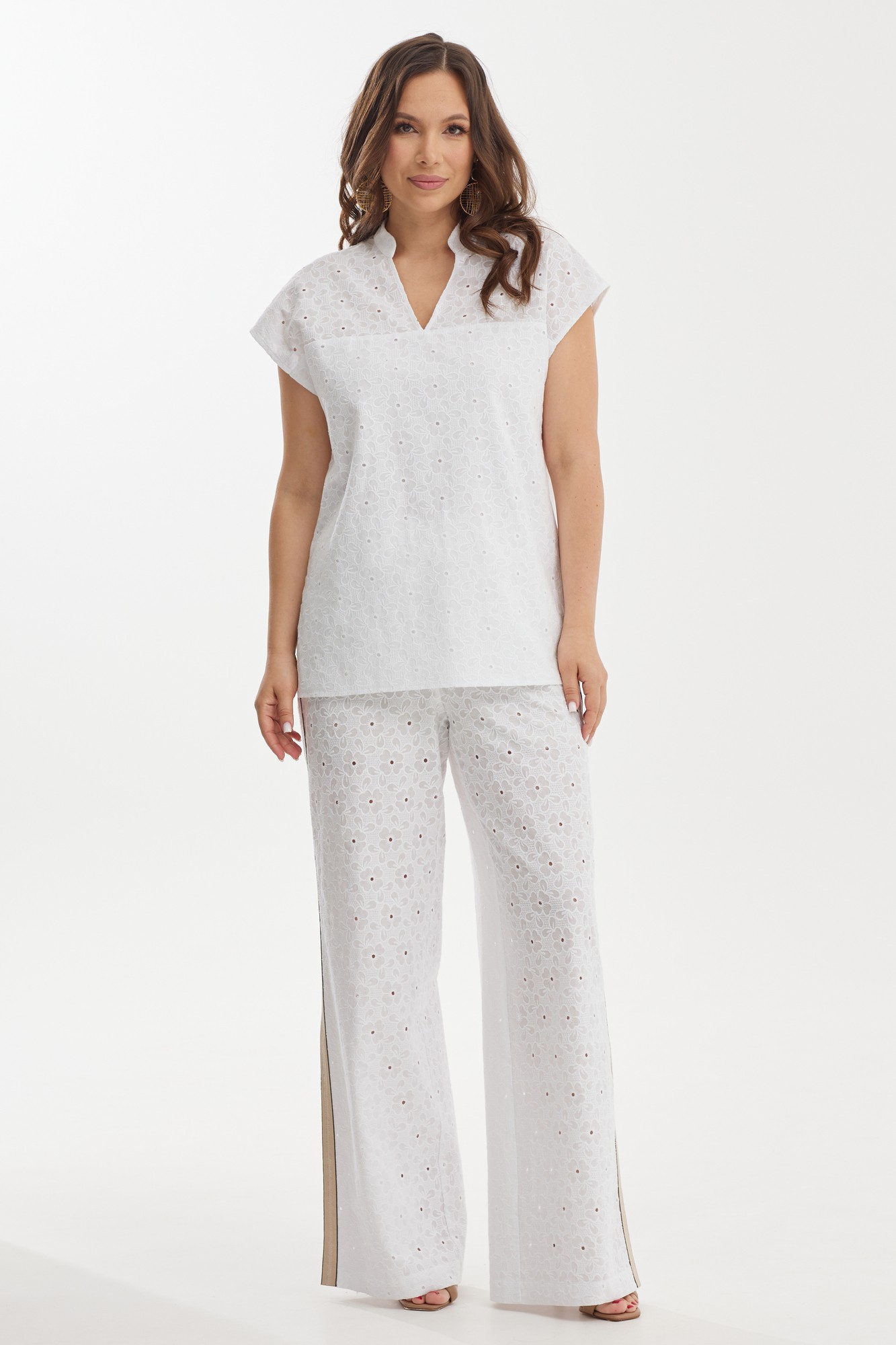 Стильный комплект из блузы и брюк, выполненный из натуральной хлопковой ткани с вышивкой. Блуза свободного прямого кроя с V-образным вырезом горловины. Верхняя часть горловины обработана стойкой. Рукав цельнокроеный, короткий. В боковых швах расположены разрезы. Полочка блузы дополнена хлопковой подкладкой в цвет блузы. Блуза приталена за счет съемного плетеного пояса с пряжкой (в комплекте) Отлично смотрится как с поясом, так и без него. Брюки прямого кроя с притачным поясом, дополненным эластичной тесьмой. По боковым швам брюки дополнены декоративной тесьмой . Так же брюки дополнены боковыми разрезами. В верхней части брюки дополнены тонкой трикотажной подкладкой в цвет тела(бежевый цвет). За счет этого подкладка сливается с цветом тела и не выделяется на его фоне.