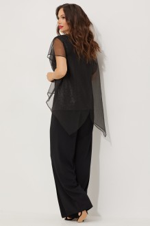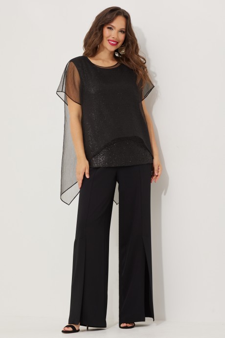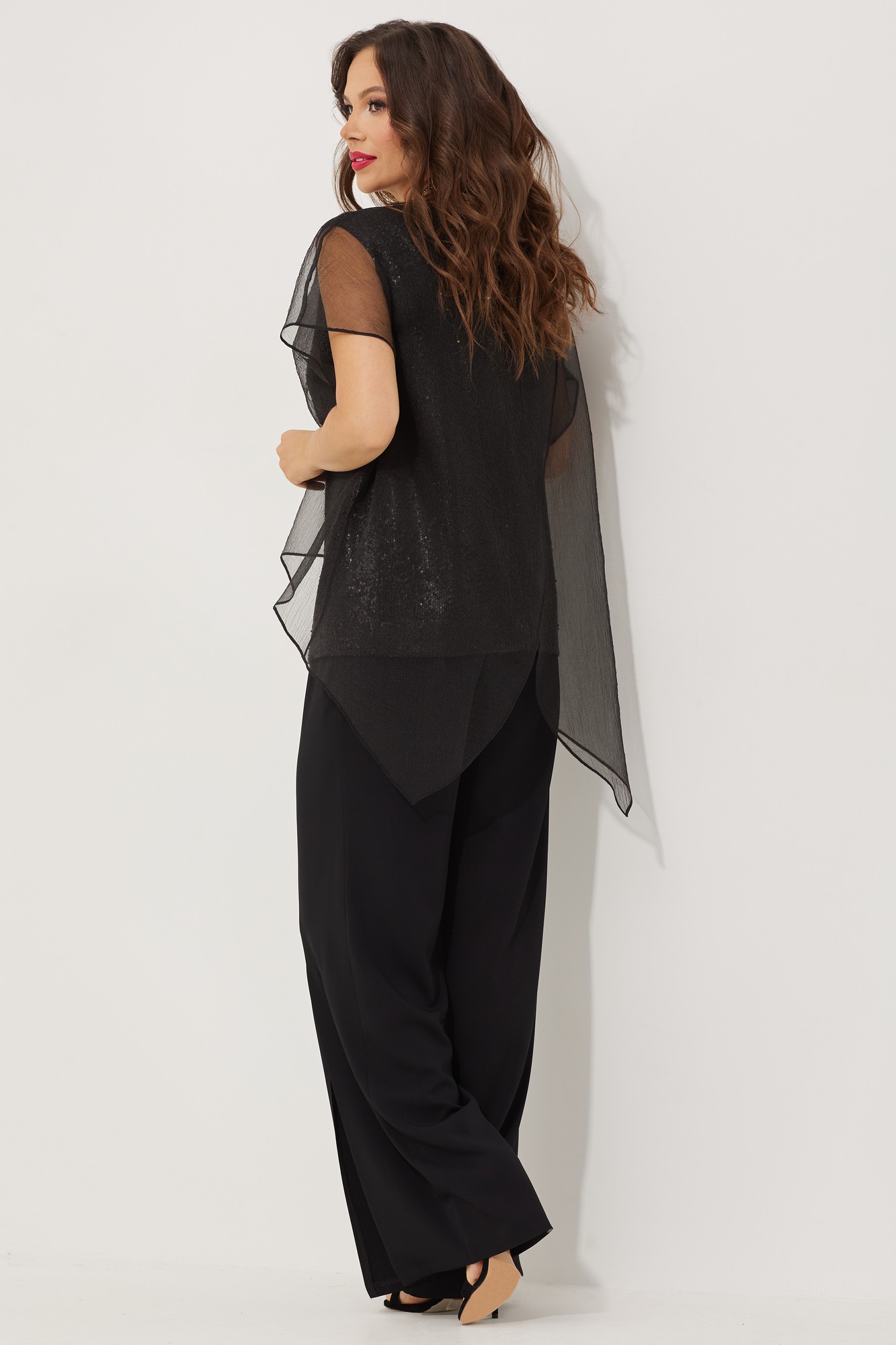 Нарядный комплект из блузы, топа и брюк. Блуза свободного кроя. Выполнена из воздушной невесомой органзы. Оригинальный дизайн придает образу изящности. Топ прямого кроя. Выполнен из ткани в пайетки, что создает эффект легкого мерцания. Брюки классического прямого кроя с притачным поясом, дополненным эластичной тесьмой. Спереди брюки дополнены разрезами(шлица). По бокам расположены удобные карманы.