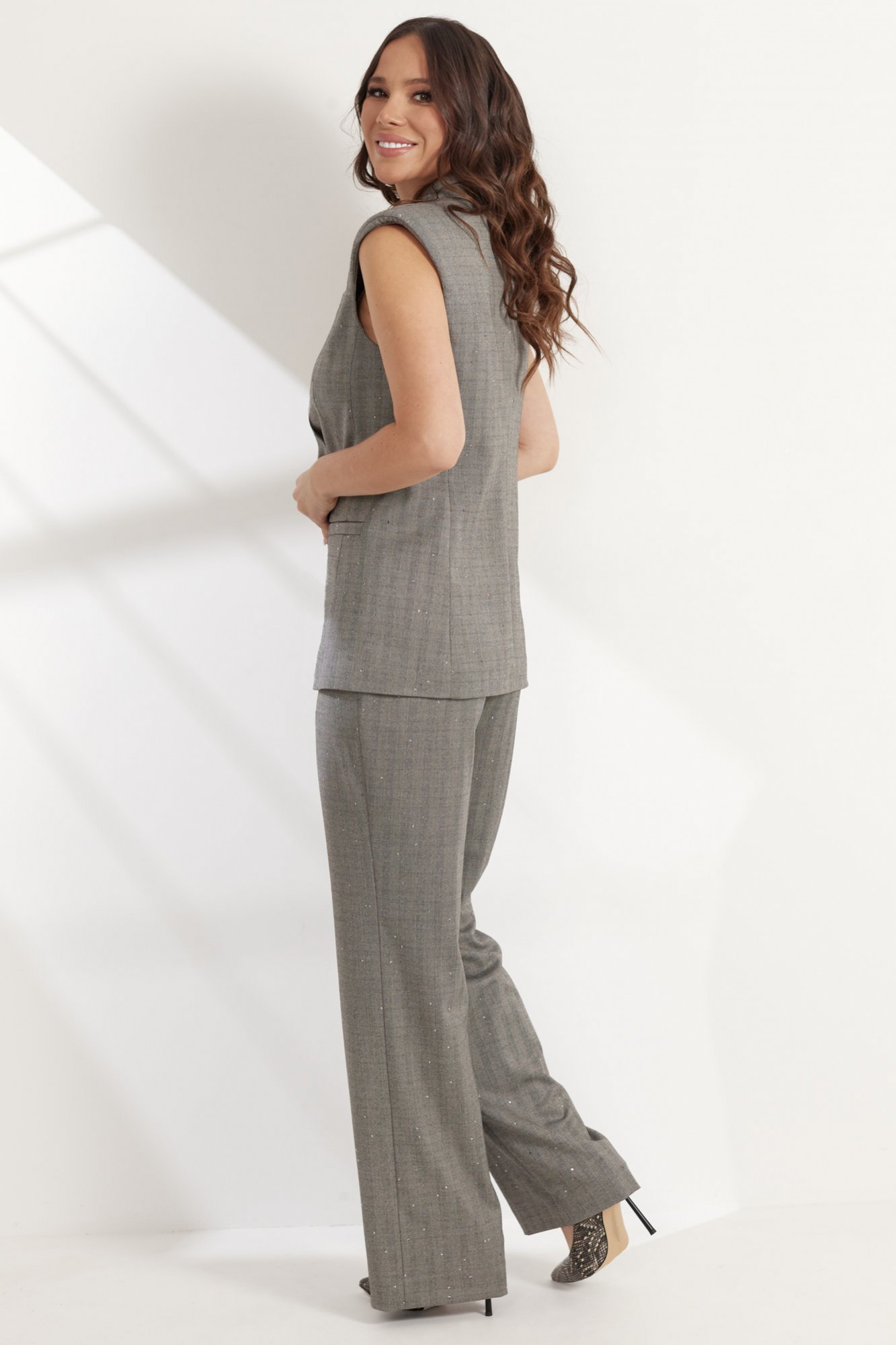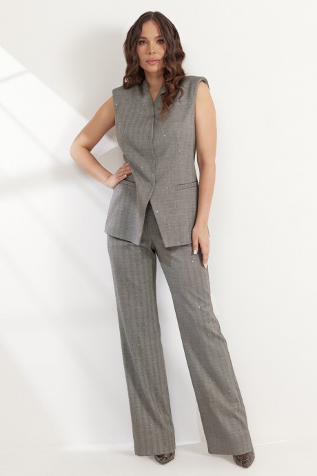 Элегантный комплект из жилета и брюк. Крой костюма выгодно подчеркивает фигуру и скрывает недостатки. Выполнен из костюмной ткани с россыпью мелких пришивных пайеток, создающих легкое мерцание. Жакет полуприталенного силуэта, на подкладке, с центральной застежкой на потайные кнопки. Дополнен функциональными карманами. Брюки классического прямого кроя с притачным поясом, дополненным эластичной тесьмой. Дополнены удобными боковыми карманами. Застежка гульфик на молнию и пришивную пуговицу.