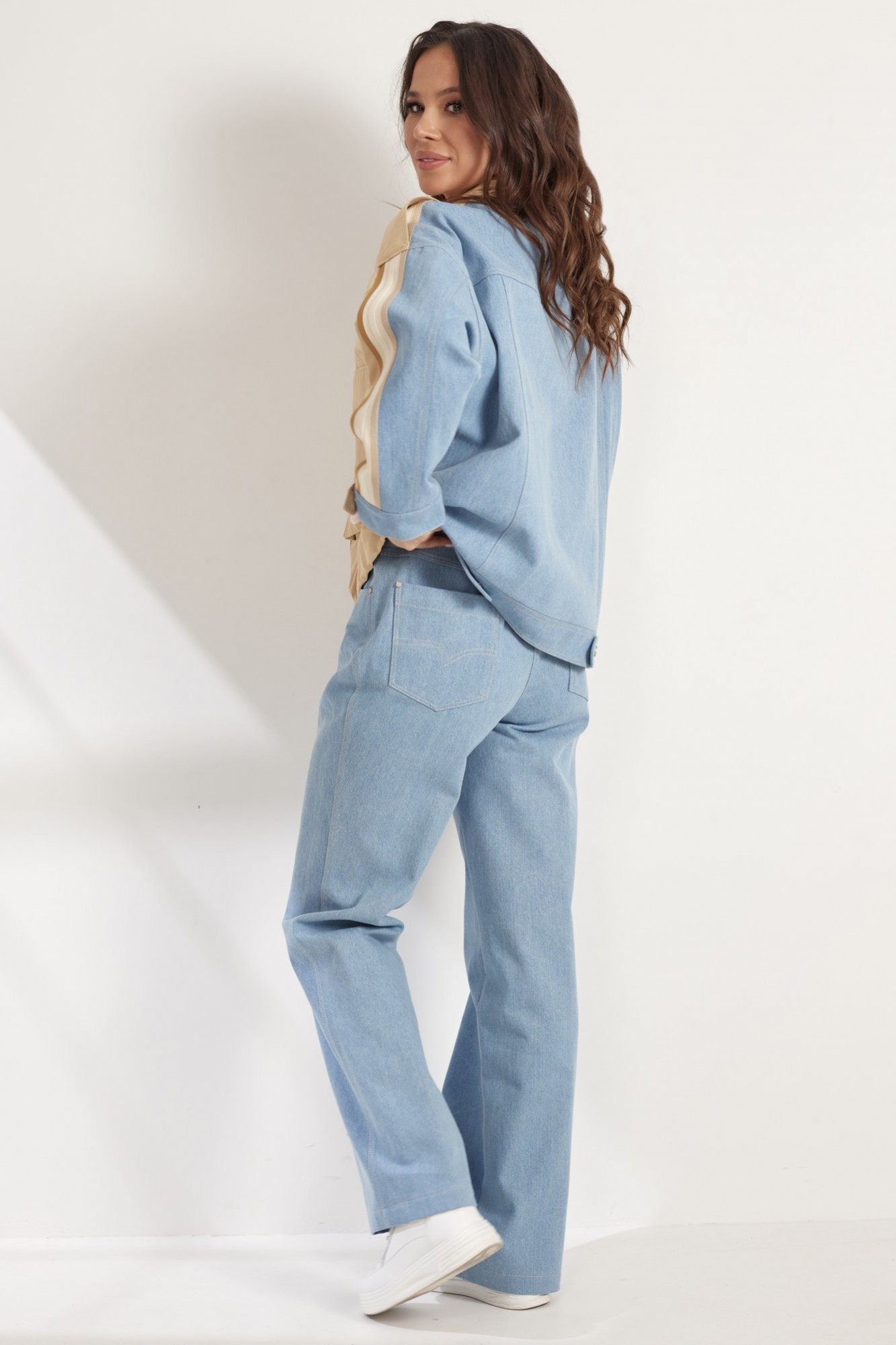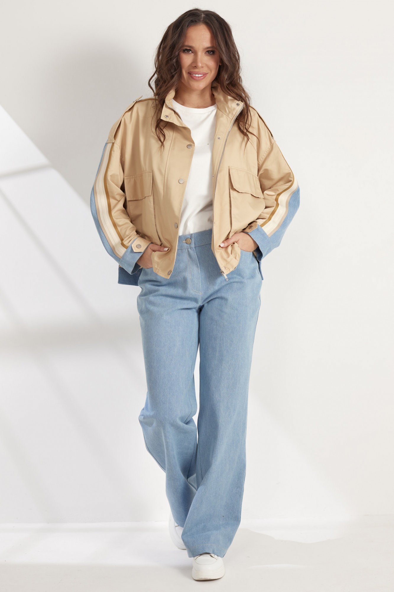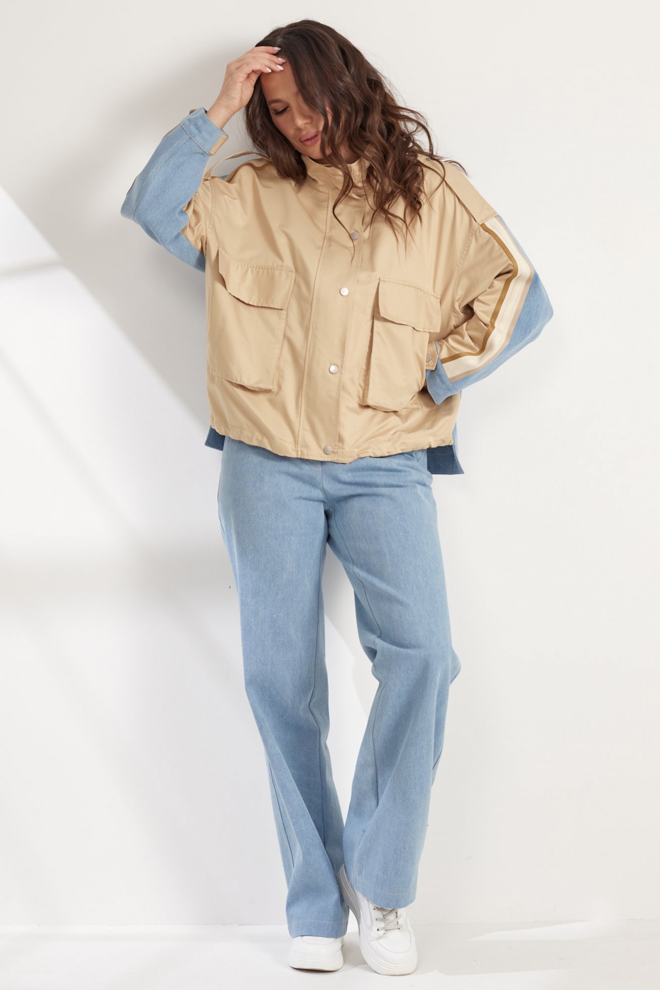 Стильный комплект из куртки и джинсовых брюк. Куртка свободного кроя, на подкладке, с центральной застежкой на металлическую молнию и планку с металлическими кнопками. Горловина обработана стойкой. Рукав спущен. Перед куртки выполнен из плащевой ткани бежевого цвета, с которым стильно сочетается спинка из джинсового полотна голубого цвета. Рукава дополнены декоративной тесьмой. Низ куртки дополнен скрытой кулиской с фиксаторами, за счет которой можно регулировать объем и форму куртки. Брюки свободного прямого кроя. Выполнены из хлопкового джинса. Посадка средняя. Пояс притачной, дополнен эластичной тесьмой. Брюки дополнены удобными боковыми и задними карманами с декоративными заклепками- хольнитенами. Застежка гульфик на молнию и металлическую пуговицу.