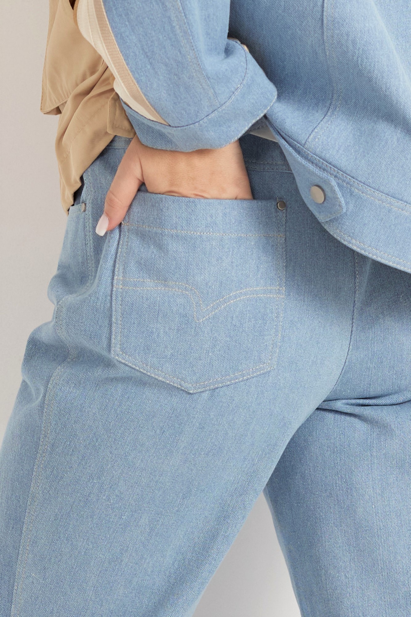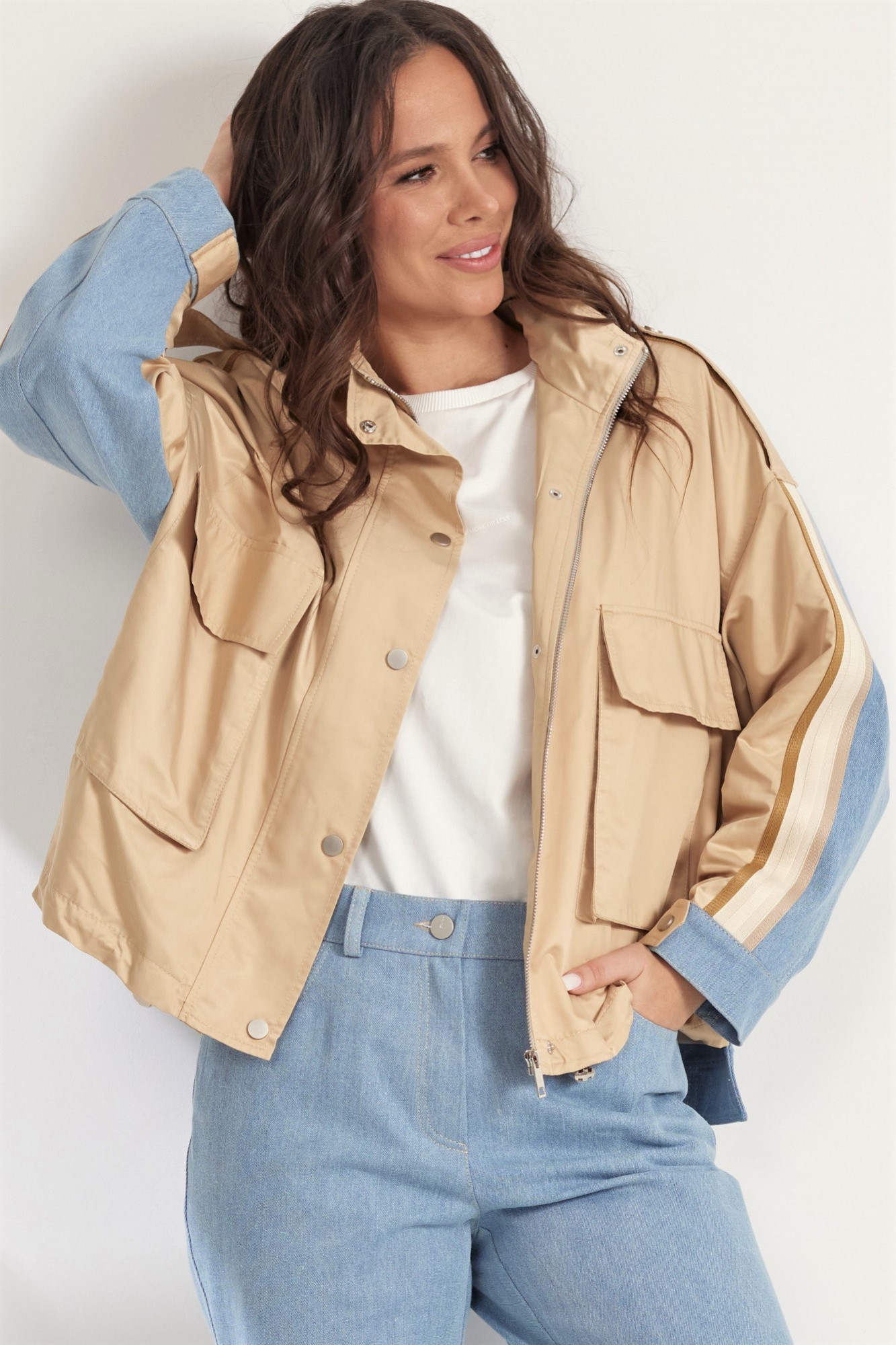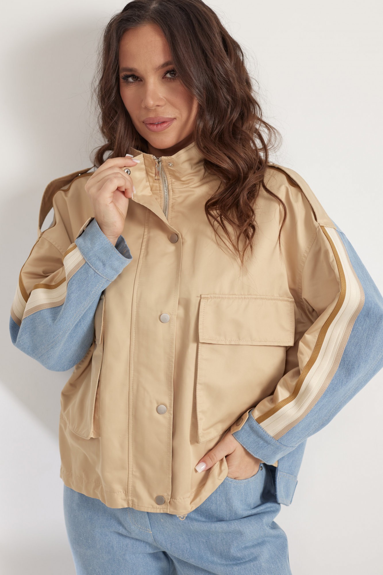 Стильный комплект из куртки и джинсовых брюк. Куртка свободного кроя, на подкладке, с центральной застежкой на металлическую молнию и планку с металлическими кнопками. Горловина обработана стойкой. Рукав спущен. Перед куртки выполнен из плащевой ткани бежевого цвета, с которым стильно сочетается спинка из джинсового полотна голубого цвета. Рукава дополнены декоративной тесьмой. Низ куртки дополнен скрытой кулиской с фиксаторами, за счет которой можно регулировать объем и форму куртки. Брюки свободного прямого кроя. Выполнены из хлопкового джинса. Посадка средняя. Пояс притачной, дополнен эластичной тесьмой. Брюки дополнены удобными боковыми и задними карманами с декоративными заклепками- хольнитенами. Застежка гульфик на молнию и металлическую пуговицу.