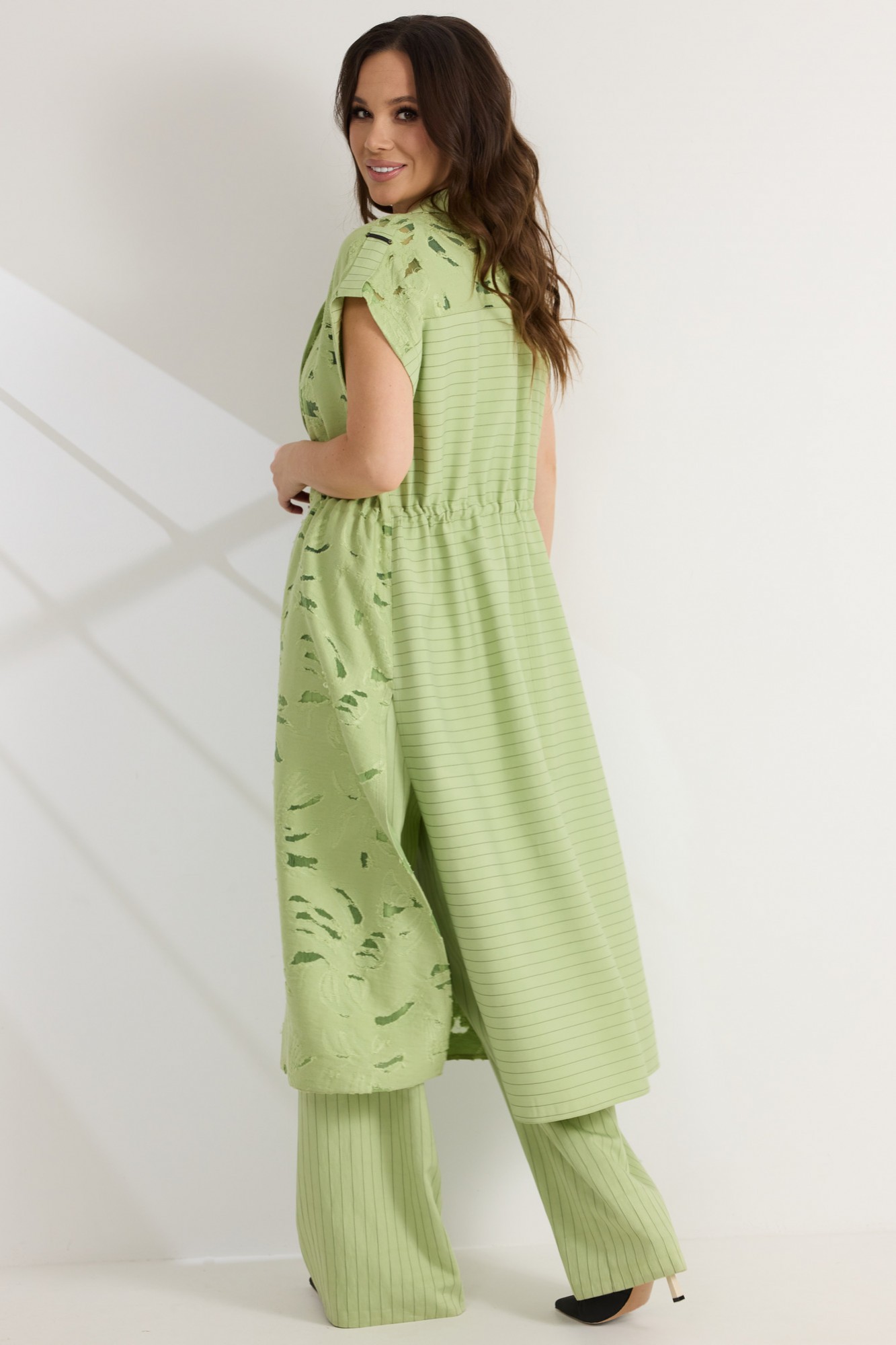 Элегантный комплект из кардигана топа и брюк. Удлиненный кардиган свободного кроя с коротким, цельнокроеным рукавом. По талии дополнен скрытой кулиской. Горловина обработана отложным воротником. Перед выполнен из натуральной вискозной ткани с вкраплениями из органзы, что придает кардигану легкость и воздушность. Спинка выполнена из поливискозного полотна цвета лайм в меловую полоску. Топ прямого кроя. Выполнен из вискозного полотна. Брюки прямого свободного кроя с притачным поясом, дополненным эластичной тесьмой. Застежка гульфик на молнию и пришивную пуговицу. Брюки дополнены боковыми карманами. Выполнены брюки из поливискозного полотна цвета лайм в меловую полоску.