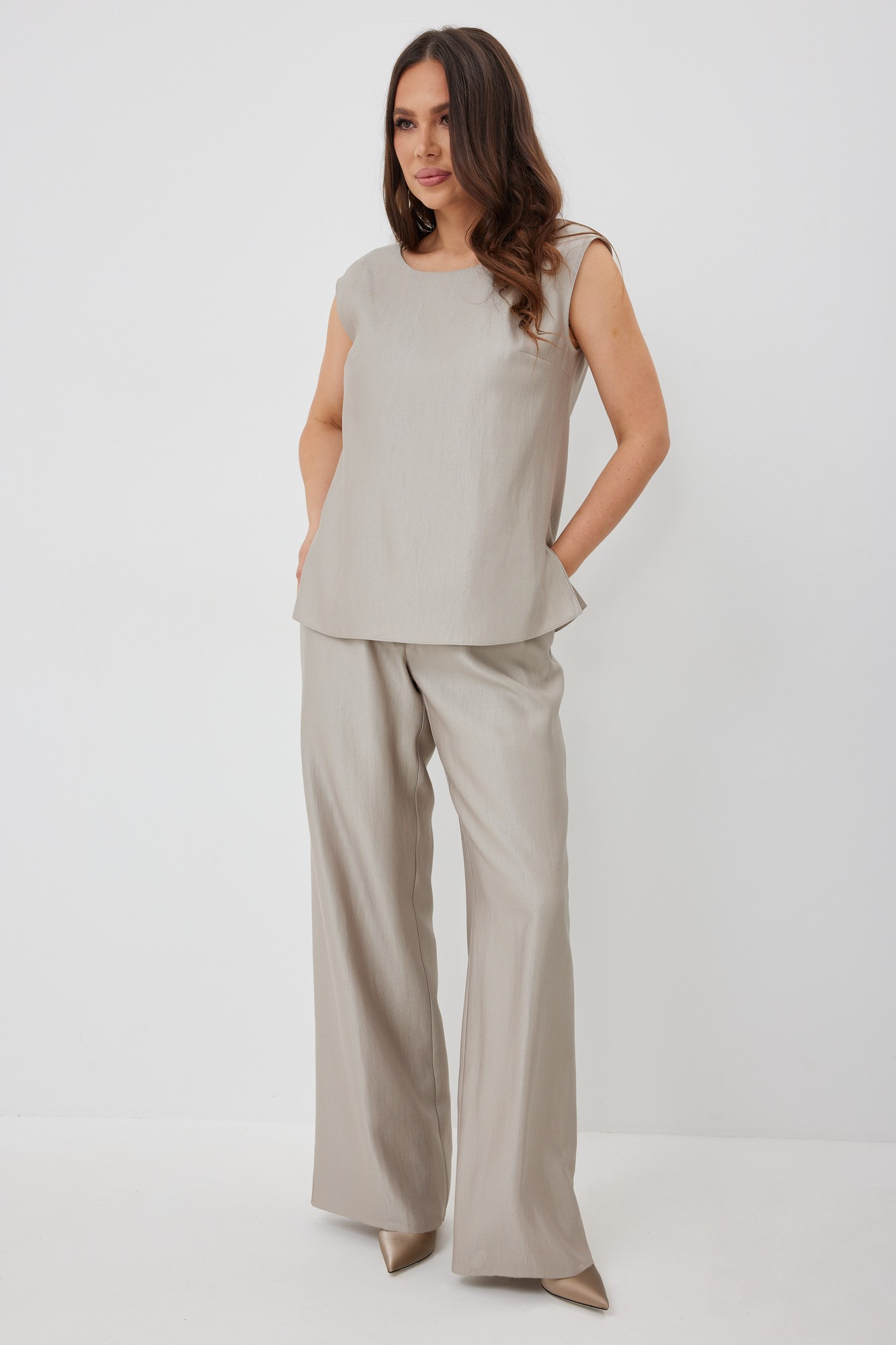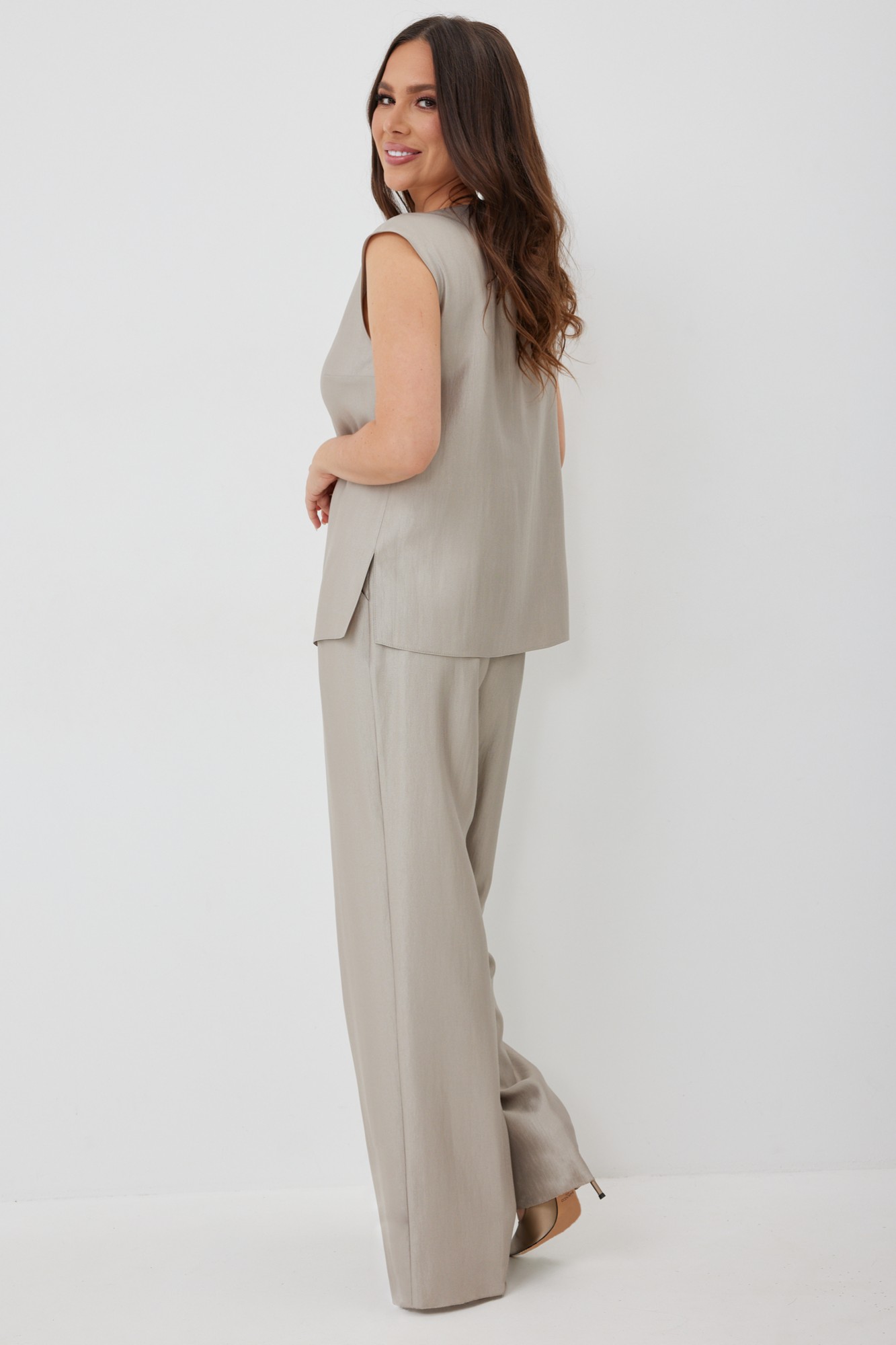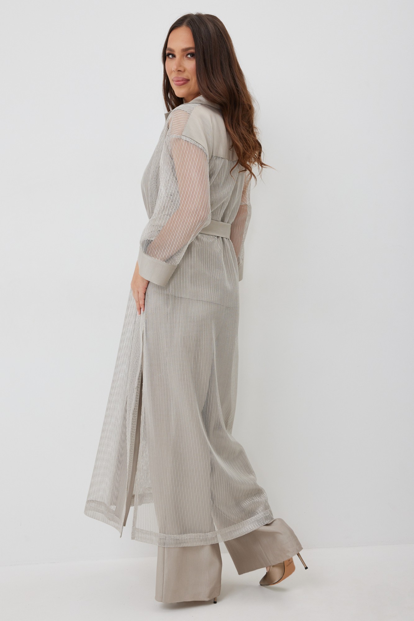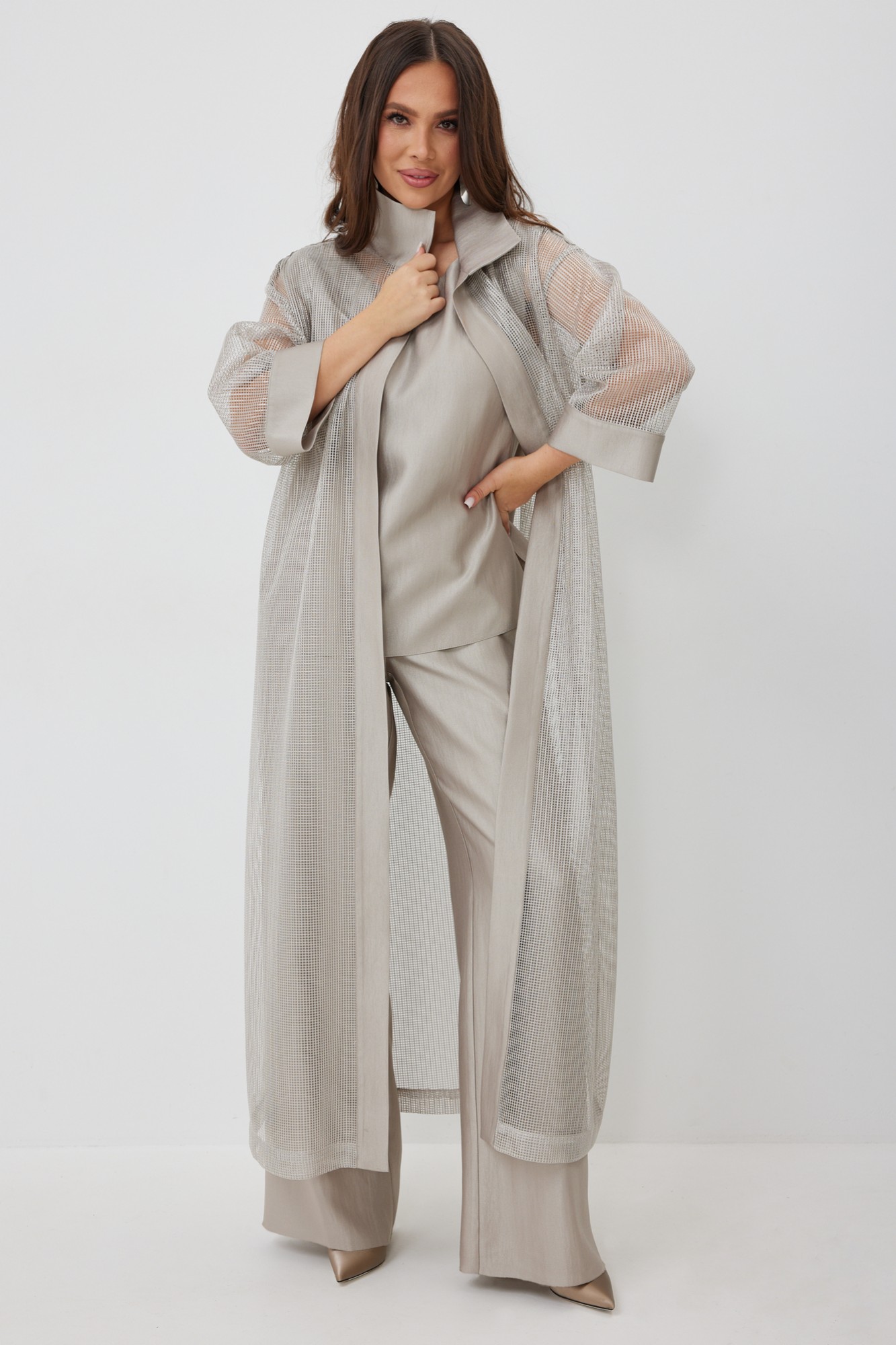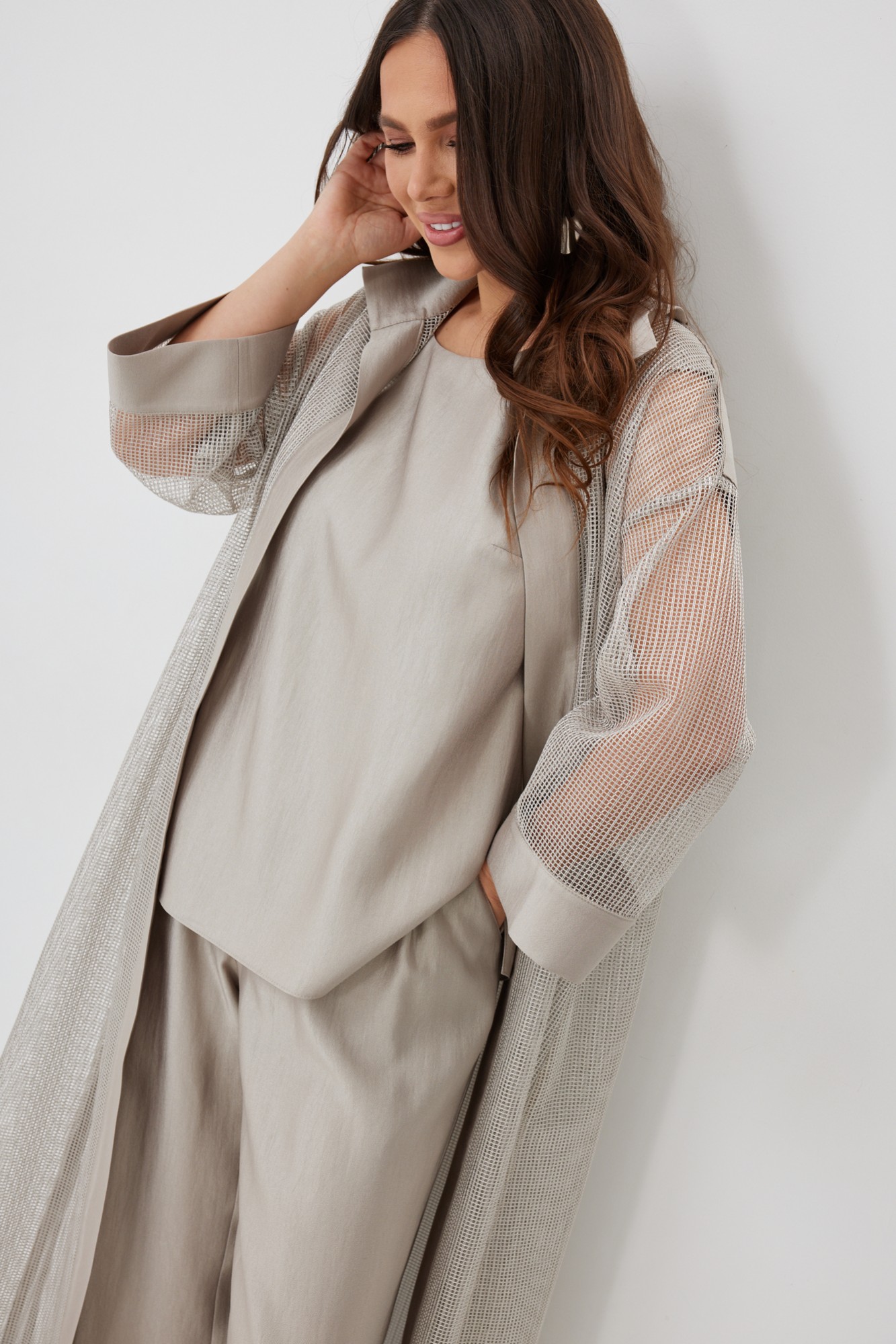 Стильный комплект из длинного кардигана, топа и брюк. Кардиган свободного прямого кроя с разрезами. Выполнен из текстильной сетки с отделкой из гладкой костюмной ткани. Рукав втачной, слегка спущен. Дополнен съемным поясом. Топ и брюки выполнены из красивой костюмной гладкой ткани. Топ свободного прямого кроя. Горловина округлой формы. Брюки классического прямого кроя. Посадка средняя. Пояс притачной, дополнен эластичной тесьмой. Брюки дополнены удобными боковыми и задними карманами. Застежка гульфик на молнию и пуговицу.