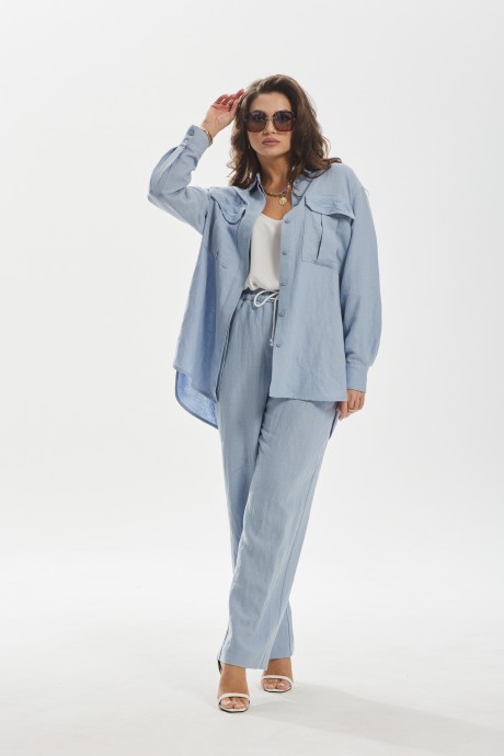 Комплект женский, состоящий из рубашки и брюк. Рубашка оверсайз с застежкой на потайные пуговицы по груди, прямого силуэта с накладными нагрудными карманами с клапанами и вышивкой. Воротник отложной с отрезной стойкой. Низ рубашки фигурный, закругленный. Брюки прямые с вытачками по низу, собранные на манжета с застежкой на две пуговицы, Пояс брюк прямой с декоративным шнурком. По бокам карманы с отрезным бочком.
