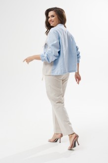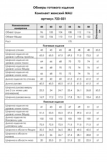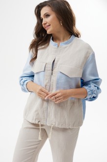 Комплект 2-х предметный. Состоит из жакета и брюк. Жакет двухцветный свободного силуэта со спущенным плечом, рубашечным рукавом. Рукав на манжете с резинкой. Воротник стойка. Застежка — металлическия молния. По низу кулиса со шнурком. На груди накладные карманы с клапаном. Брюки прямые от колена. По бокам карманы с отрезным бочком. Пояс из двух частей: по переду — пояс-кокетка, сзади — резинка. Застежка на молнию и пуговицу. Комплект прекрасно сочетается с блузой MALI 624-009.