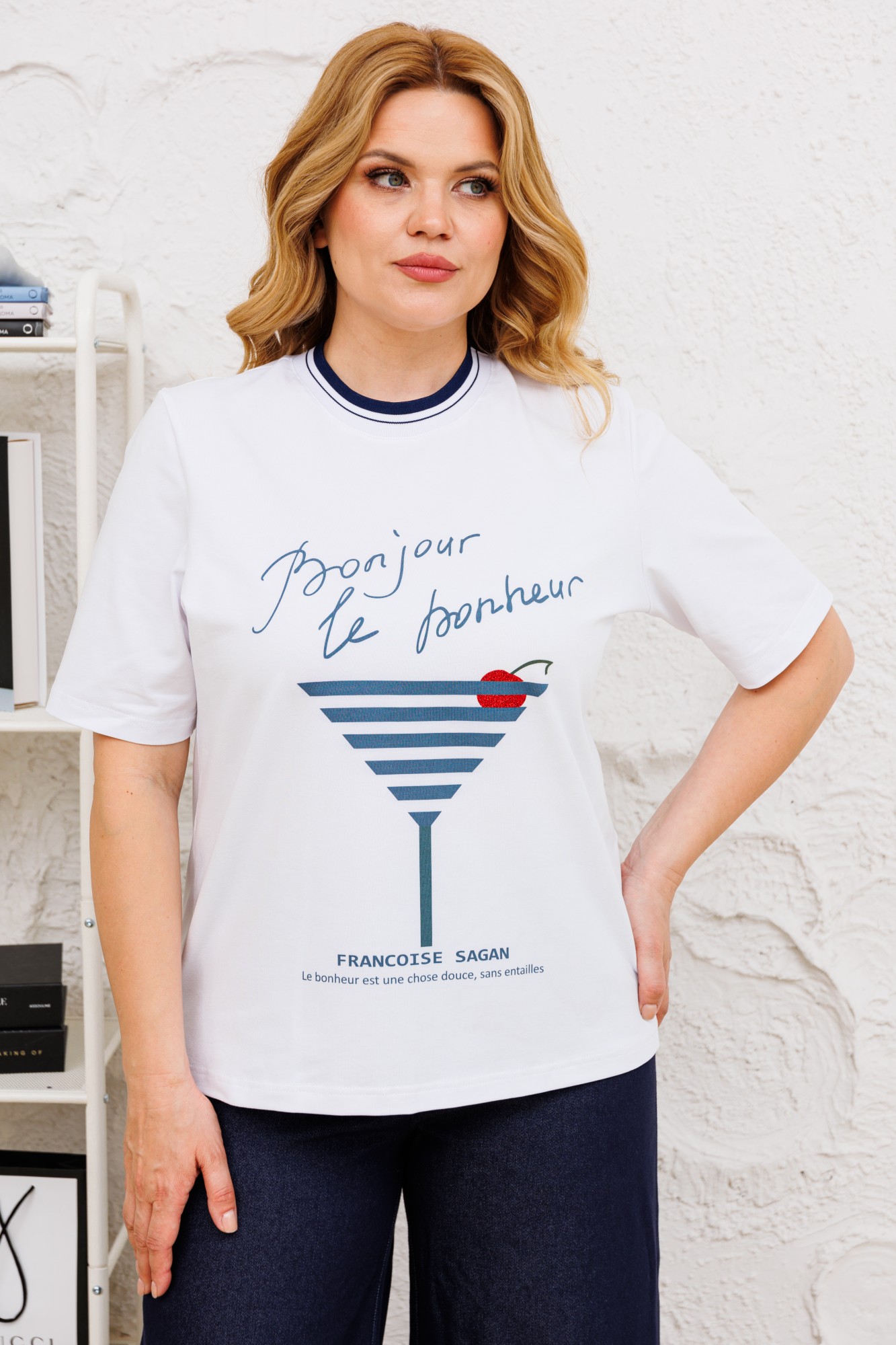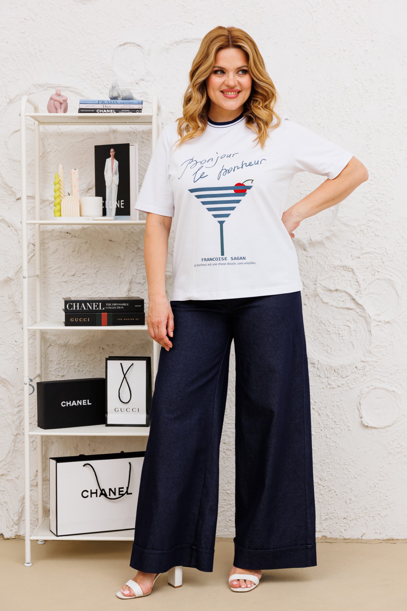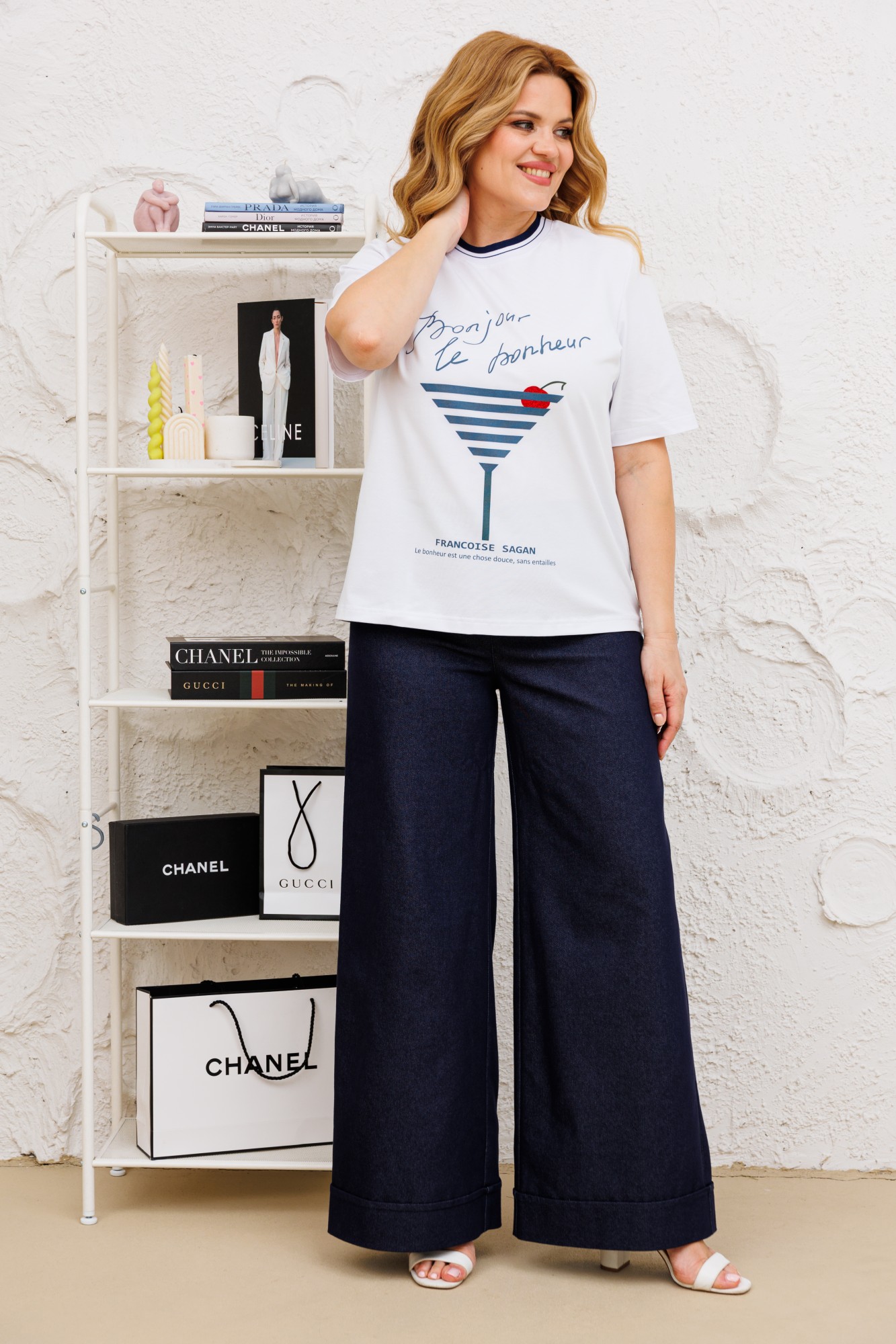 Универсальный и удобный женский брючный комплект. Данный комплект может быть как нарядным, так и для повседневной носки. Изделие состоит из футболки-оверсайзи джинсовых брюк-палаццо. Футболка свободного кроя выполнена из хлопковой ткани, рукав укороченный, круглая горловина, которая отделана довязом с люрексом, перед и спинка прямые. По переду футболки нанесен яркий модный принт. Брюки-палаццо из однотонного джинса средней плотности. Брюки идеально сидят на любой фигуре, подчеркивая все достоинства и скрывая недостатки. Изделие на притачном поясе с резинкой сзади, сбоку застежка на молнию. По низу брюк цельнокроеная манжета из широкой подгибки. С данным комплектом можно смело создавать стильные образы как вместе, так и по отдельности.
