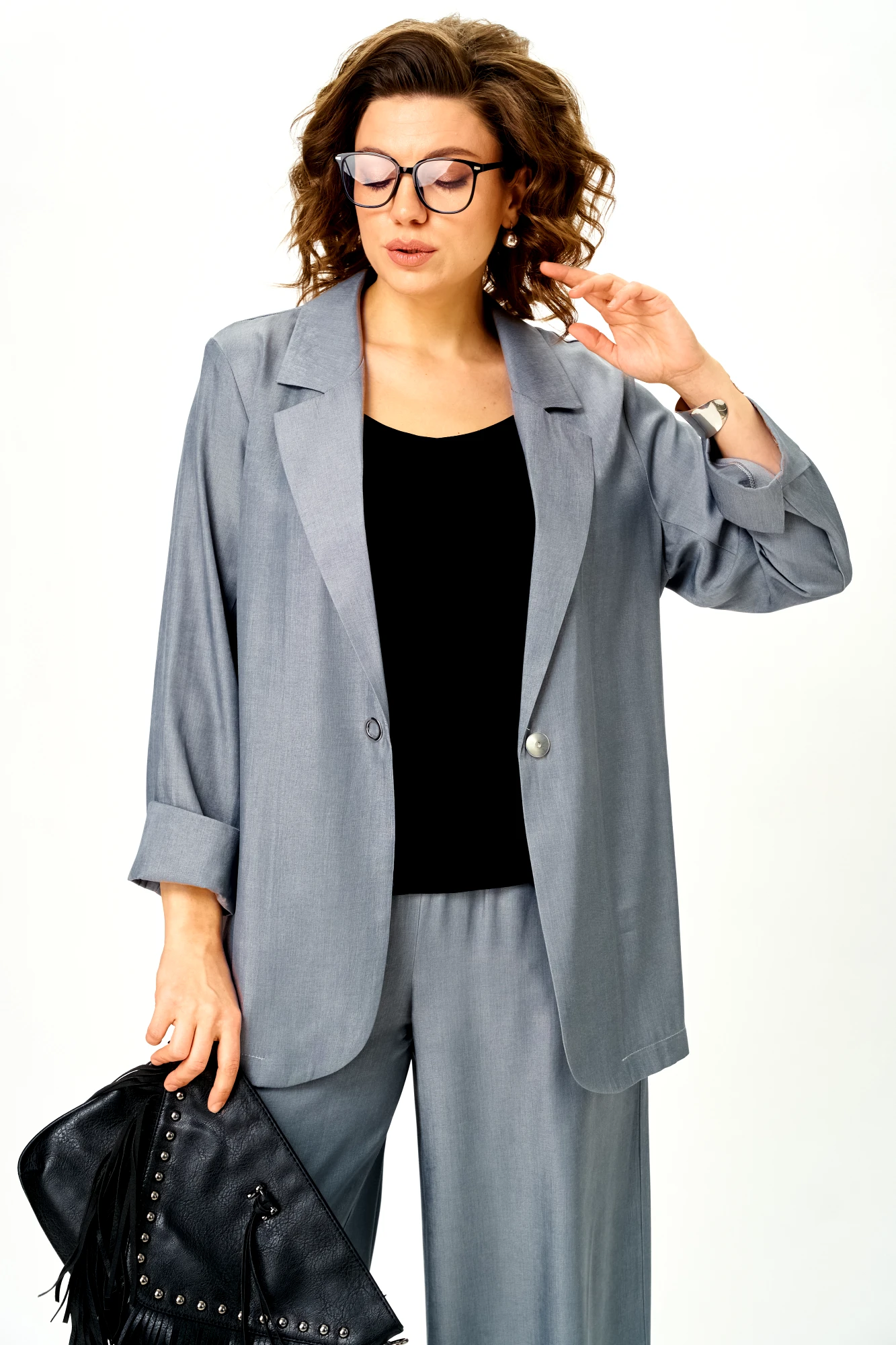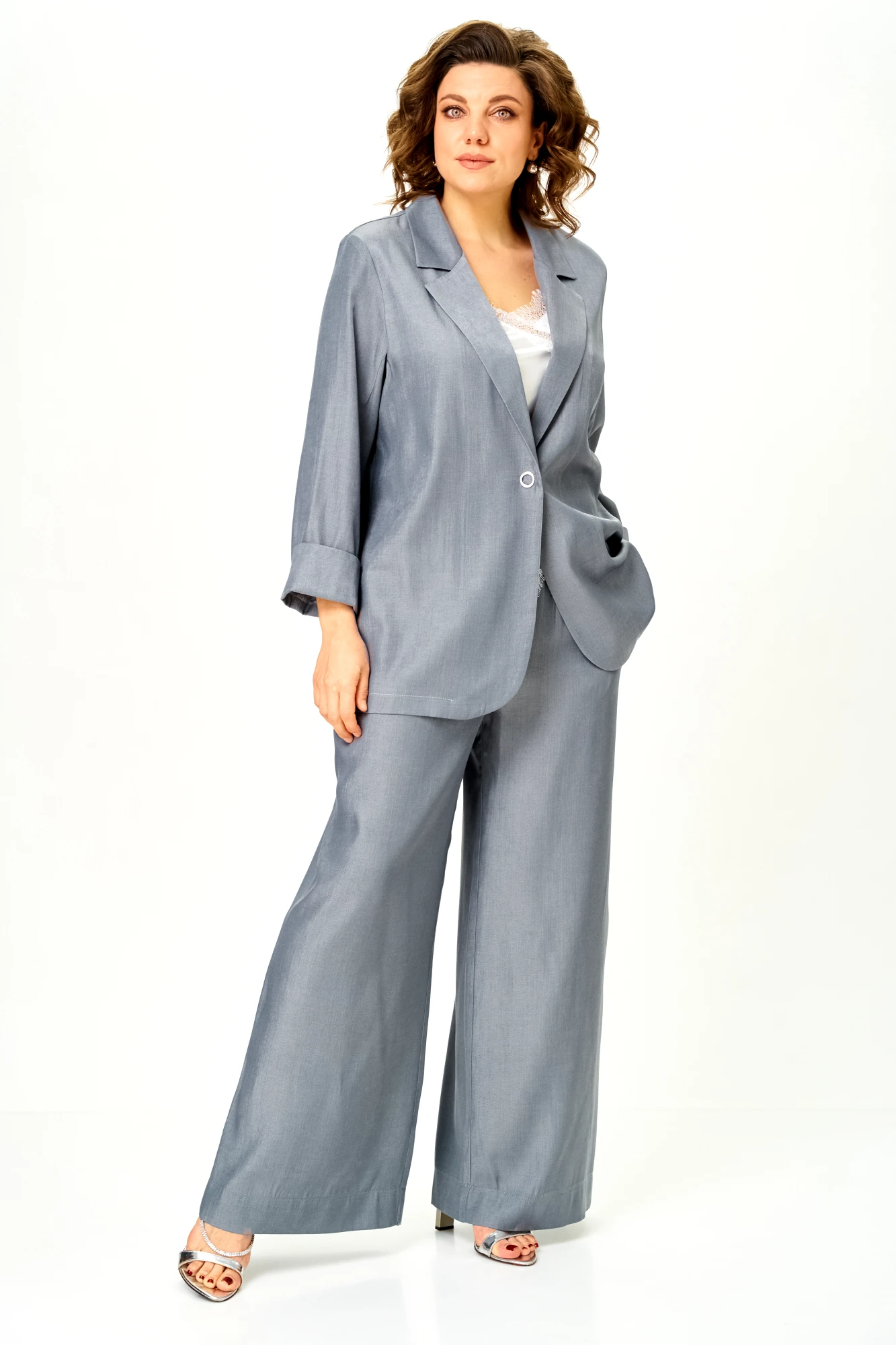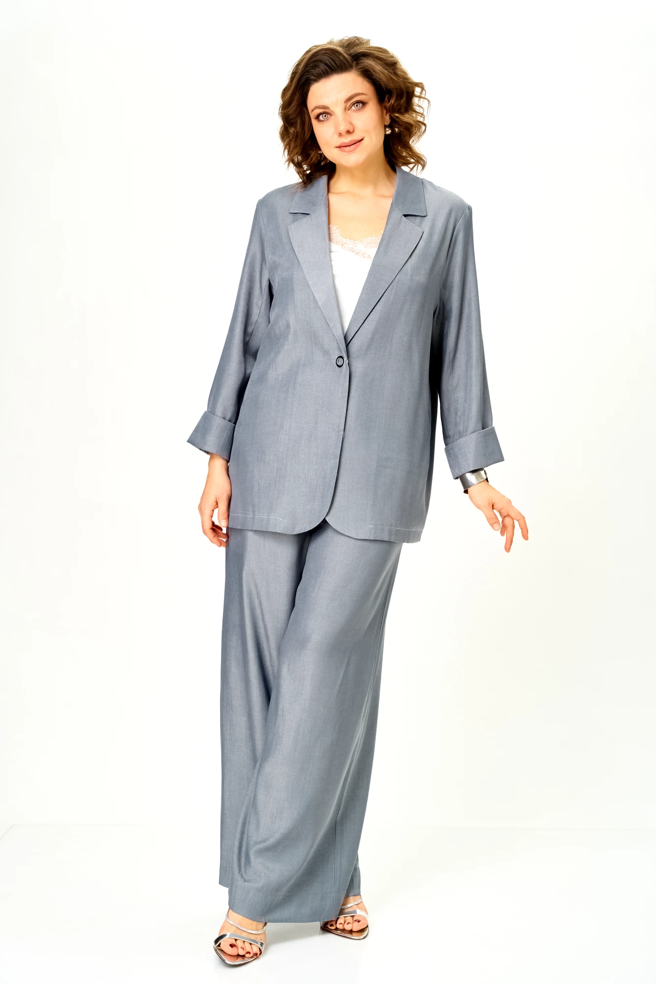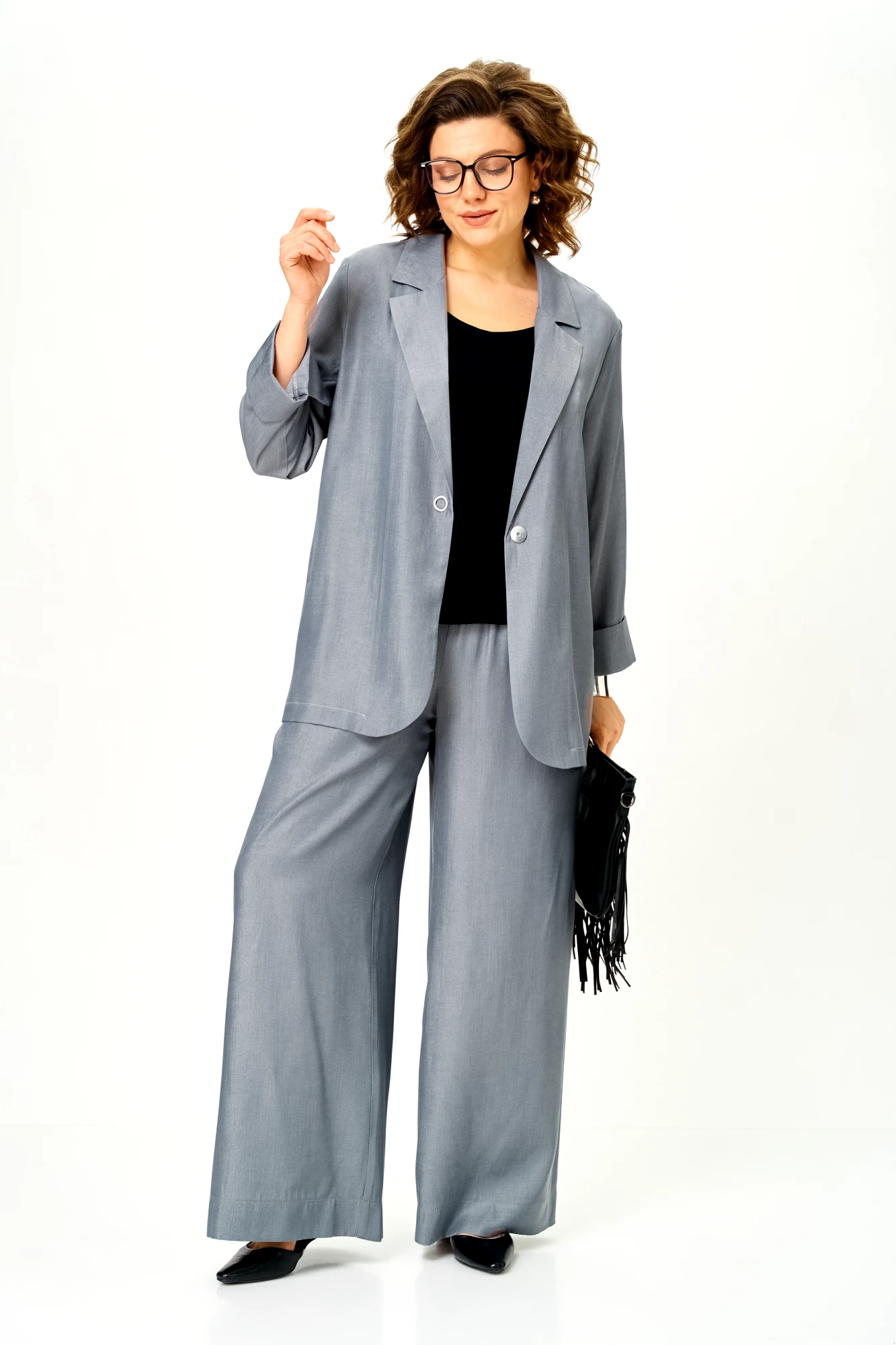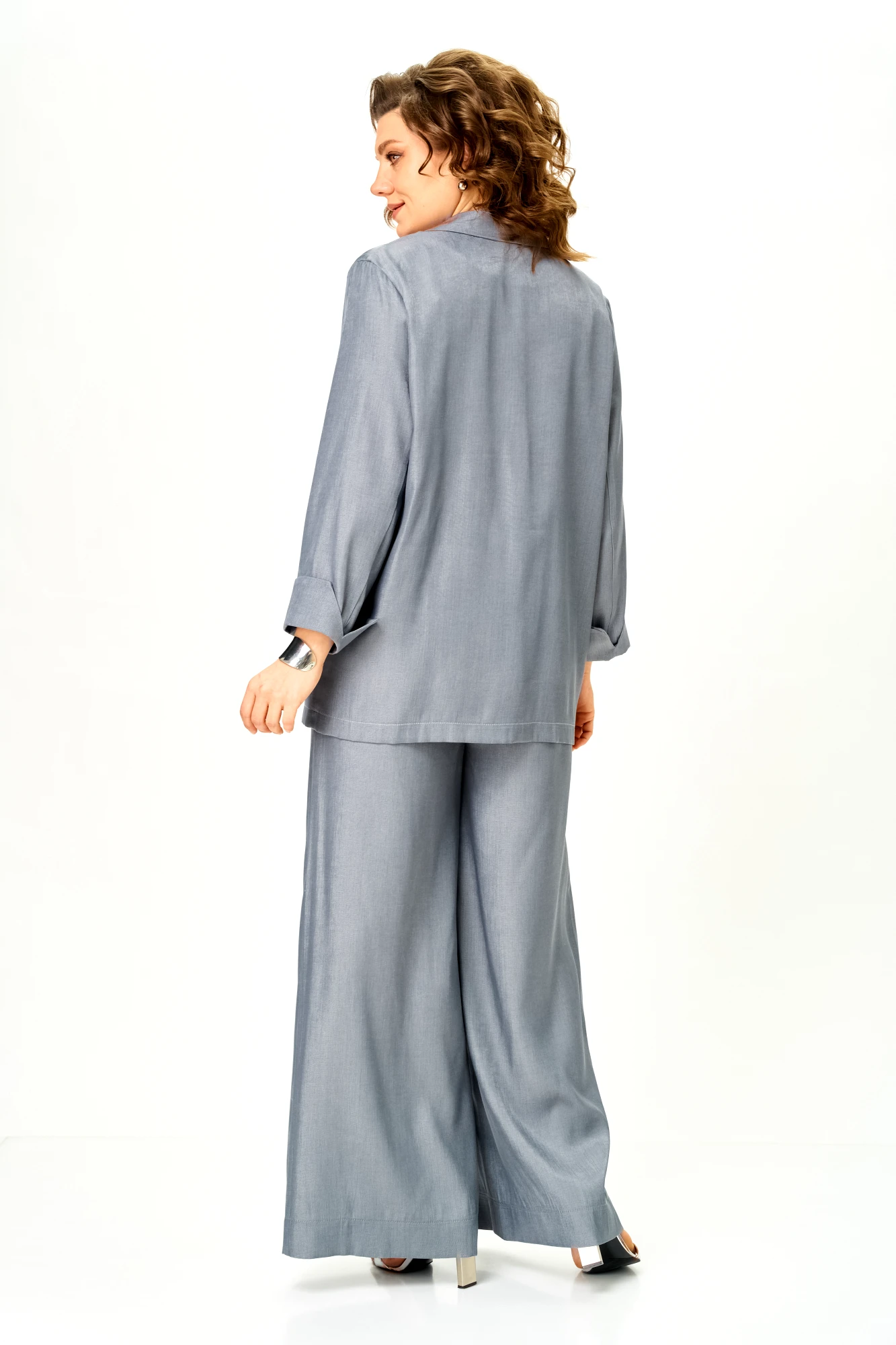 Современный женственный костюм из струящегося тонкого денима стального серого оттенка. Благородный цвет выглядит дорого и легко вписывается в гардероб, позволяя создавать как повседневные, так и более нарядные образы.