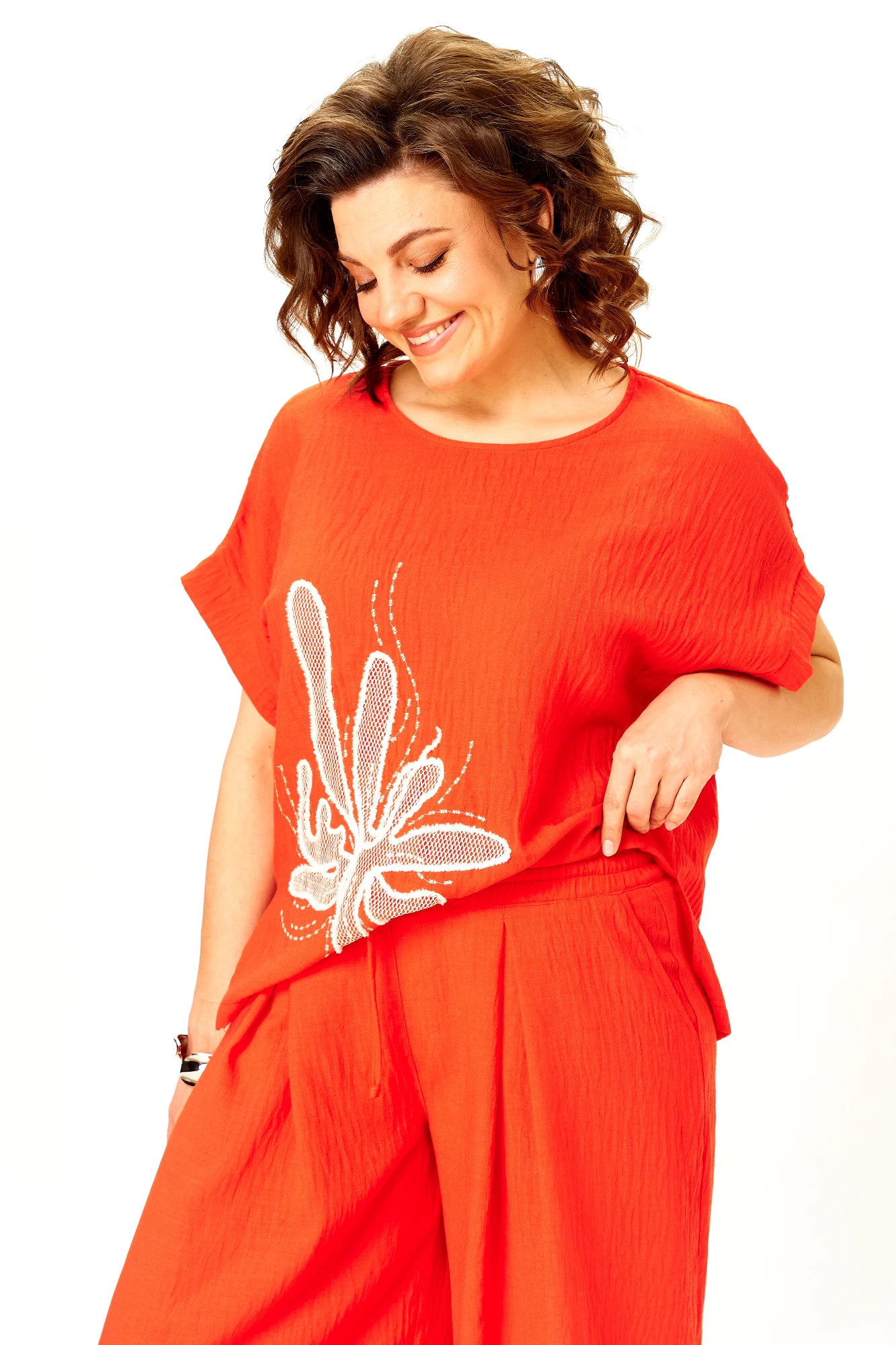 Топ свободного силуэта не сковывает движения и украшен выразительной вышивкой, которая делает образ акцентным и запоминающимся.