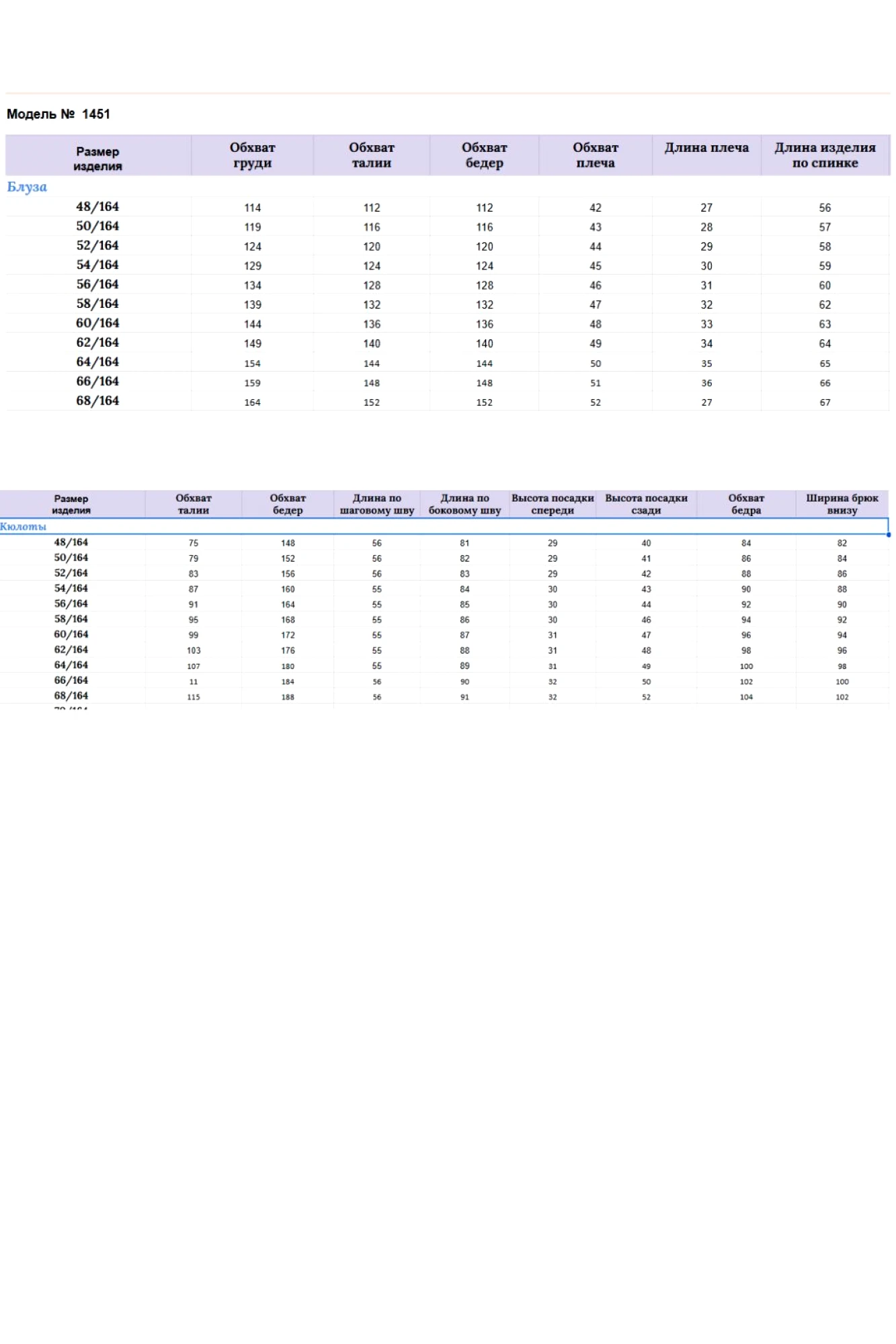 Длина блузы по спинке — 60 см +/- 2-3 см, длина кюлот по шаговому шву 55 см +/- 1-2 см, длина по боковому шву — 86 см +/- 1-2 см.