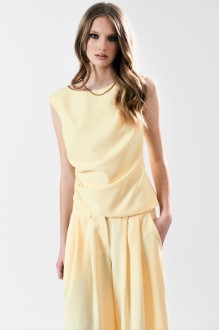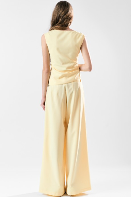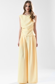 Асимметричный топ полуприлегающего силуэта с чуть спущенной линией плеча с застежкой на потайную тесьму-молнию в боковом шве. Вырез горловины с расширением в зоне плечевых швов. Топ полностью на притачной подкладке. Брюки-палаццо с двумя глубокими встречными складками. Карманы в боковых швах. Сзади для лучшей посадки сделаны выточки. Застежка на брюках крючок и молния.