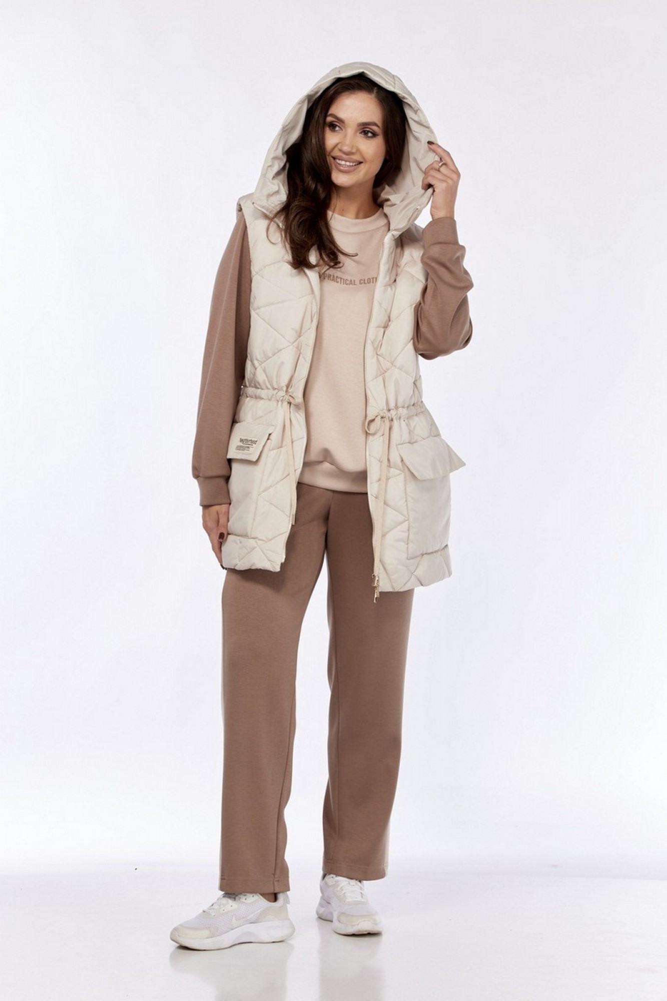 Жилет свободного силуэта, удлиненный, с капюшоном, из стёганой плащёвки с синтепоновым наполнителем (150-зима), на застёжке-молнии. По талии регулируется кулиской и декоративным шнуром с наконечниками. По полочке-накладные карманы.
