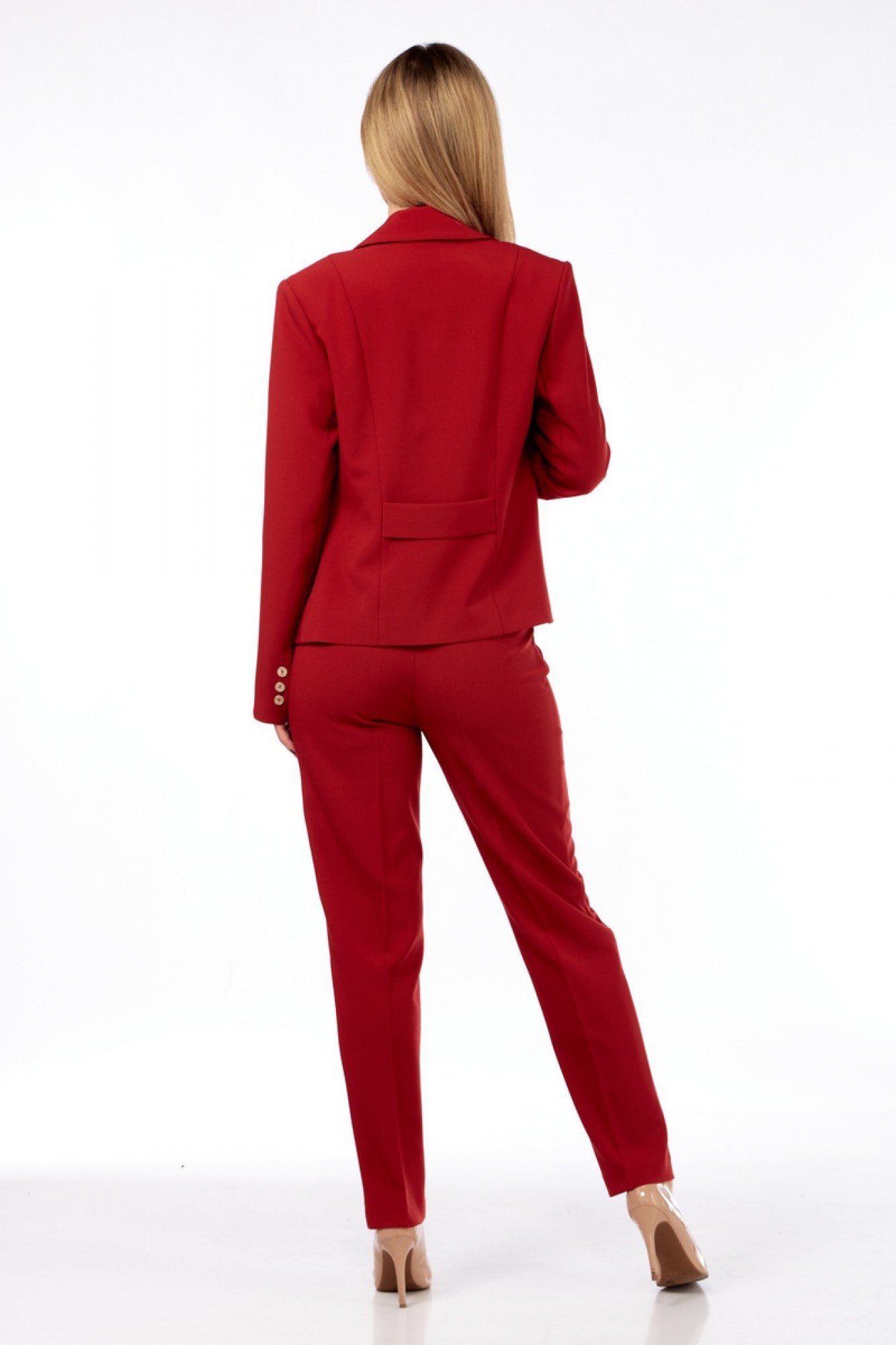 Комплект брючный - трехпредметный. Брюки зауженные к низу, с боковыми карманами, талия оформлена поясом с резинками по бокам. Топ выполнен из креповой ткани, полуприлегающего силуэта на широких бретелях. Жакет полуприлегающего силуэта на подкладке, с отложным воротником и лацканом пиджачного типа, центральная застежка на петли пуговицы. По переду прорезной карман с листочкой, по спинке отделочный хлястик. Рукава втачной, длинный, двухшовный со шлицей, оформленный декоративными пуговицами.