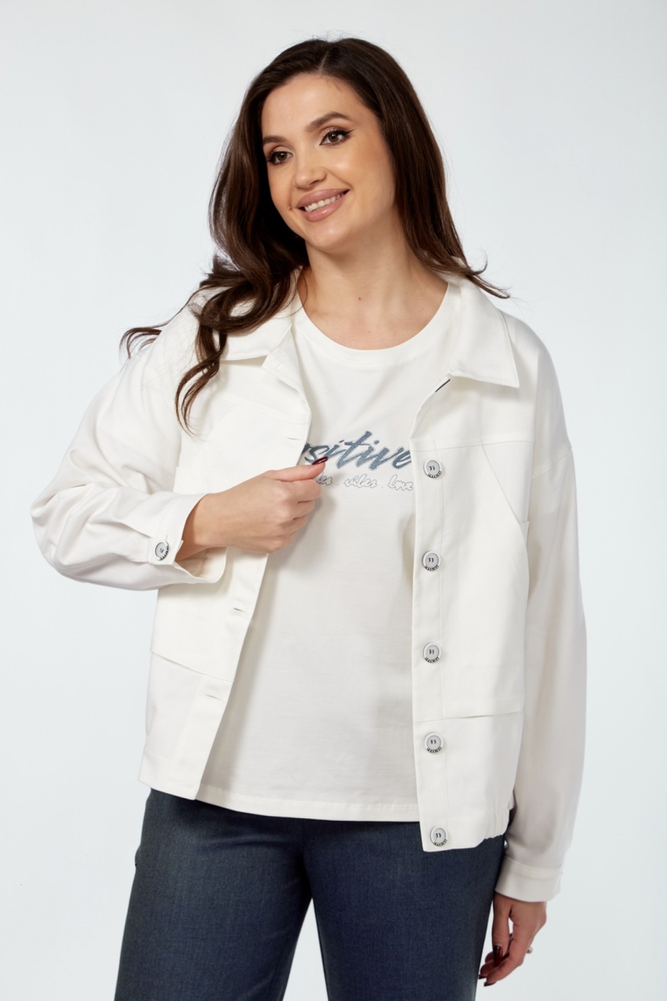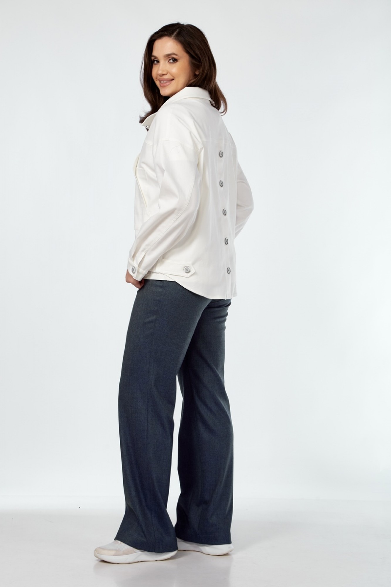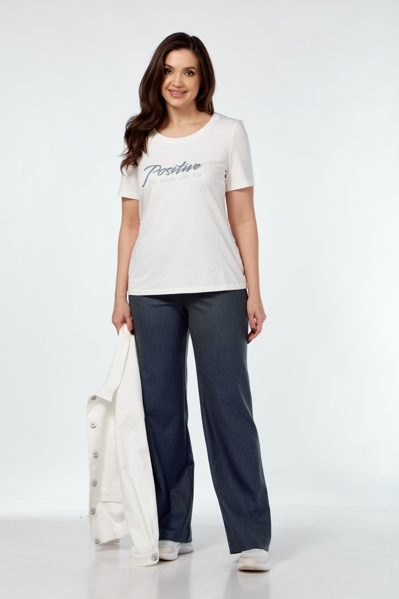 Комплект женский, состоящий из джинсовки, футболки и брюк. Джинсовка свободного силуэта, со спущенным рукавом, на манжете-с застёжкой на петлю-пуговицу. По переду накладные фигурные карманы. По спинке кокетка и декоративная застёжка с пуговицами. Джинсовка с застёжкой на петли-пуговицы, с фигурным низом, по переду-на резинке. Футболка свободного силуэта, рукав короткий, втачной, округлый вырез горловины. Брюки свободного силуэта, по талии на резинке, без застёжки. В боковых швах имитация кармана.