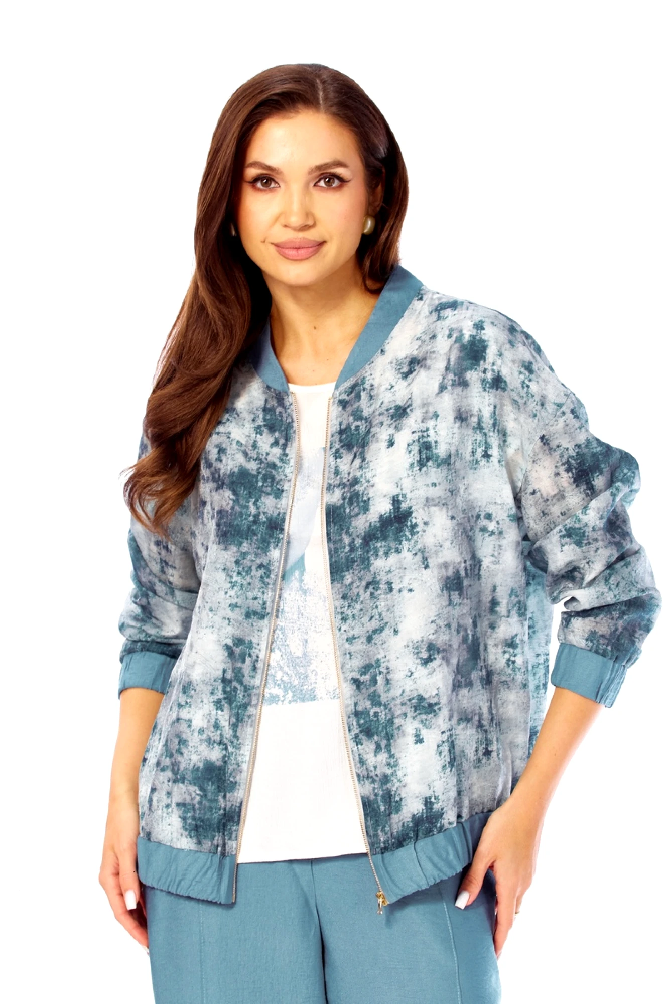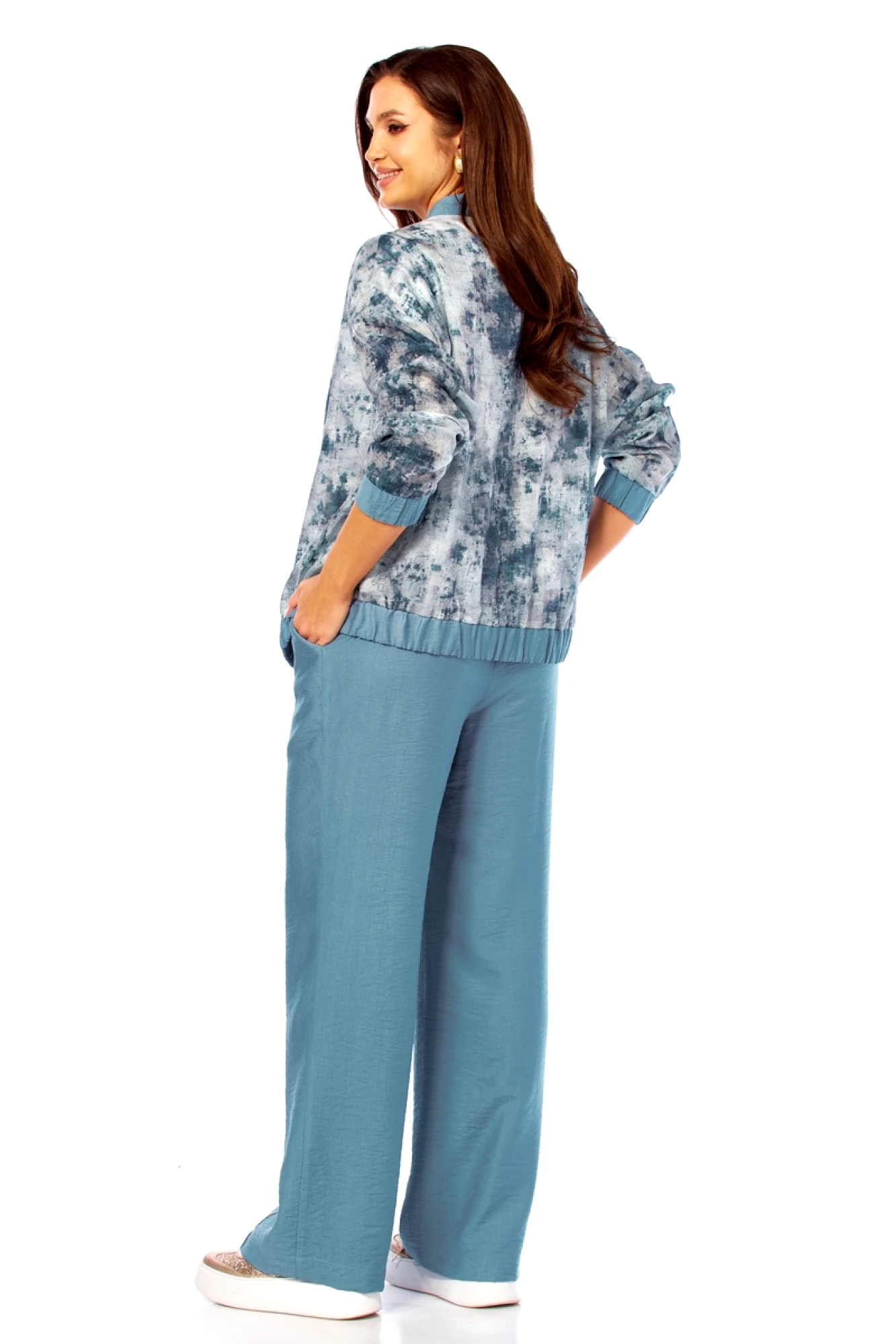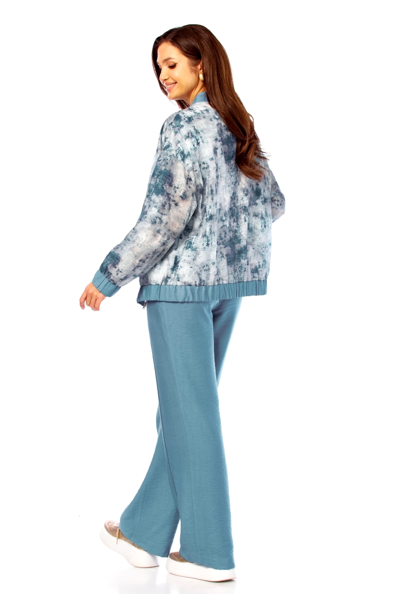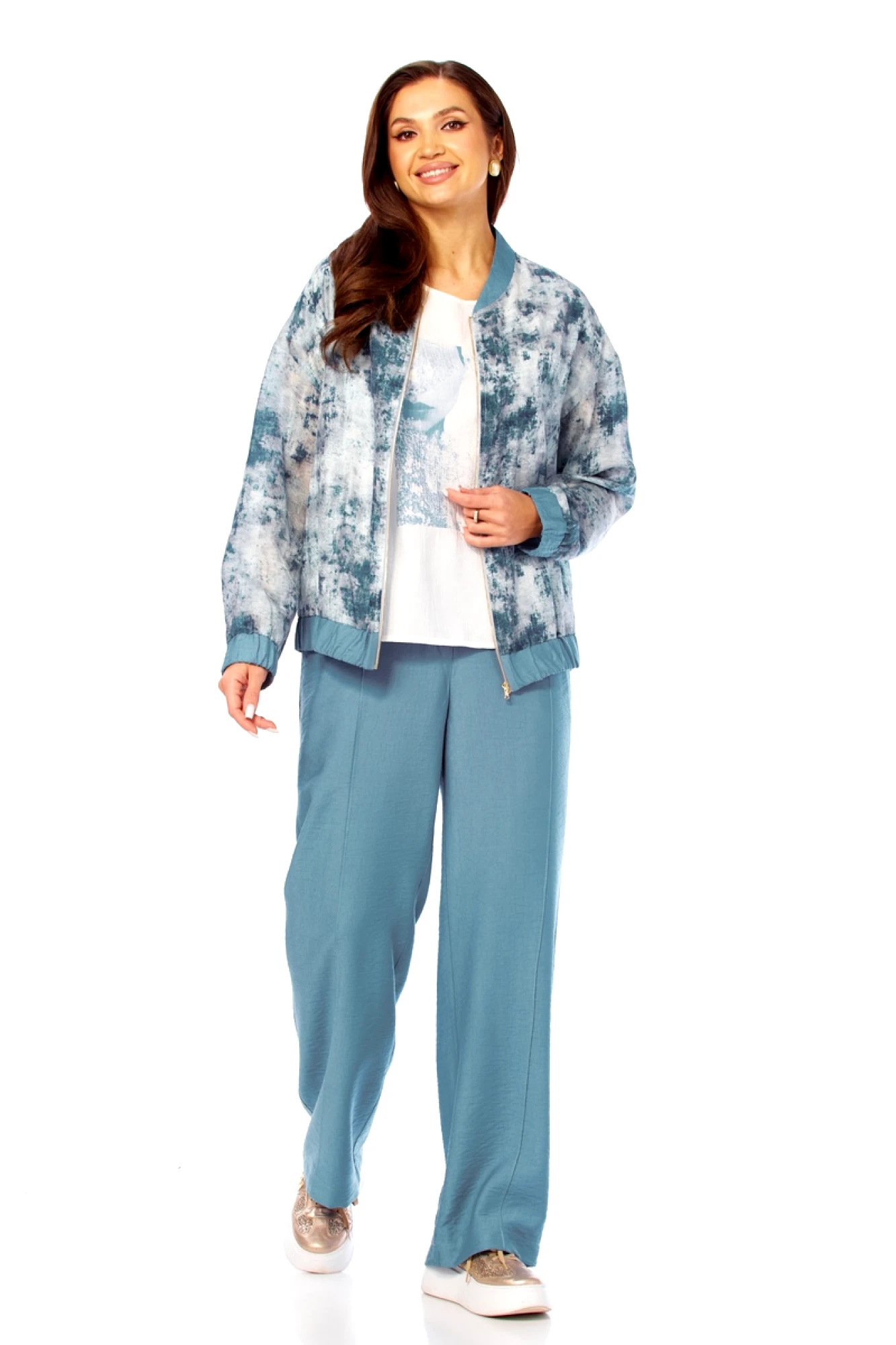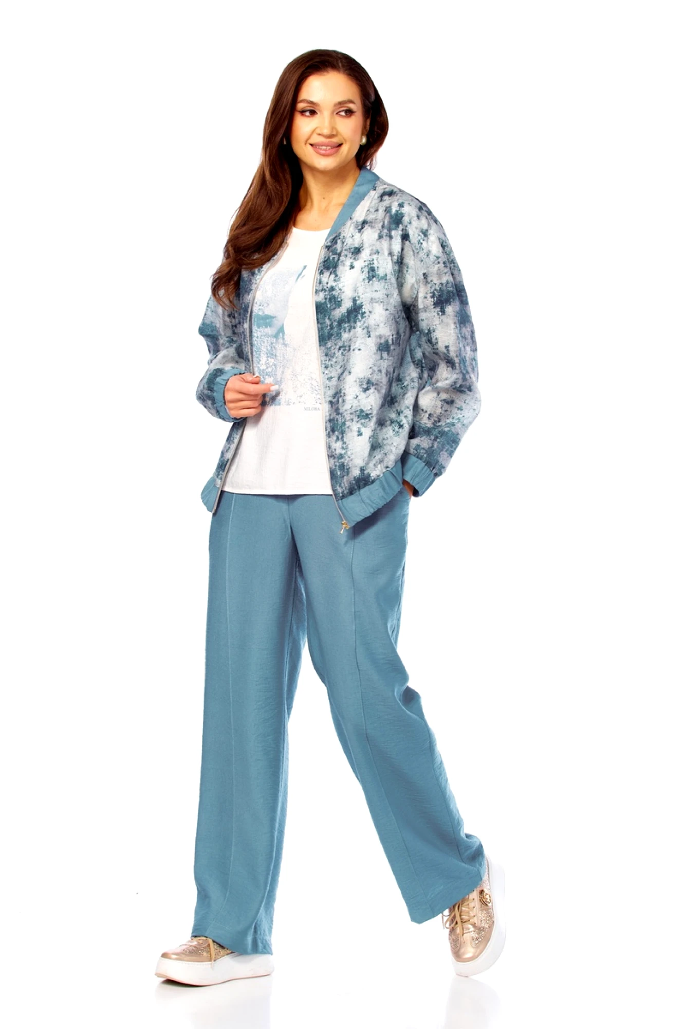 Бомбер: полиэстер - 70%, вискоза - 25%, спандекс - 5%. Майка: вискоза - 87%, нейлон - 13%. Брюки: вискоза - 87%, нейлон - 13%