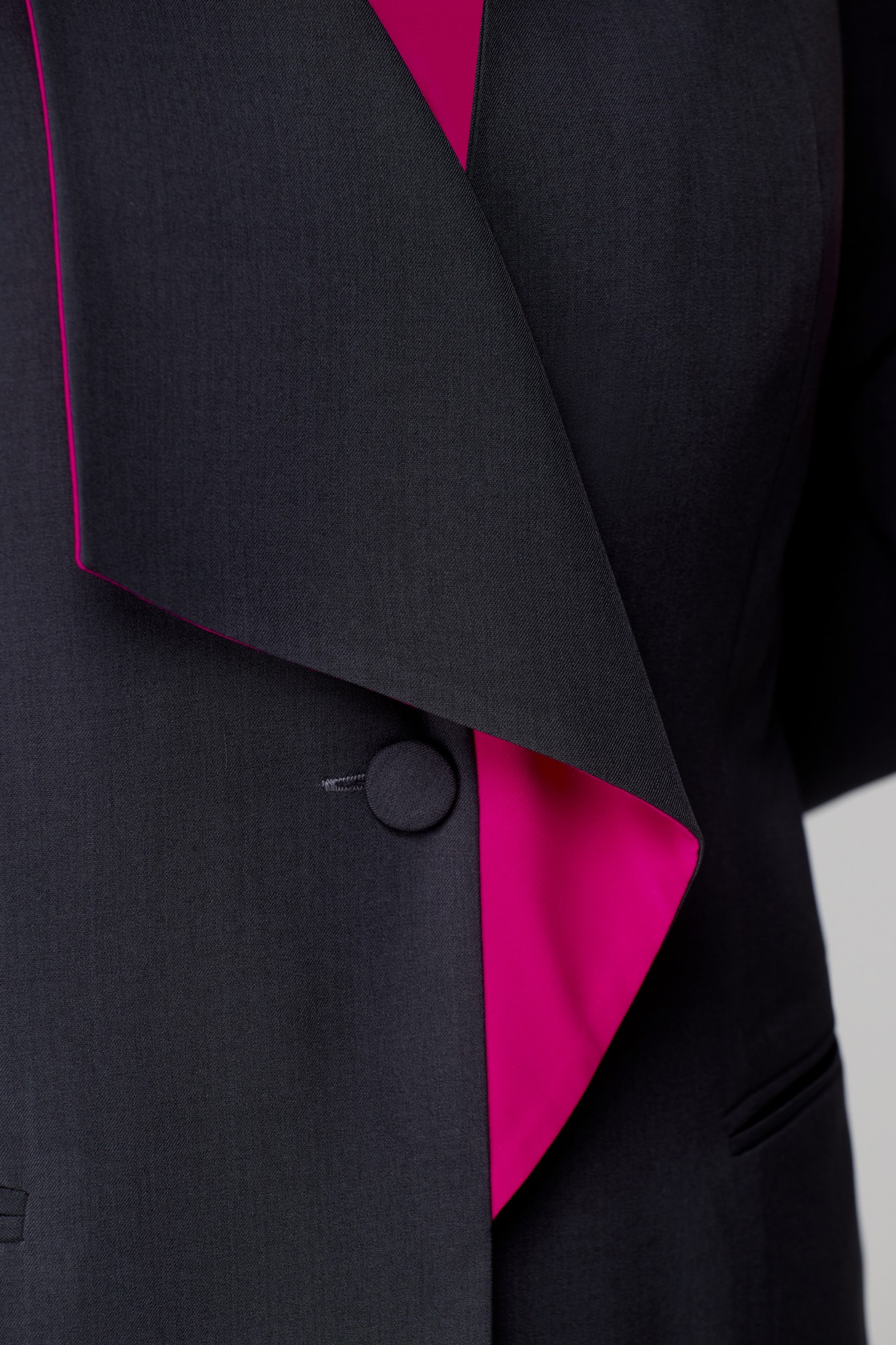 Комплект женский. Жакет на подкладке с центральной застежкой на 1 петлю и пуговицу с асимметричным воротником и контрастной отделкой. По переду функциональные карманы. Спинка с рельефом выходящим из плеча и средним швом. Рукав втачной двухшовный с контрастной манжетой. Блузка с округлым вырезом горловины и спущенной линией плеча. Брюки классические средней посадки с боковыми карманами. Пояс с резинкой по бокам.