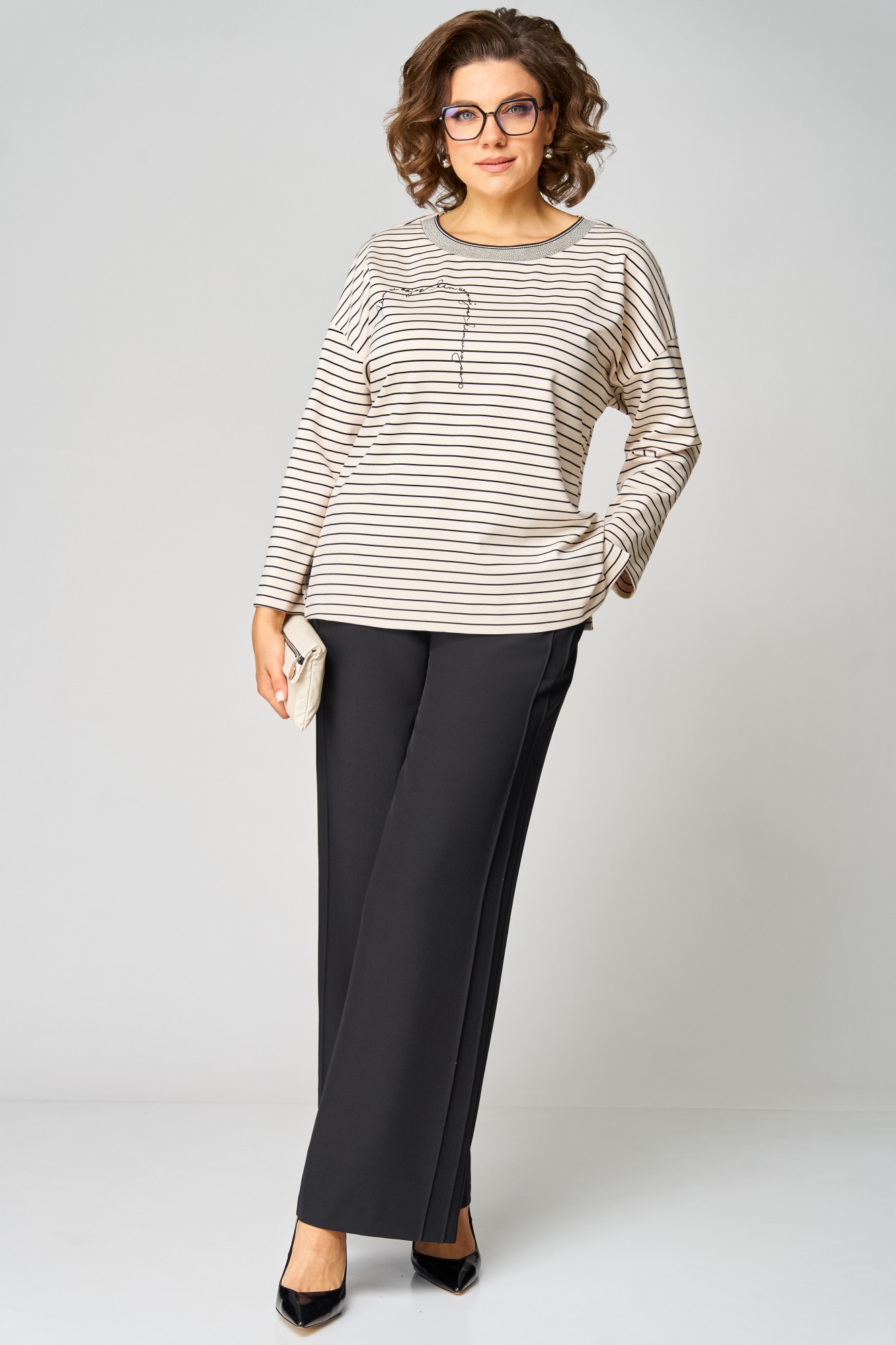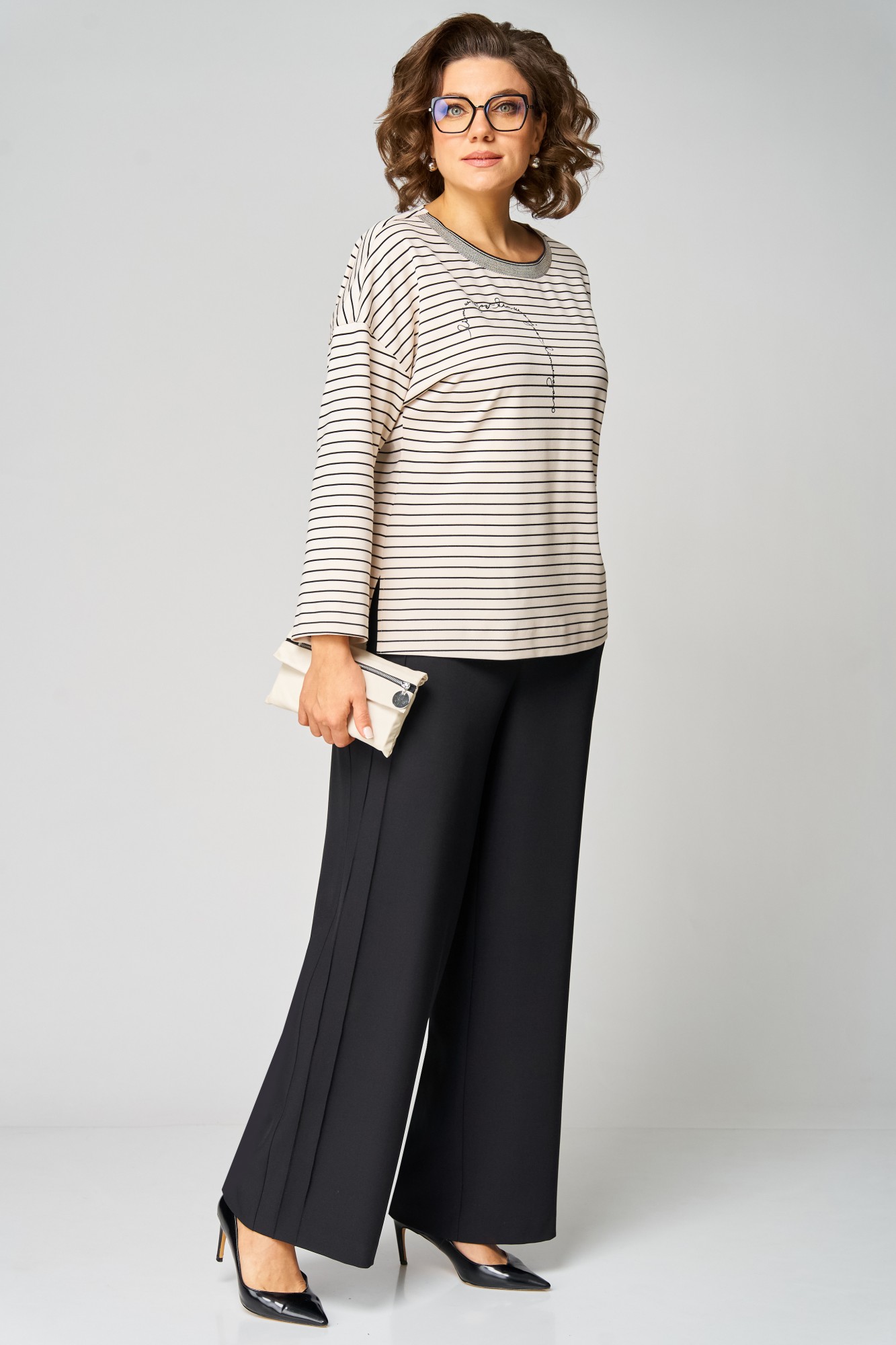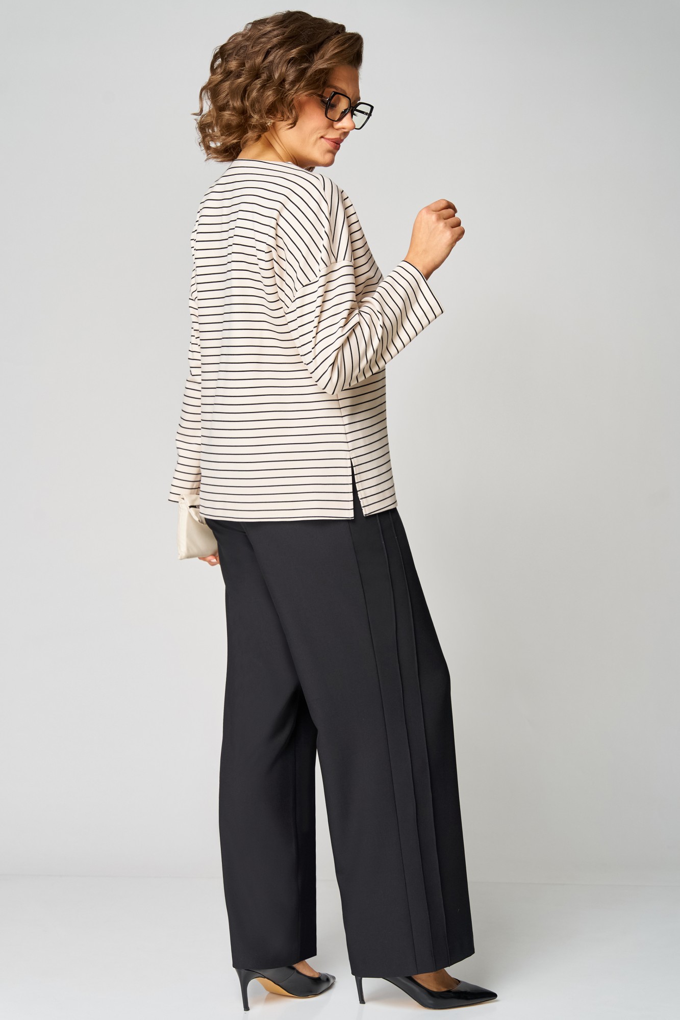 Комплект женский, двух предметный состоящий из туники и брюки. Туника прямого силуэта выполнена из трикотажного полотна « в полоску». Горловина переда обработана довязом, горловина спинки обтачкой. Линия плеча спущена. По переду с правой стороны авторская печать. Рукав втачной, одношовный. По бокам имеются разрезы. Брюки палаццо прямого силуэта на притачном поясе, с застежкой на тесьму- молнию и 1 пуговицу и петлю, с боковыми наклонными карманами на передних половинках брюк . По передним половинкам брюк прострочены 2 канта. Для лучшего прилегания брюк в области талии в поясе со стороны спинки вставлена резинка.