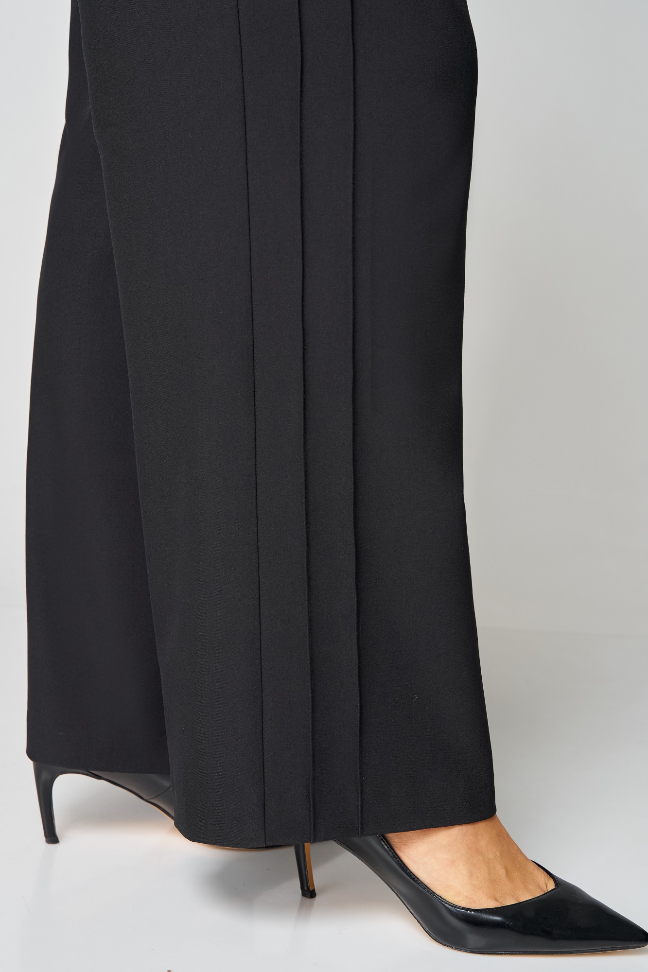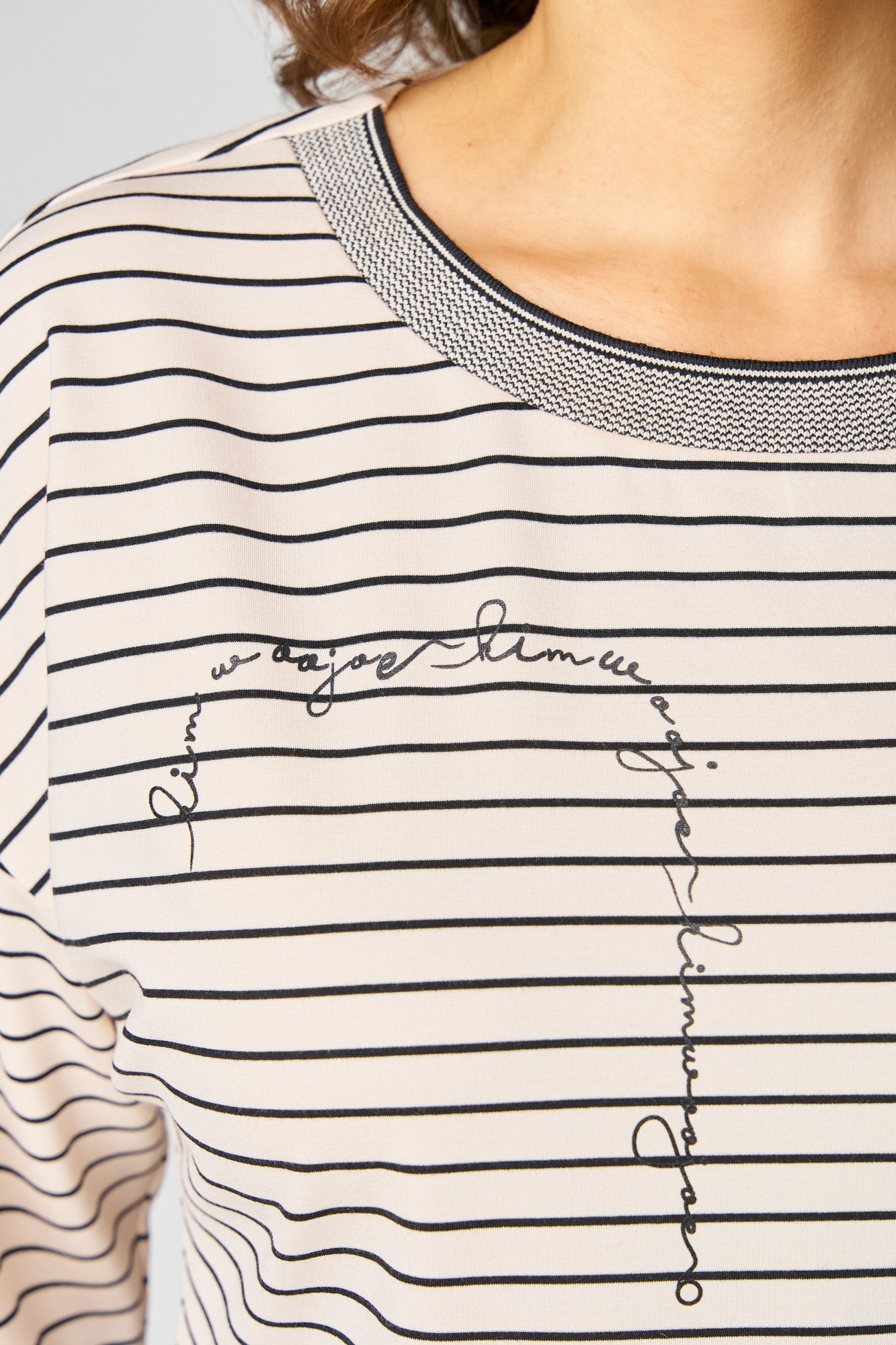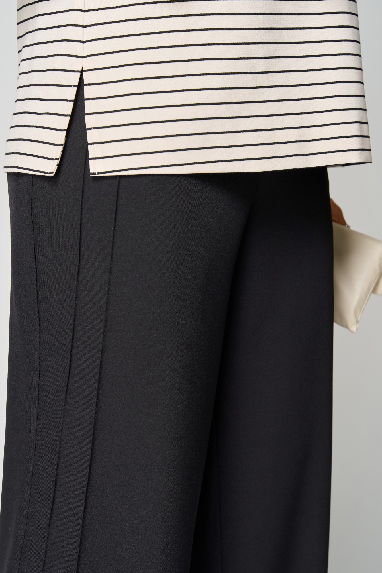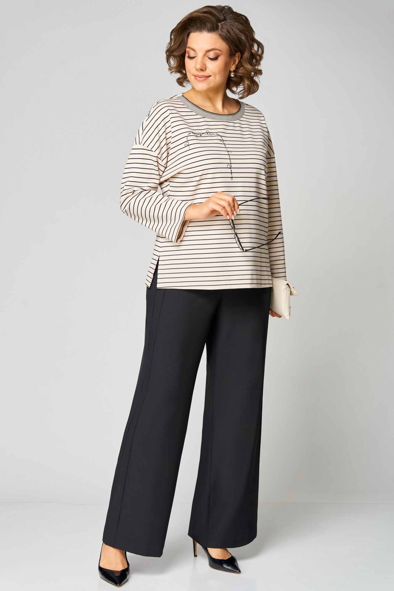 Комплект женский, двух предметный состоящий из туники и брюки. Туника прямого силуэта выполнена из трикотажного полотна « в полоску». Горловина переда обработана довязом, горловина спинки обтачкой. Линия плеча спущена. По переду с правой стороны авторская печать. Рукав втачной, одношовный. По бокам имеются разрезы. Брюки палаццо прямого силуэта на притачном поясе, с застежкой на тесьму- молнию и 1 пуговицу и петлю, с боковыми наклонными карманами на передних половинках брюк . По передним половинкам брюк прострочены 2 канта. Для лучшего прилегания брюк в области талии в поясе со стороны спинки вставлена резинка.
