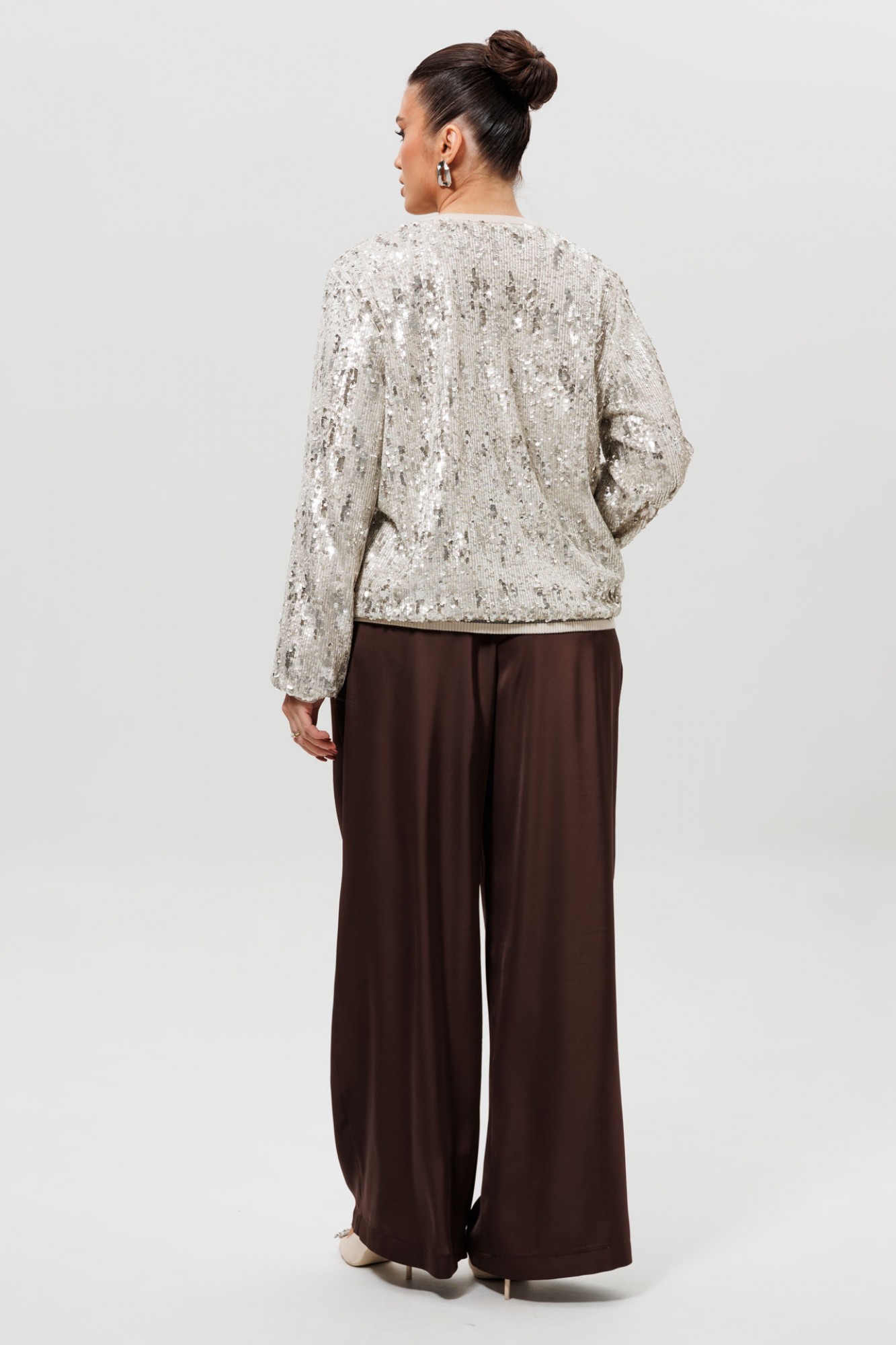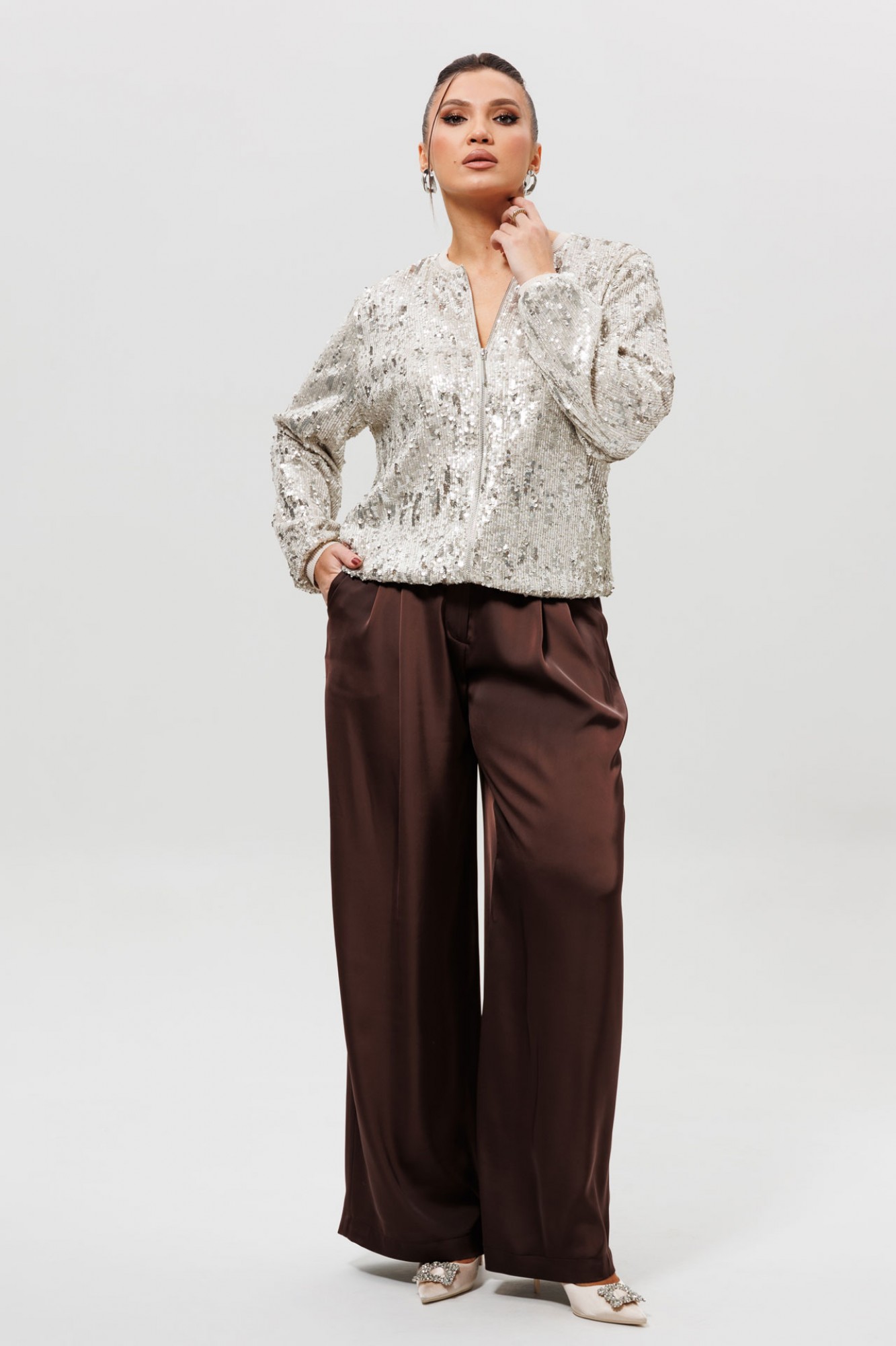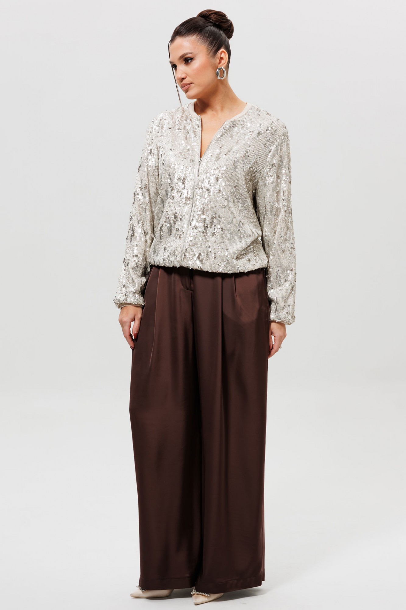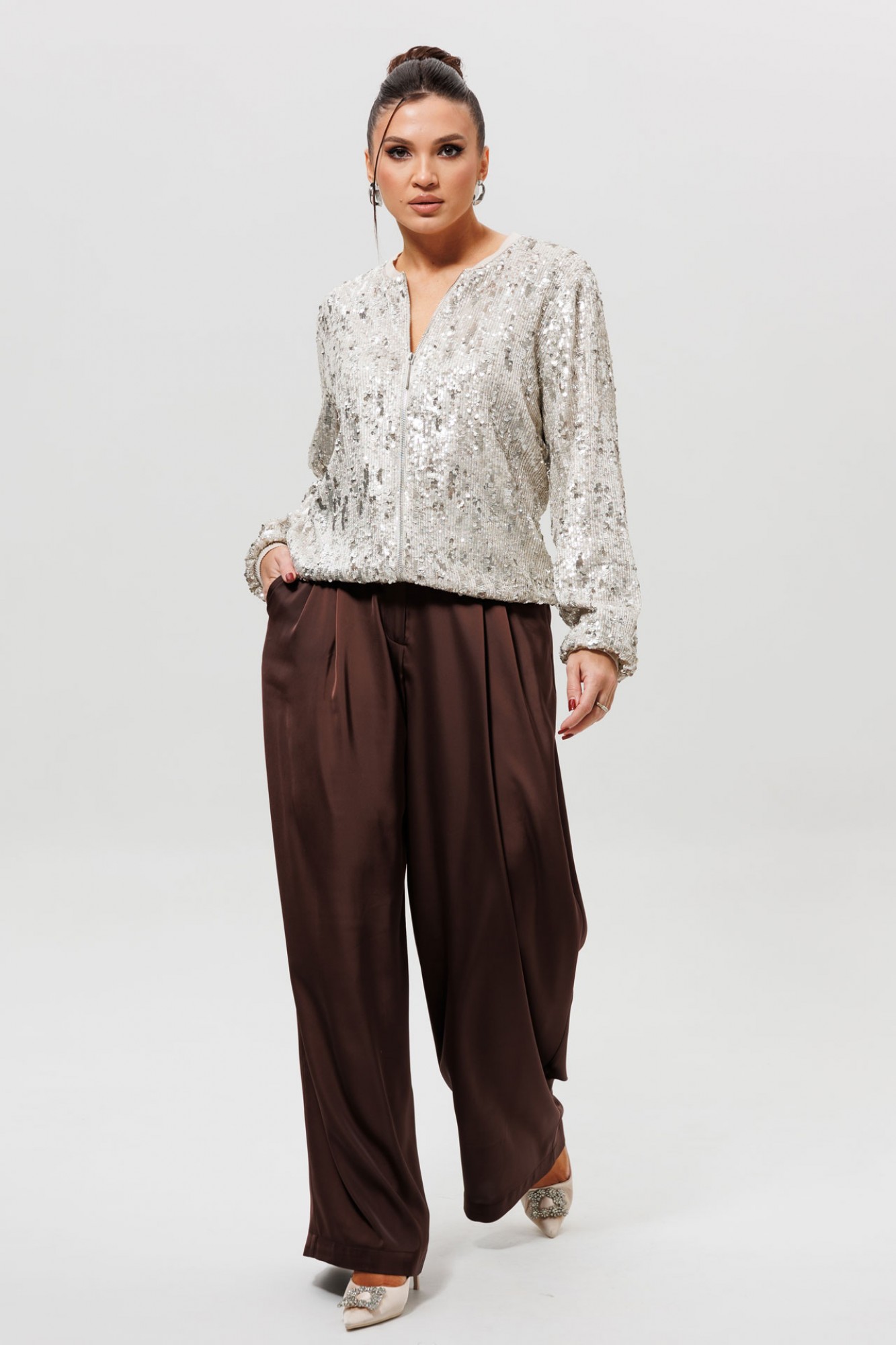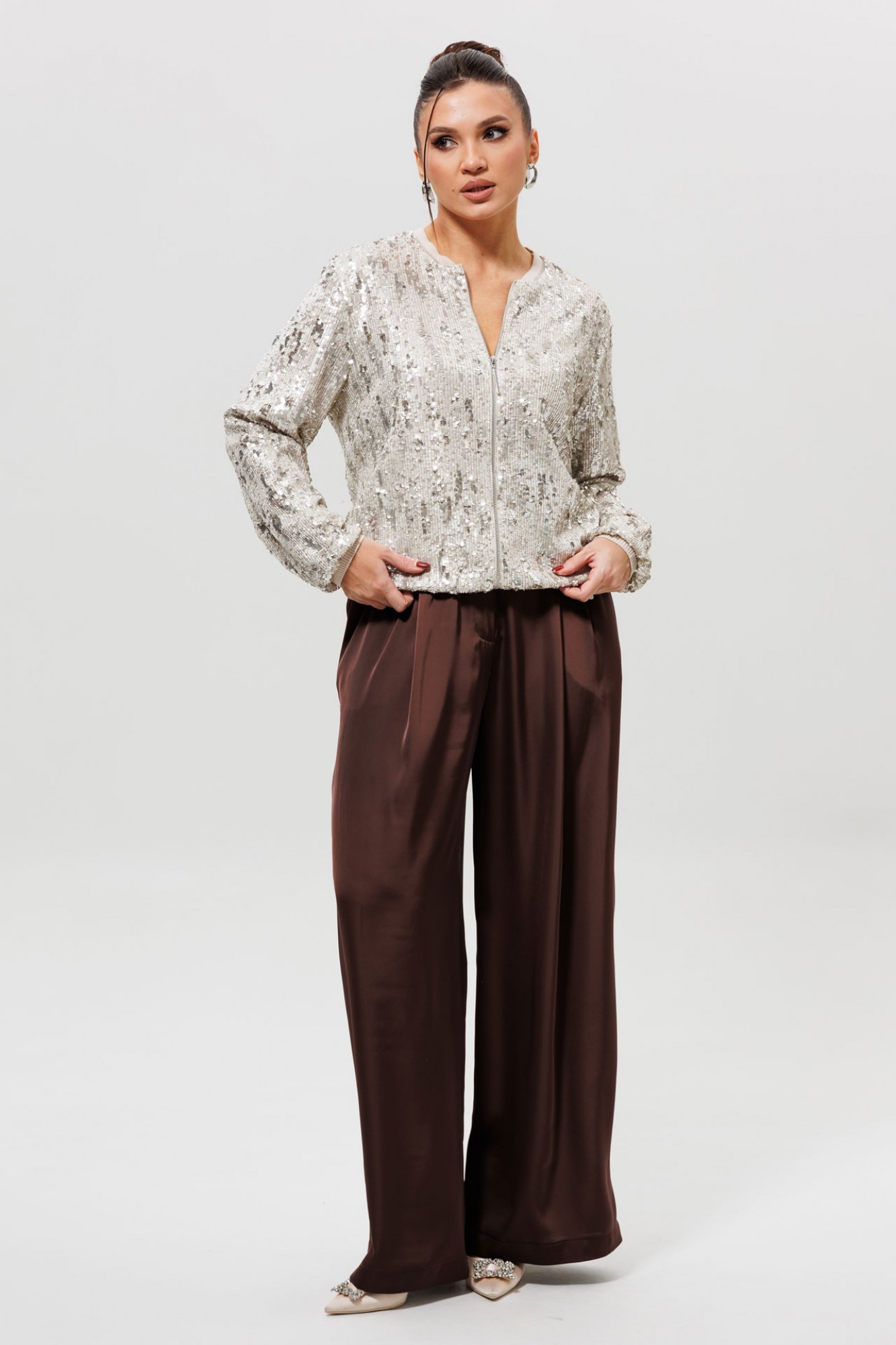 Костюм состоит из жакета и брюк. Жакет(бомбер) полностью покрыт мерцающими пайетками, которые создают неповторимый блестящий эффект при каждом движении. Бомбер с пайетками отлично сочетается с коктейльными платьями, базовыми топами и джинсами, позволяя создавать как дерзкие, так и элегантные луки. Эта пайеточная куртка станет главным акцентом вашего наряда для вечеринки, посещения клуба или романтического свидания. Брюки выполнены из атласной ткани, расширены к низу. На передних половинках брюк обработаны 2 складки и боковые карманы. На задних – талиевые вытачки. Застёжка на молнию и 2 потайных крючка. Эти атласные брюки (Арт. 1282) — Must Have для создания безупречного вечернего или праздничного образа. Модель представлена в двух богатых оттенках: насыщенном красном и глубоком шоколадном. Брюки выполнены из блестящей атласной ткани, которая мягко струится, подчеркивая изящество каждого движения. Атласные брюки с завышенной талией обеспечивают комфортную посадку и визуально вытягивают силуэт. Размеры 46-52.