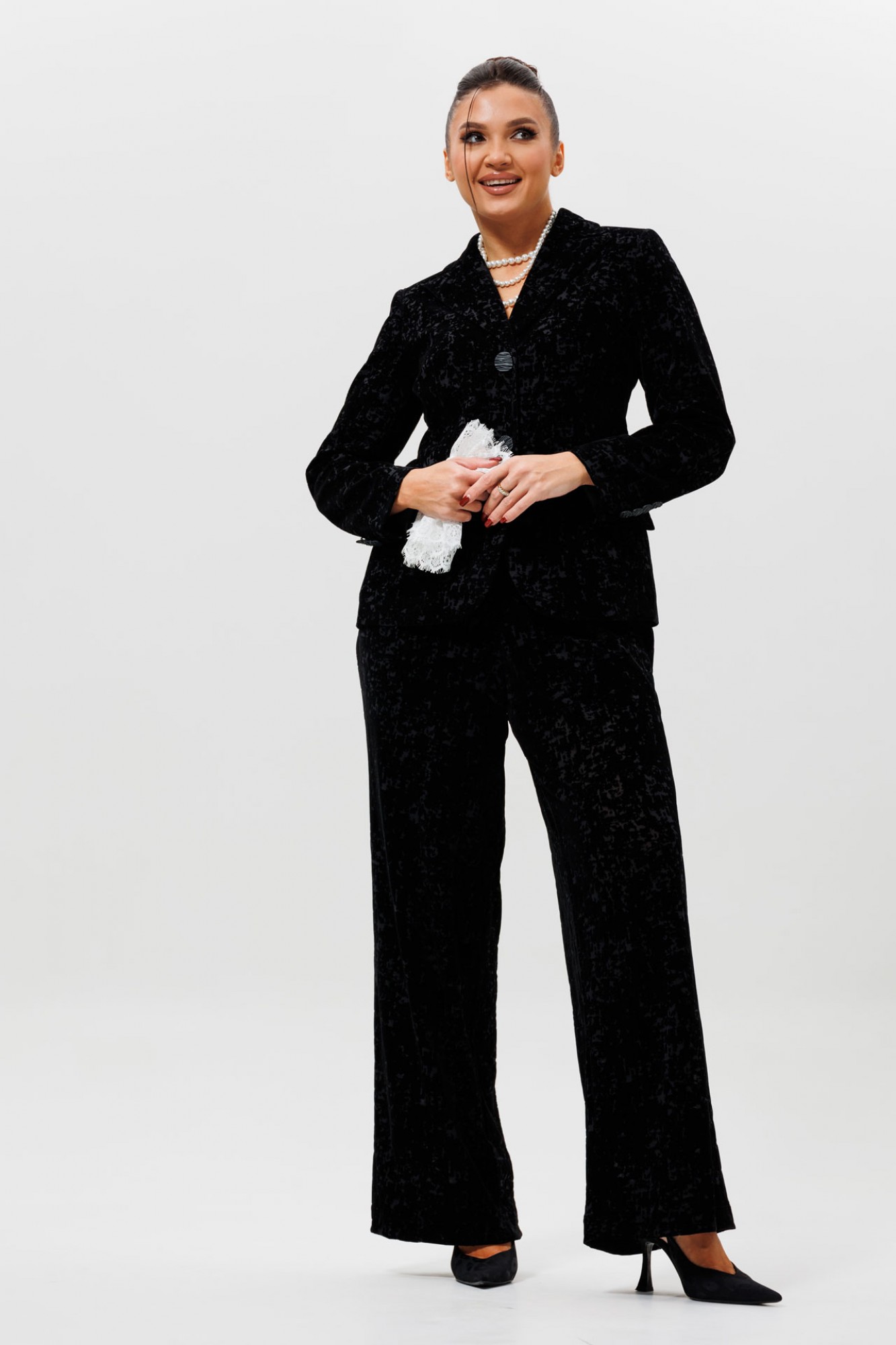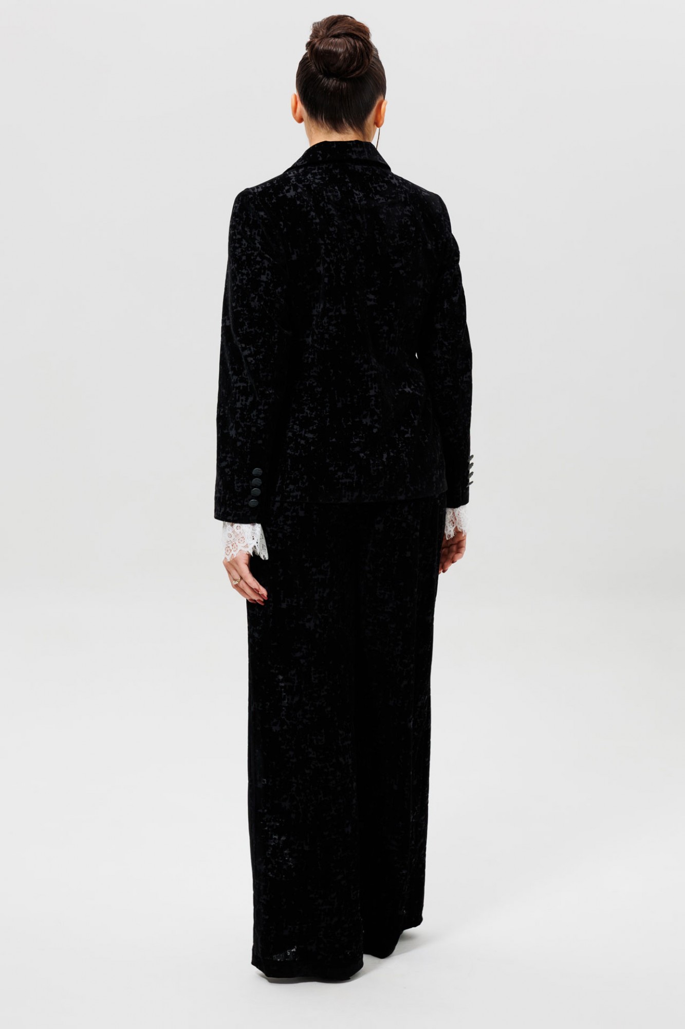 Этот черный бархатный костюм (жакет, манжеты и брюки) — воплощение вечерней элегантности. Комплект из жакета и чуть прямых брюк на подкладке станет основой для безупречного праздничного образа. Жакет с притягивает взгляды и красиво переливается при свете софитов и вечерних огней, делая его идеальным выбором для выхода в ресторан, театр или на новогодний корпоратив. Крой жакета позволяет комбинировать его с брюками и юбками с высокой талией, визуально вытягивая силуэт. Бархатные брюки (на резинке) прямого кроя выгодно оттеняют нарядный верх и обеспечивают комфорт. Такой костюм для праздника можно носить с кружевной или шелковой блузкой, создавая разные стилистические вариации. Этот элегантный костюм подчеркнет ваш безупречный вкус и станет выигрышной инвестицией в гардероб. Дополняют модель кружевные манжеты, которые фиксируются по руке на резинку.