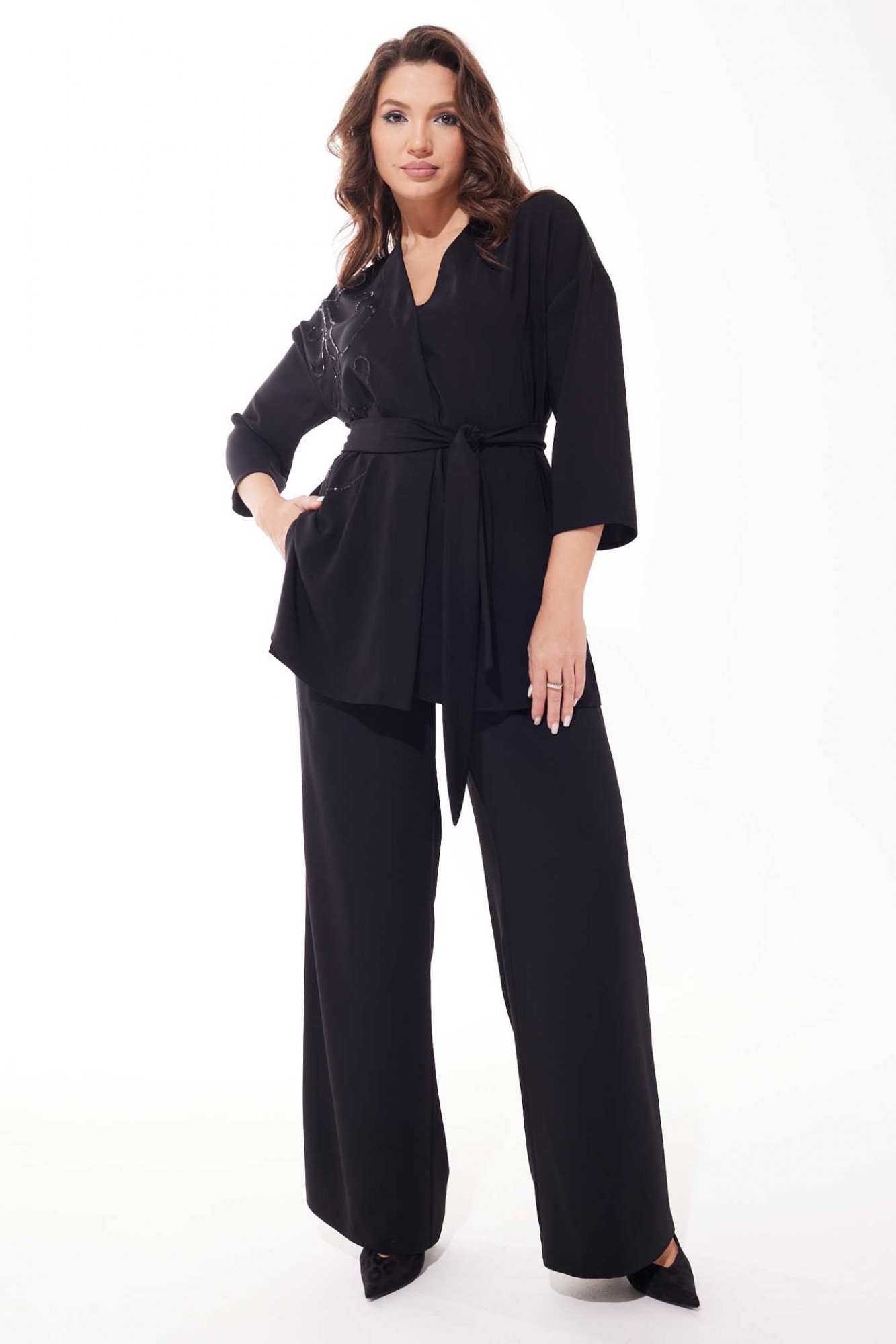 Костюм женский, состоящий из жакета и брюк. Жакет прямого силуэта с V-образным вырезом, спущенный рукав. У жакета центральная застежка на потайные кнопки. На правой полочке декоративная вышивка из пайеток. В боковых швах обработаны разрезы. Брюки палаццо, на притачном поясе с резинкой и тесьмой. У брюк - боковые карманы.