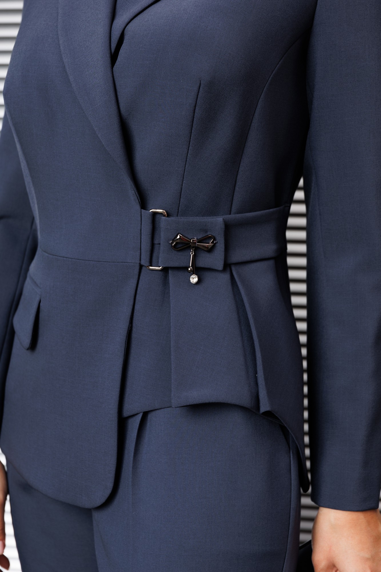 Двухпредметный комплект, который состоит из жакета и брюк. Жакет полуприлегающего силуэта с ассиметричной полочкой, на которой выполнен карман в рамку. Рукав втачной, двухшовный. Спинка со средним швом и таллиевыми вытачками. Воротник пиджачной формы. Жакет на подкладке. Брюки прямые, по низу с манжетой, сверху на притачном поясе-кокетке, по бокам с карманами. Застежка на тесьму-молнию в среднем шве.