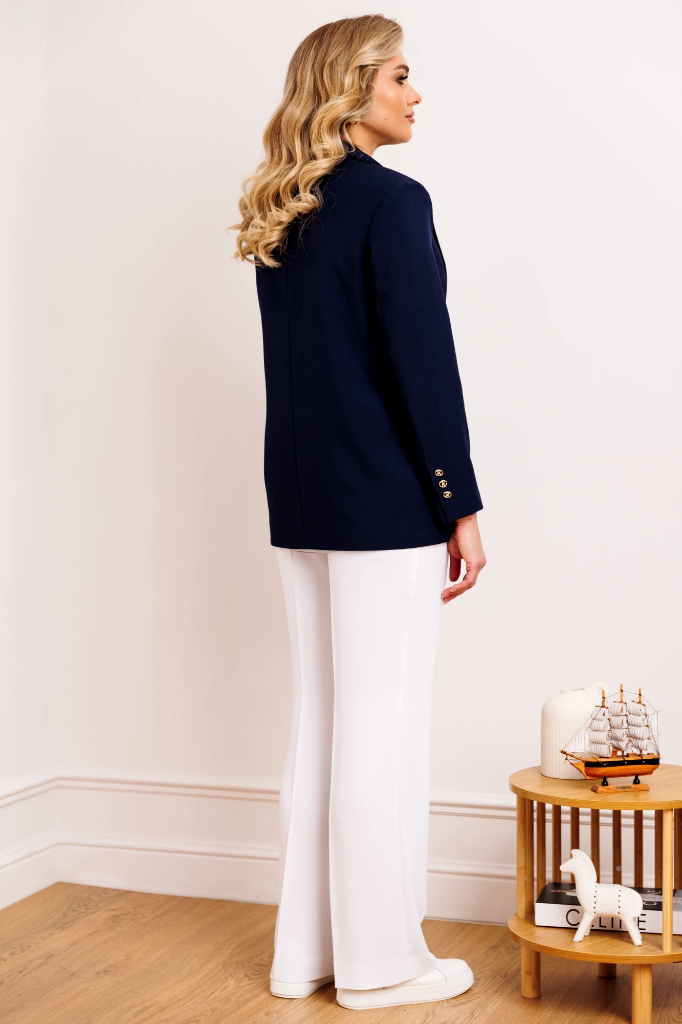 Брюки: ПЭ 96%, спандекс 4% Жакет: ПЭ 65%, вискоза 33%, спандекс 2% Топ: ПЭ 95%, эластан 5%