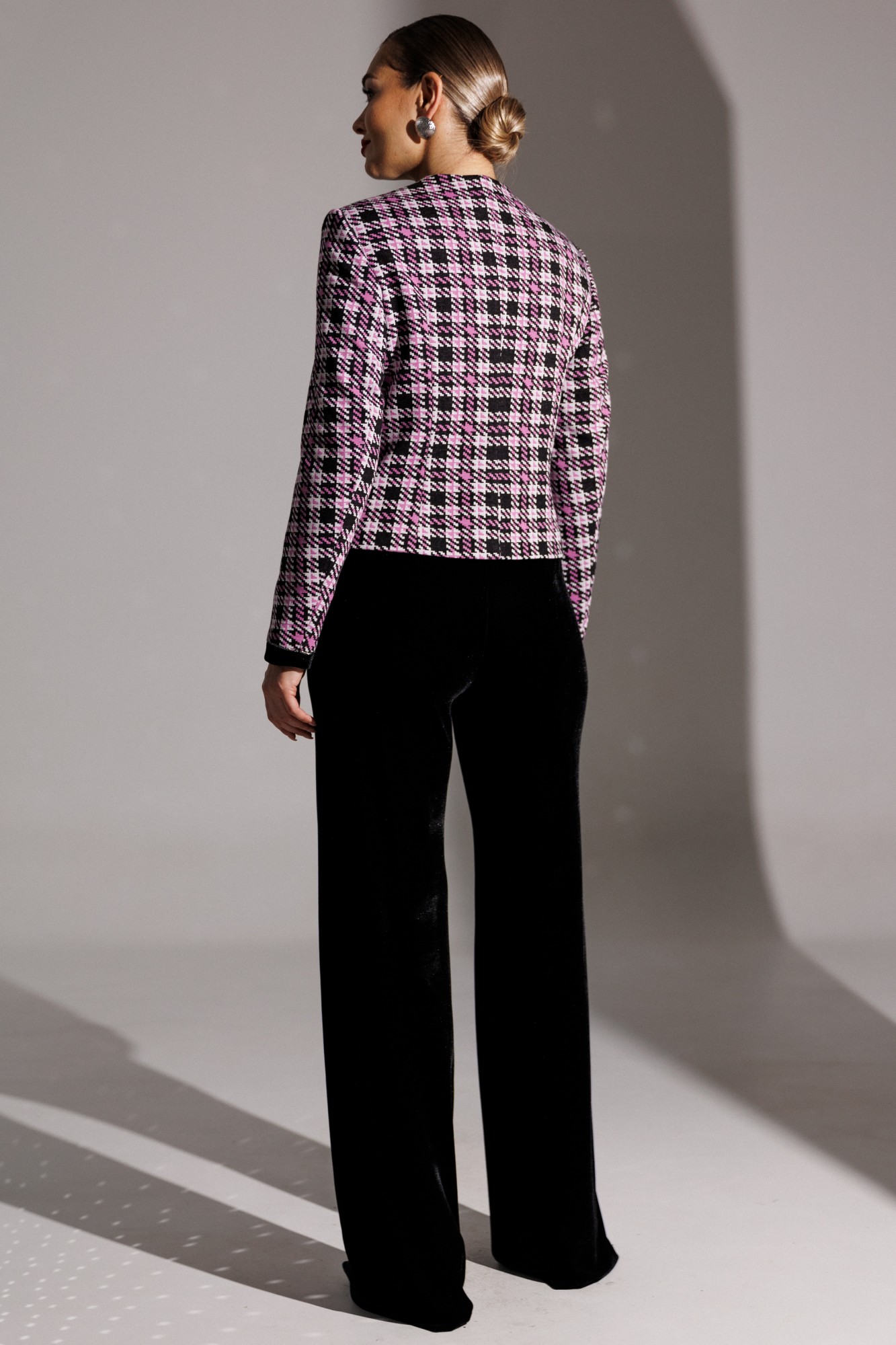 Брючный костюм в стиле Шанель представляет собой элегантное сочетание классики и современности. Жакет выполнен из трикотажного полотна с актуальным принтом «гусиная лапка», имеет полуприлегающий силуэт и центральную застежку на пуговицы. Спинка оформлена средним швом и таллиевыми вытачками, что обеспечивает идеальную посадку. Передняя часть также украшена таллиевыми вытачками, а округлая горловина подчеркивает женственность образа. Функциональные карманы с листочками расположены внизу, в то время как имитация карманов в верхней части переда добавляет изюминку. Листочки на карманах и планка горловины выполнены из бархата с отделкой по краям, создавая контраст текстур. Рукава втачные, двухшовные, с планкой по низу, также отделанной бархатом. Жакет на подкладке, что обеспечивает комфорт при носке. Брюки палаццо из бархата имеют стильные широкие штанины и удобную резинку на поясе, что делает этот костюм идеальным выбором как для деловых встреч, так и для вечерних выходов.