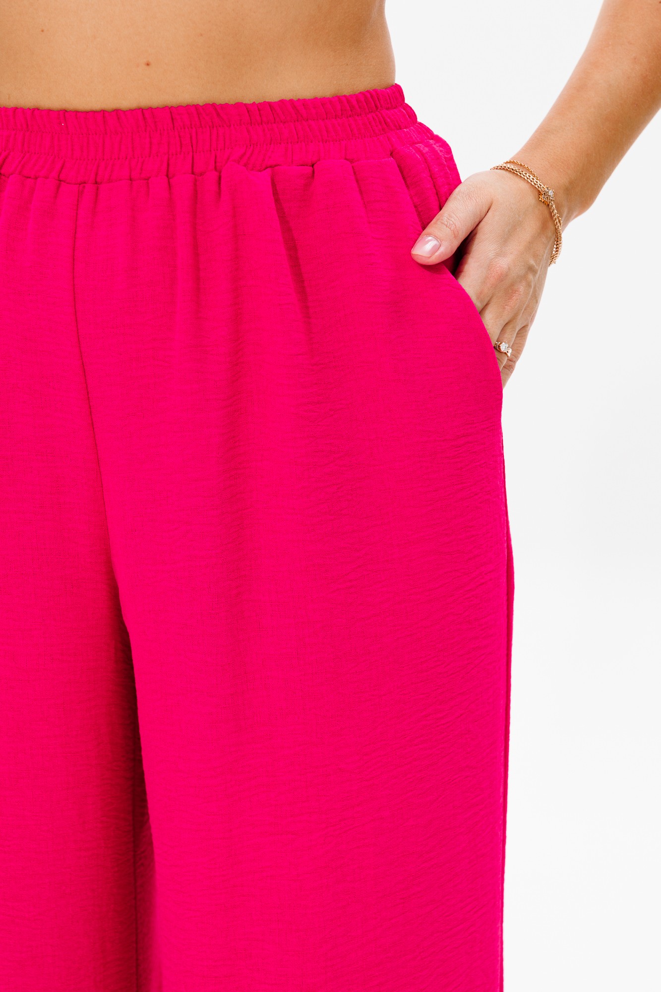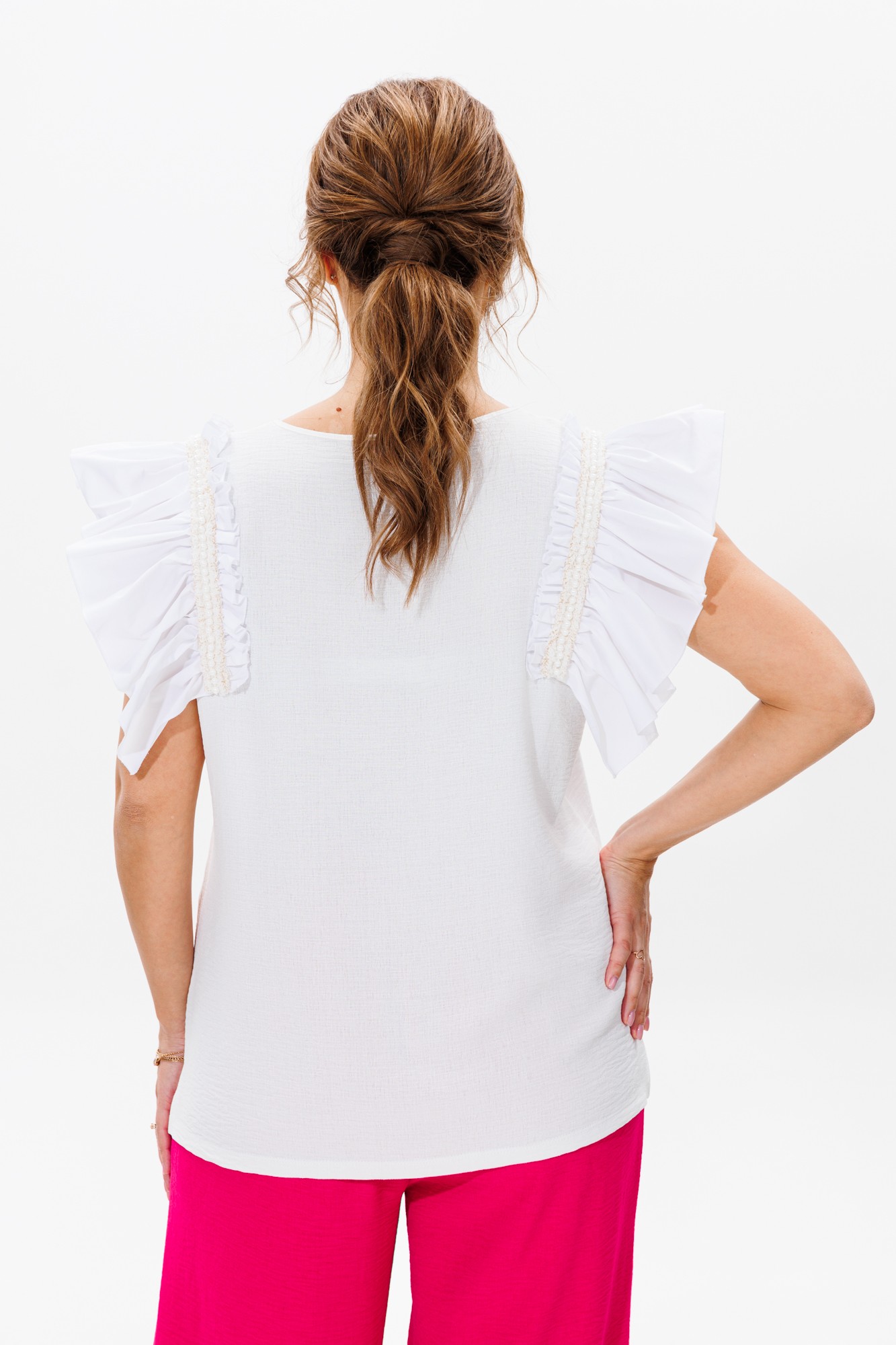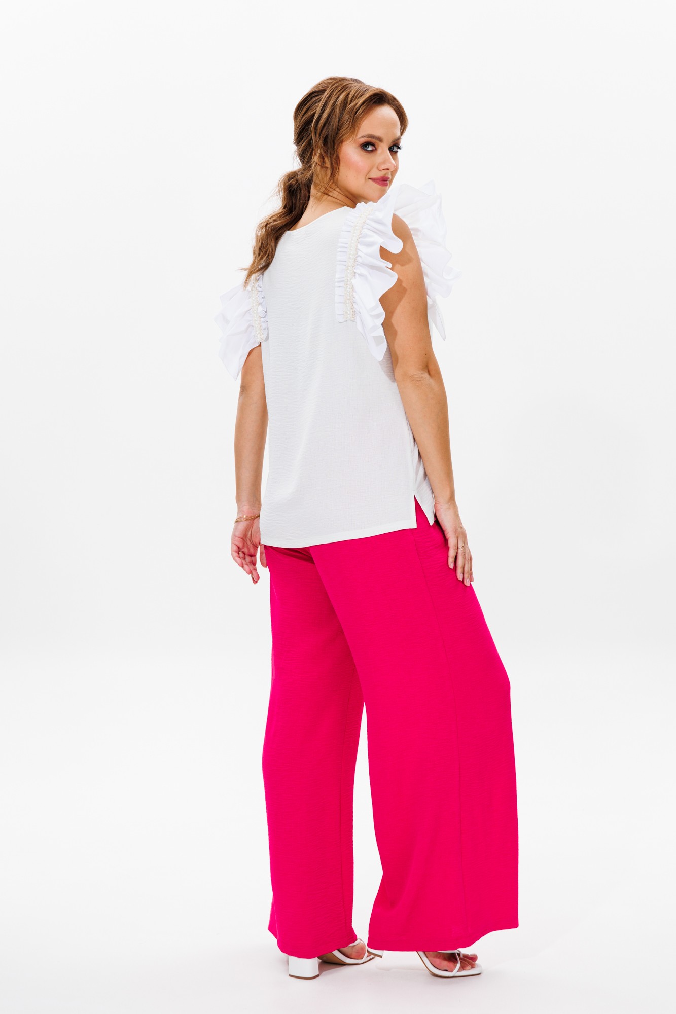 Летний женский костюм, состоящий из брюк и нарядной блузы, выполненный из костюмно-блузочной ткани (тянется). Блуза прямого силуэта с разрезами по бокам. Горловина округлой формы, обработанная окантовкой. Рукава в блузе в виде рюши из тафты, которые декорированы тесьмой с бусинами. Брюки прямого свободного кроя с высокой посадкой. В боковых швах наклонные карманы. Верхний срез оформлен поясом с эластичной резинкой.
