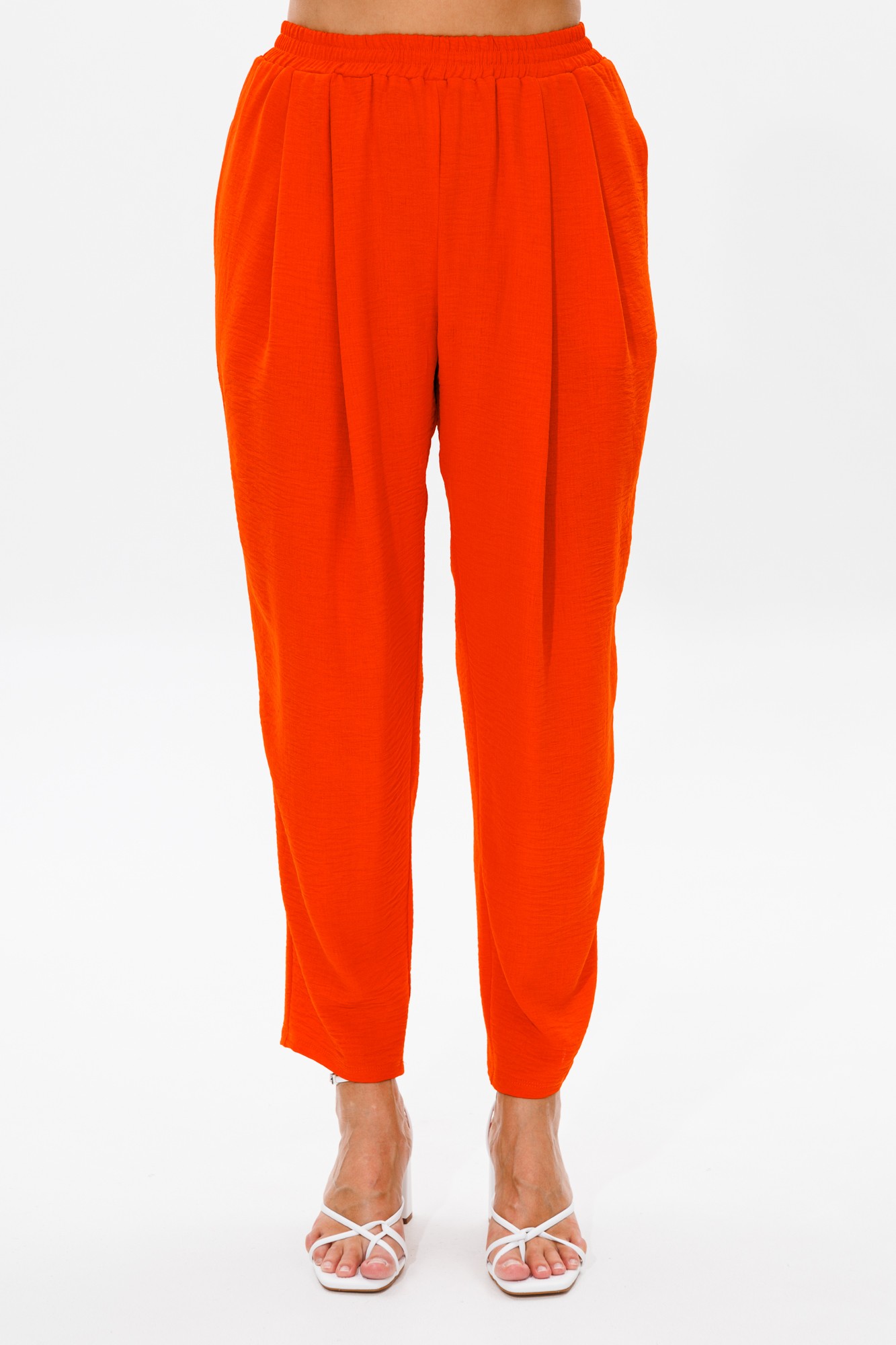Брюки-«бананы» с высокой посадкой. В боковых швах наклонные карманы. По передним