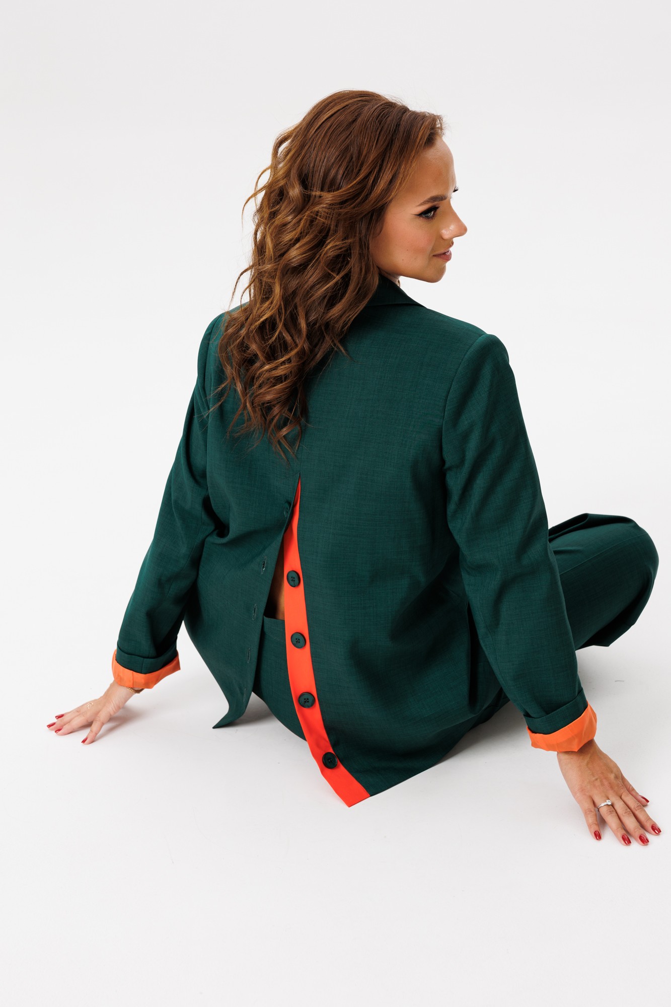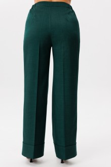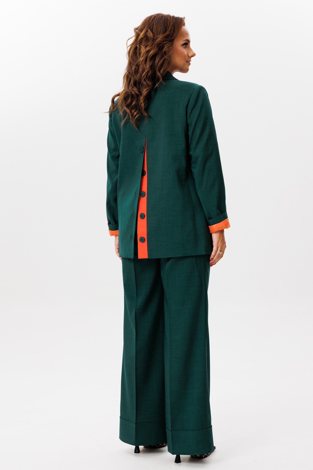 Жакет прямого кроя на подкладке. По переду нагрудные вытачки, функциональные карманы с листочкой, центральная двубортная застежка на петли-пуговицы. Горловина оформлена воротником пиджачного типа с лацканом. Спинка со средним швом, шлицей-планкой из отделочной ткани, застегивающейся на петли-пуговицы. Рукава втачные, двухшовные. Жакет декорирован съемным цветком из отделочной ткани. Брюки прямого, свободного кроя с высокой посадкой, с наклонными карманами в боковых швах, по срезу банта – застежка-молния. По передним половинкам талиевые вытачки. По низу брюк отрезные манжеты.
