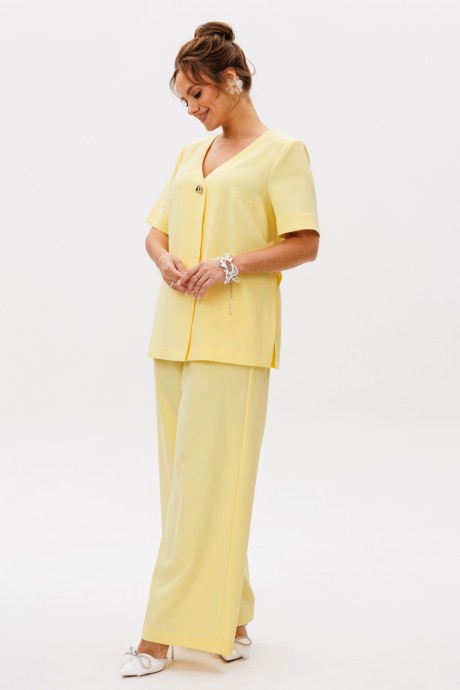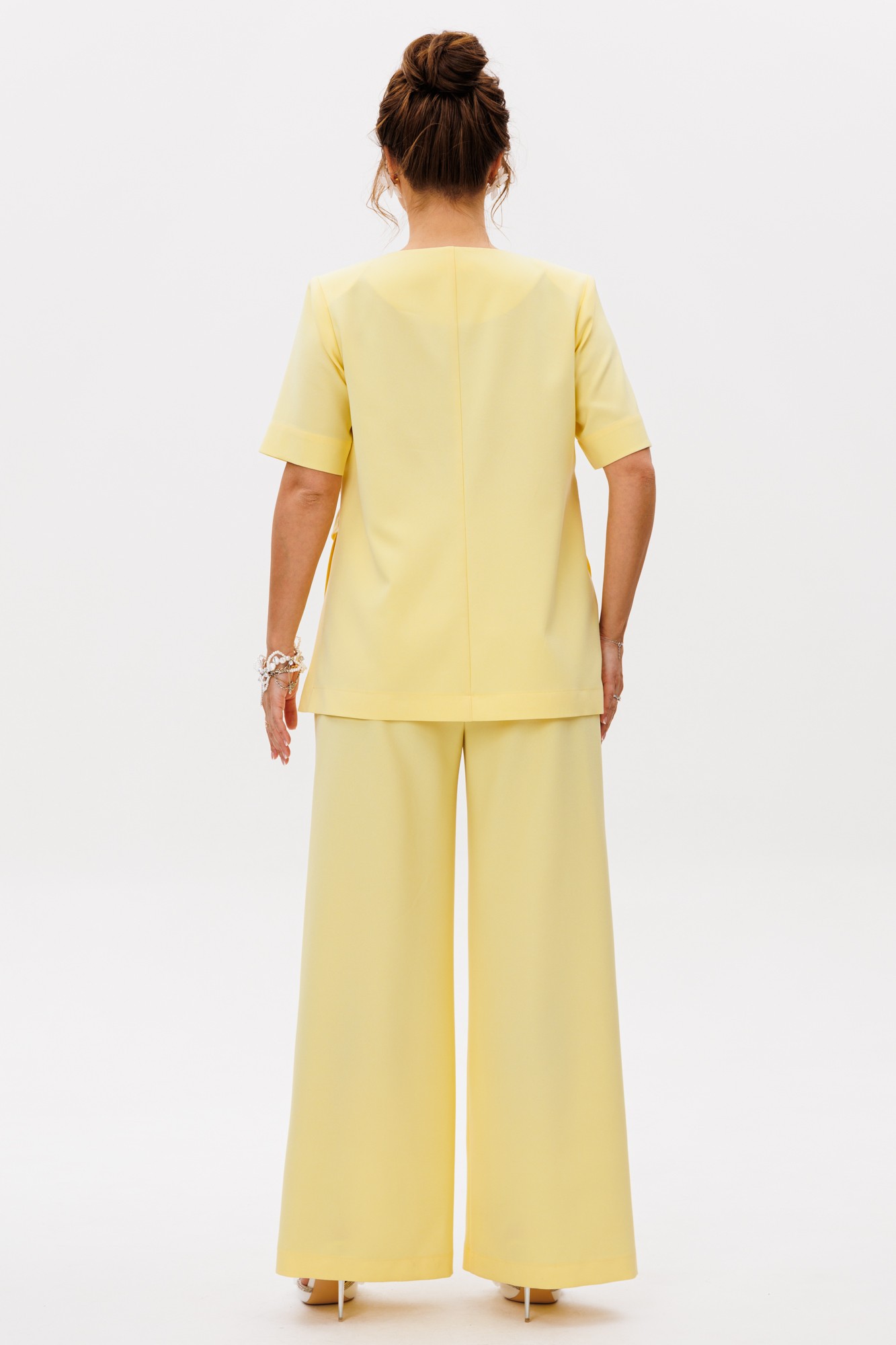 Стильный женский костюм, состоящий из жакета и брюк. Жакет прямого силуэта без подкладки. По переду нагрудные вытачки. По спинке средний шов. По боковым швам – шлицы. Горловина с V-образным вырезом. Застежка центральная на отделочную пуговицу и две пришивные кнопки. Рукава втачные одношовные. Жакет дополнен съемным поясом из основной ткани. Брюки свободного прямого кроя с высокой посадкой. В боковых швах функциональные карманы. Верхний срез оформлен поясом с эластичной резинкой.