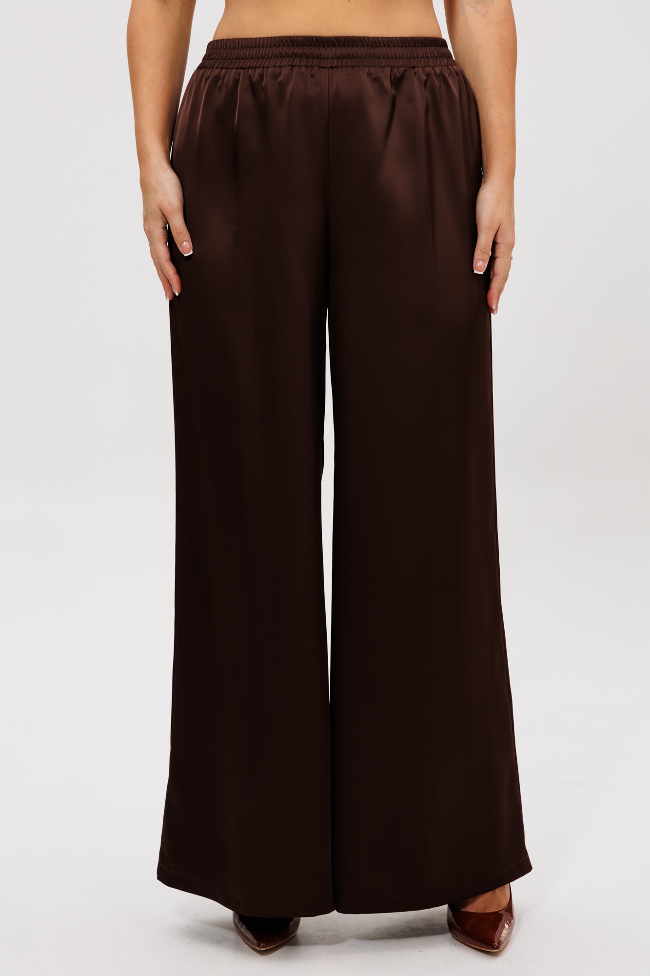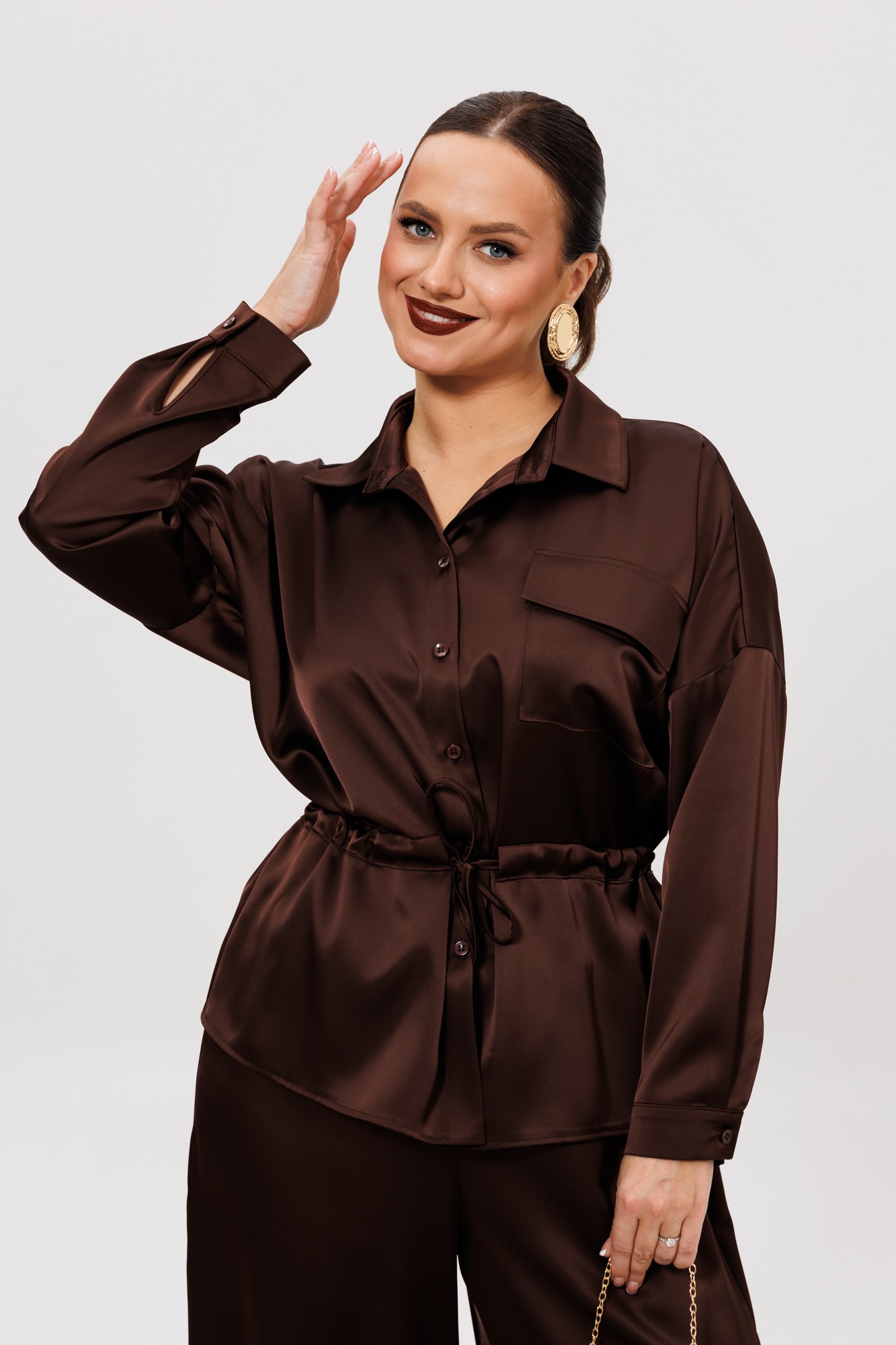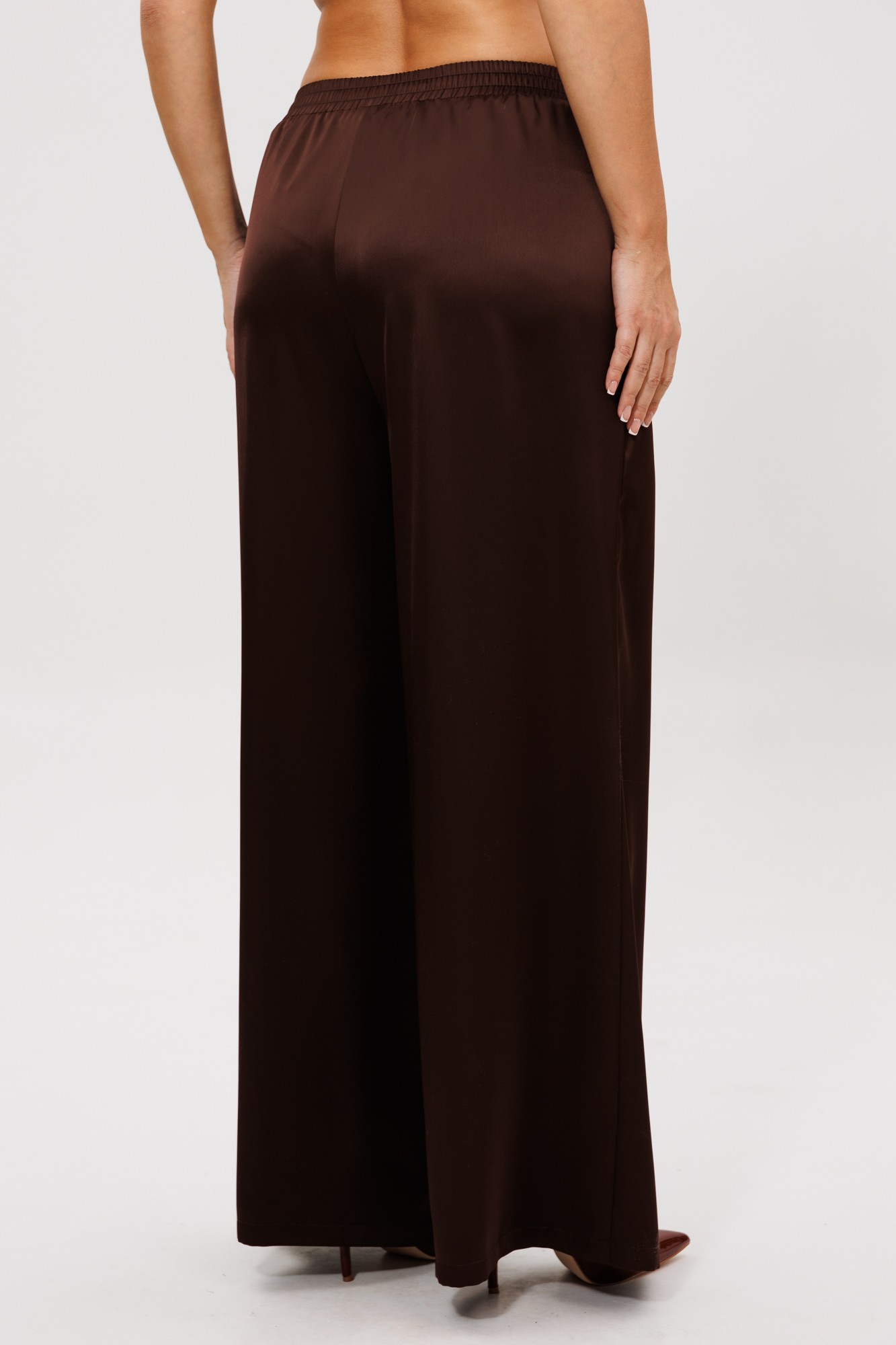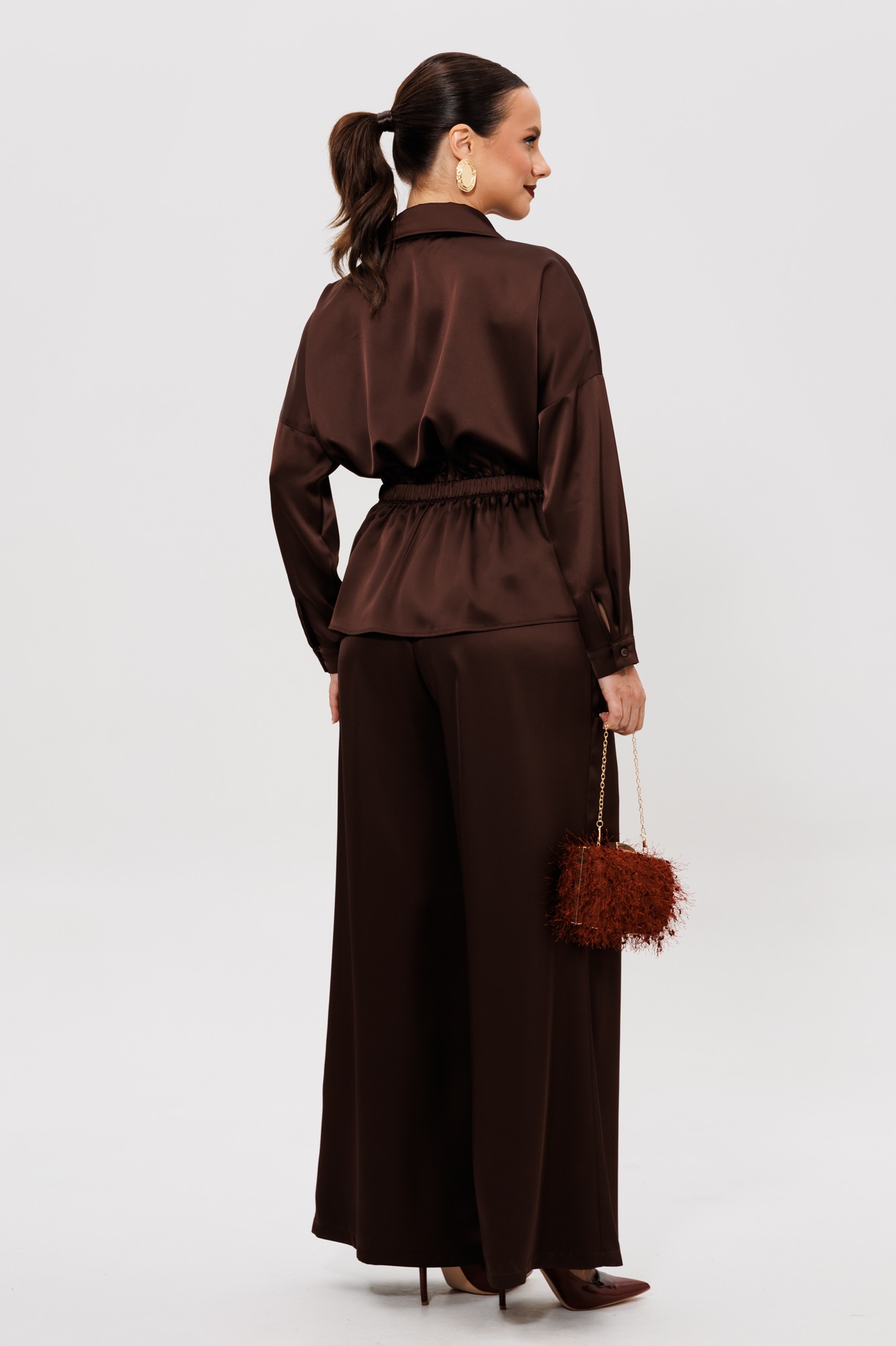 Нарядный брючный костюм, выполненный из струящегося шелка «Армани» (тянется). Блуза прямого силуэта со спущенной линией плеча. По переду накладной карман с клапаном (по правой части переда), центральная застежка на петли-пуговицы, надстрочные кулисы со шнуром. Спинка цельная с надстрочной кулисой, присборенная резинкой. Горловина оформлена воротником рубашечного типа со стойкой. Рукава одношовные с притачной манжетой, застегивающейся на пуговицы. Брюки свободного прямого кроя с высокой посадкой. Верхний срез оформлен поясом с эластичной резинкой.