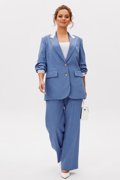 Жакет полуприлегающего силуэта, выполнен из костюмной ткани (не тянется) с отделкой из довяза на подкладке. Перед с нагрудными вытачками и надстрочными клапанами. Застежка центральная на петли-пуговицы. Горловина оформлена воротником пиджачного типа с лацканом. Спинка со средним швом. Рукава втачные, двухшовные с мягкими складками и манжетой из довяза. Брюки свободного прямого кроя с высокой посадкой из костюмной ткани (тянется). В боковых швах функциональные карманы. По срезу банта – застежка-молния. Верхний срез оформлен поясом с эластичной резинкой по задней половинке.