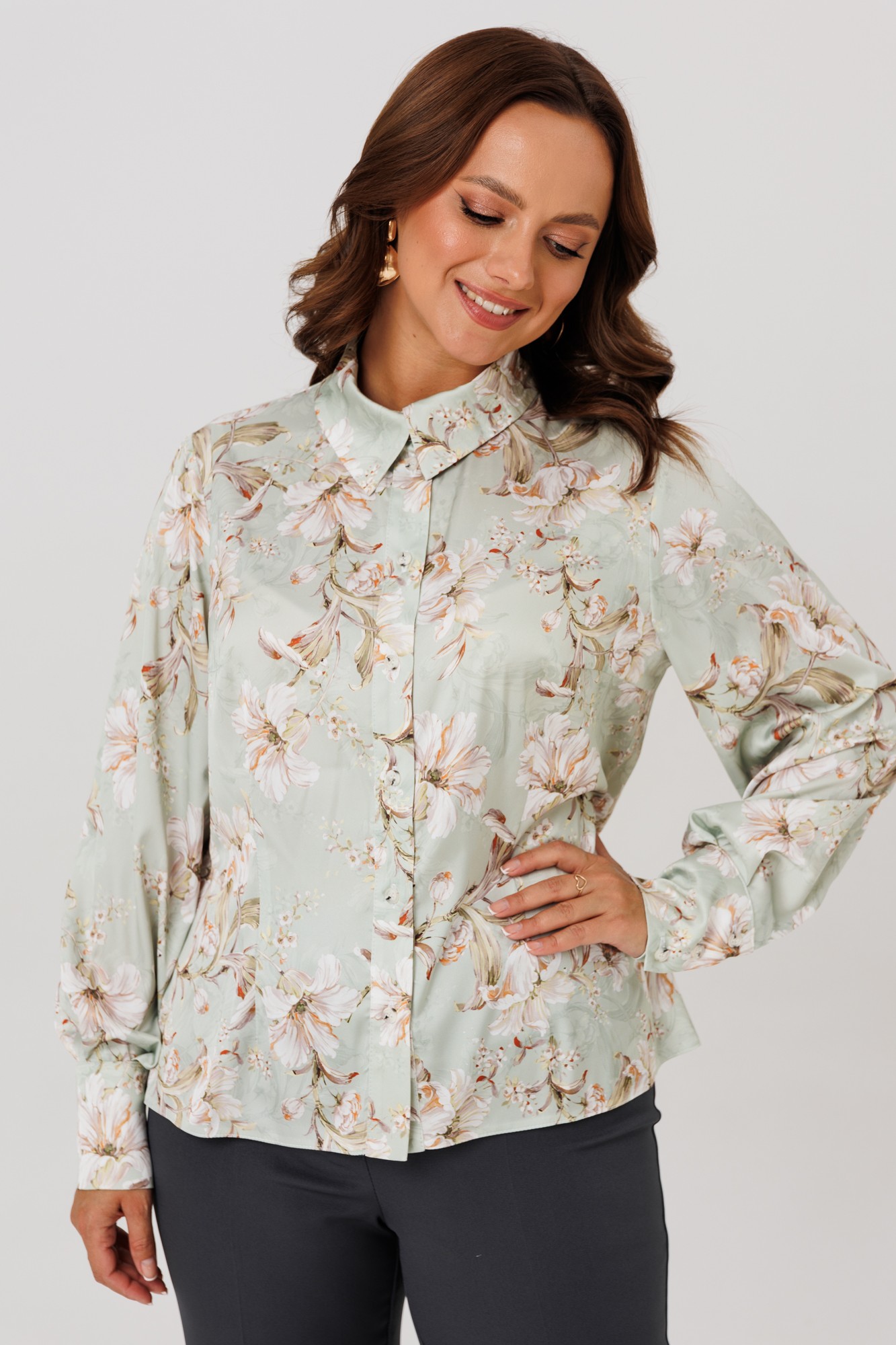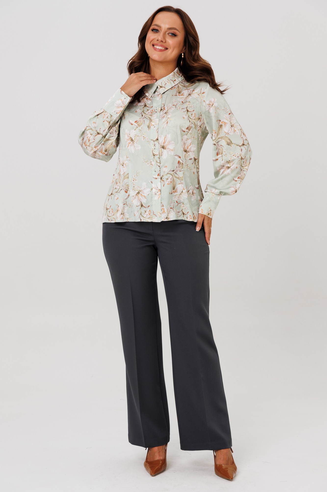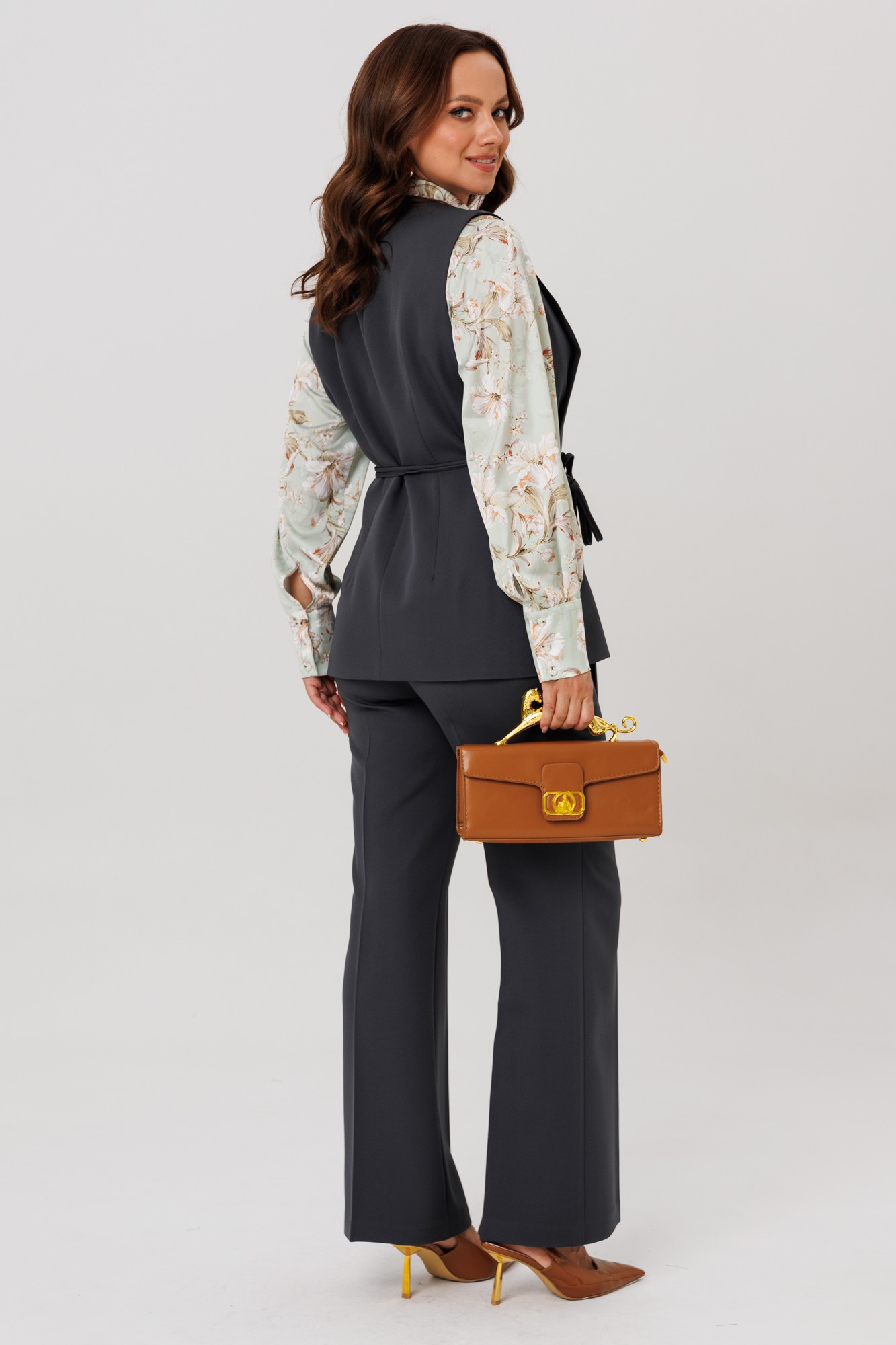 Комплект женский, состоящий из жилета, блузы и брюк. Жилет полуприлегающего силуэта выполнен из костюмной ткани (тянется), на подкладке. По переду рельефные швы, застежка на потайные пуговицы. Горловина оформлена V- образным вырезом с ассиметричным отложным краем борта. По спинке таллиевые вытачки. В комплект входит пояс с декоративной цепочкой. Жилет без карманов. Блуза полуприлегающего силуэта, выполнена из хлопка (чуть тянется). По переду нагрудные вытачки, центральная застежка на петли-пуговицы. По спинке таллиевые вытачки. Горловина оформлена рубашечным воротником со стойкой. Рукава втачные, одношовные со складками и притачной манжетой по низу, застегивающейся на пуговицы. Брюки с высокой посадкой, расширенные от колена к низу, выполнены из костюмной ткани (тянется). По срезу банта-застежка-молния. Верхний срез оформлен поясом с эластичной резинкой по задней половинке. Брюки без карманов.