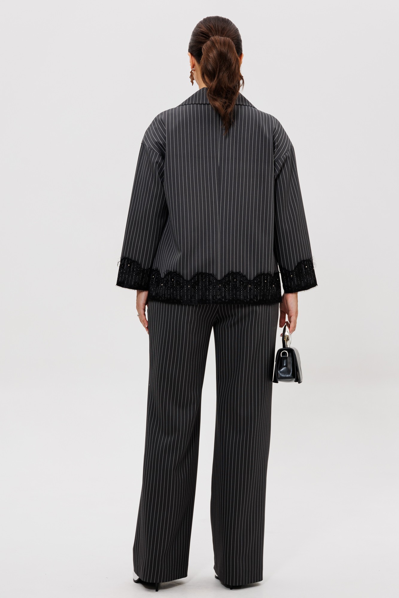 Жакет прямого силуэта со спущенной линией плеча, выполнен из костюмной ткани в тонкую полоску (чуть тянется). По переду нагрудная вытачка, центральная застежка на одну петлю и пуговицу. Горловина оформлена воротником пиджачного типа с лацканом. Спинка со средним швом. Рукава одношовные, длиной 7/8. Жакет без подкладки. Жакет декорирован по низу и по низу рукавов французским кружевом со стразами.