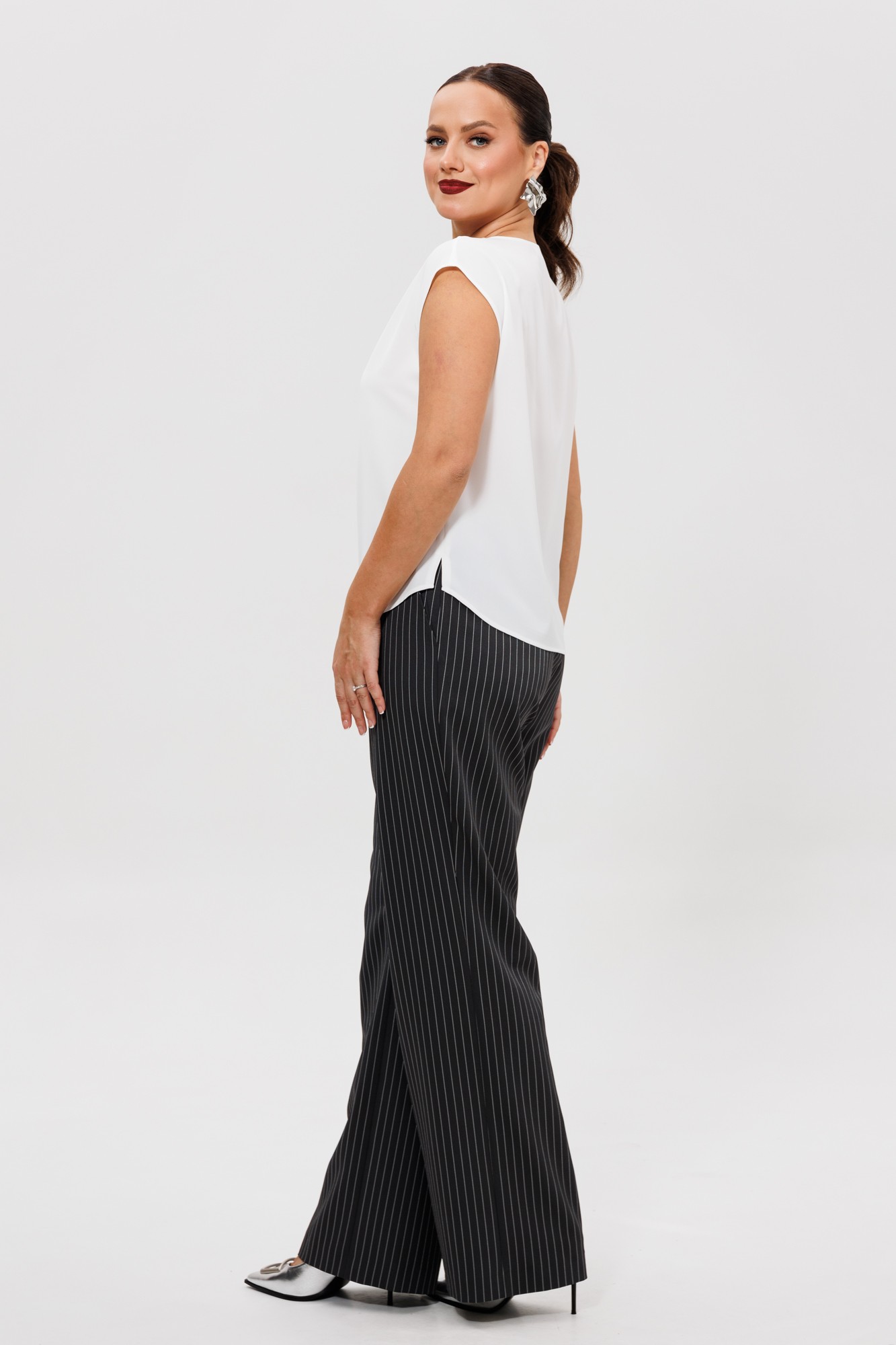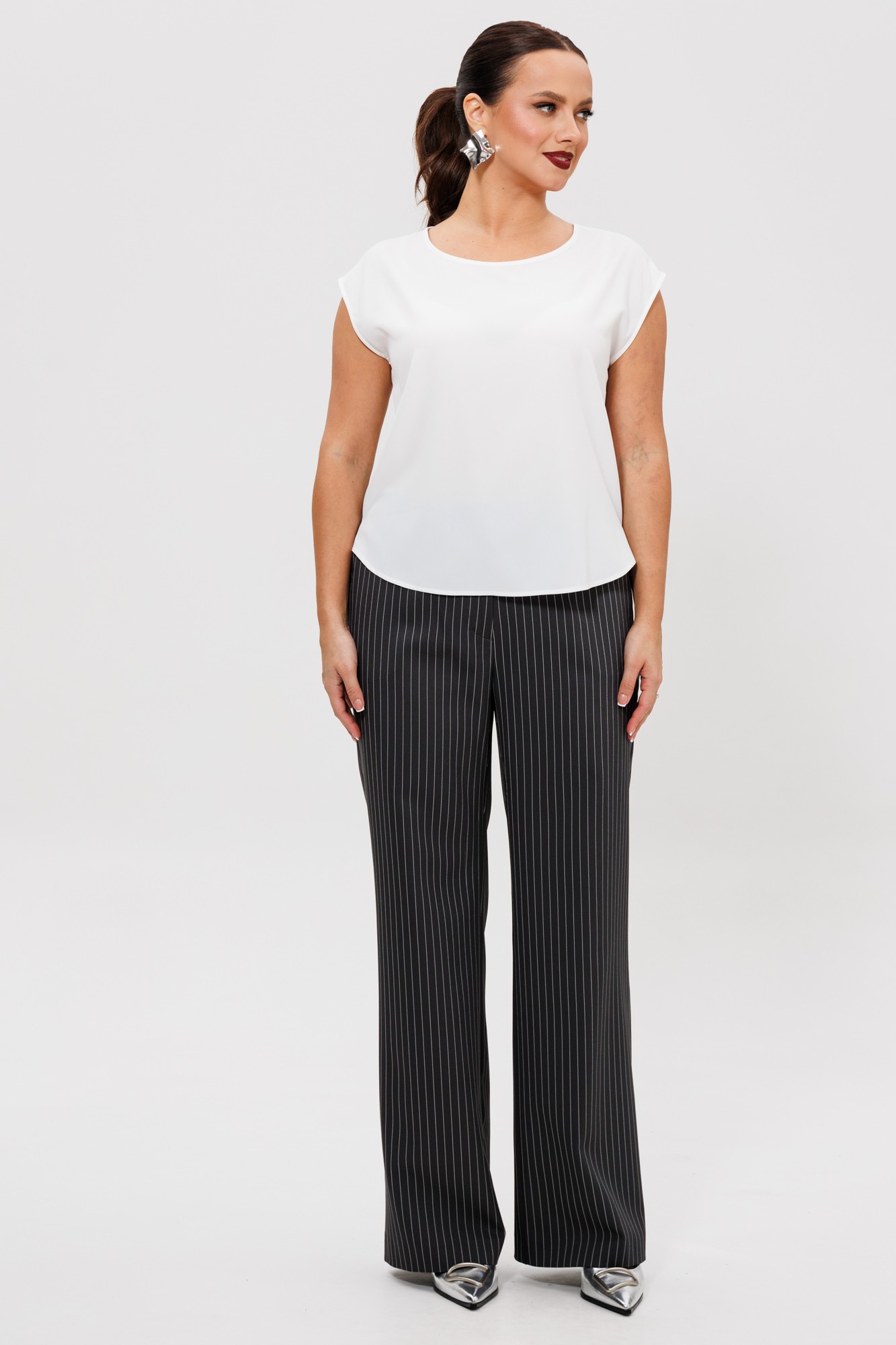 Брюки прямого кроя с высокой посадкой, выполненные из костюмной ткани в тонкую полоску (чуть тянется) с наклонными карманами в боковых швах. По срезу банта застежка-молния. Верхний срез оформлен поясом с эластичной резинкой по задней половинке.