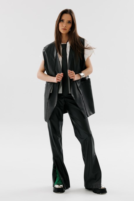 Костюм трёхпредметный: состоит из жилета, брюк и галстука. Жилет двубортный прямого кроя объёма оверсайз. Застёжка фигурная на кнопки. Карманы - листочки. Галстук классический на резинке. Брюки клёш немного зауженные к линии колена и прямые от линии колена. На передних и задних половинках талиевые вытачки. Пояс притачной. Снизу в боковых швах расположены высокие шлицы.